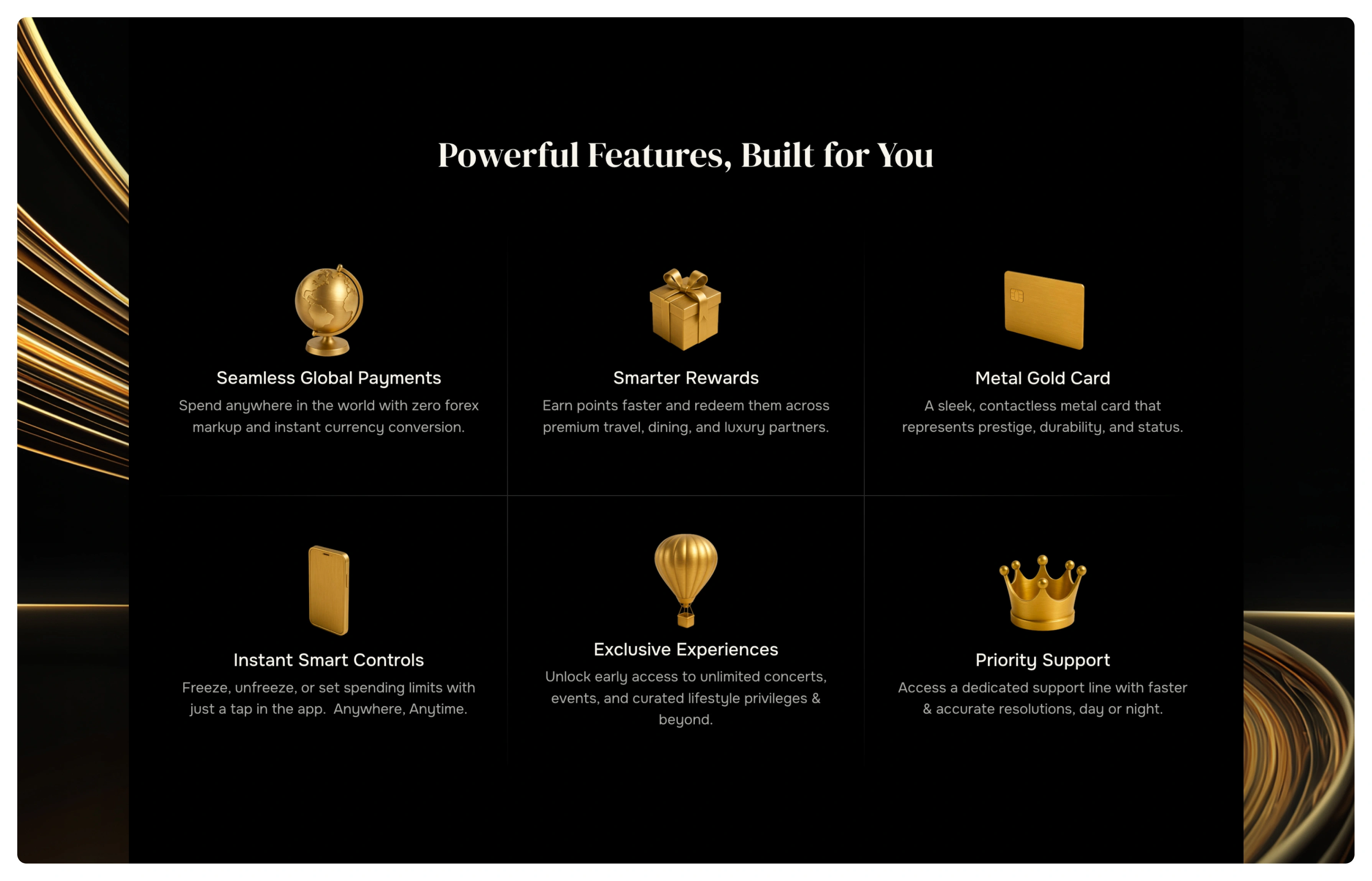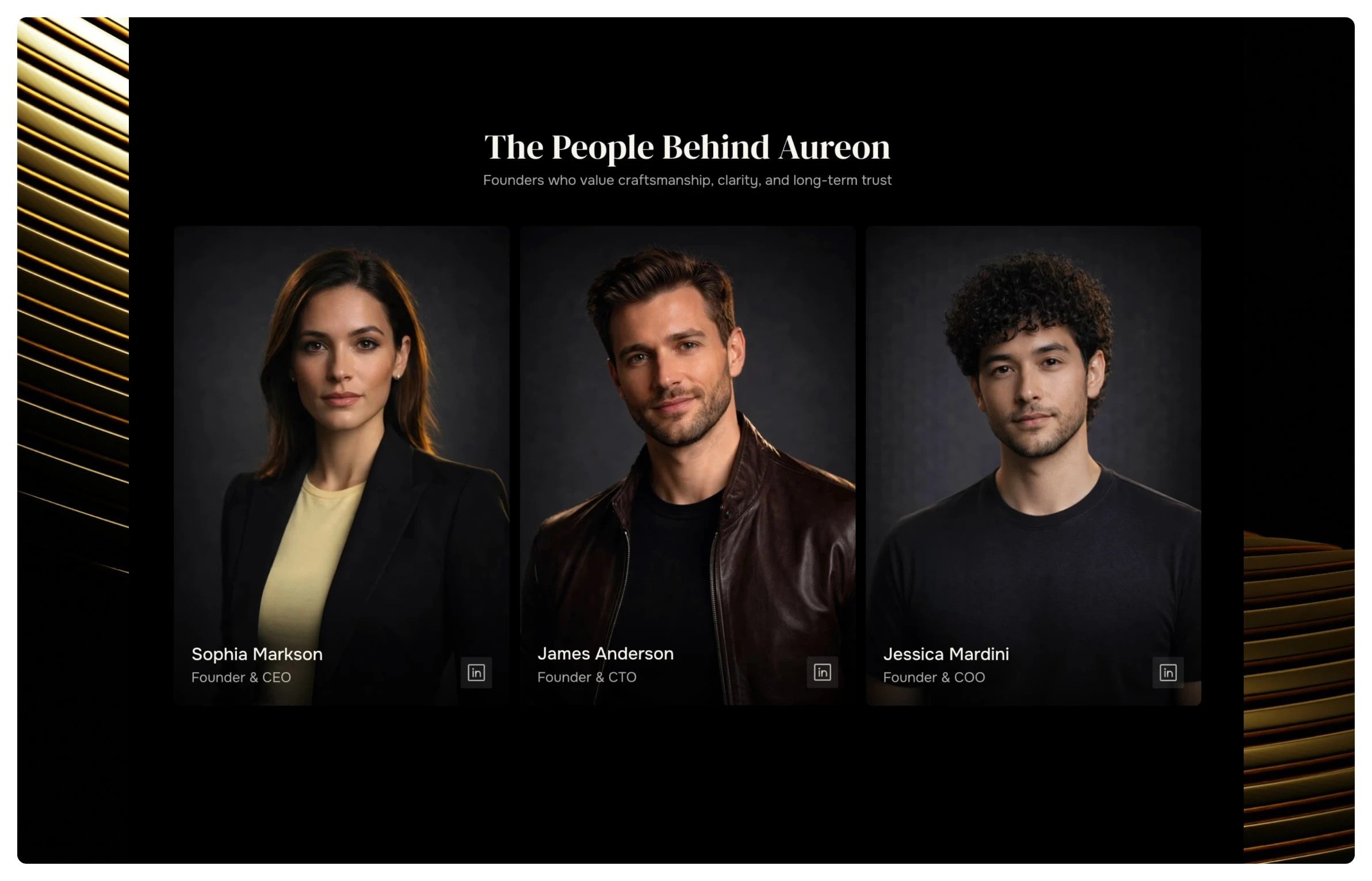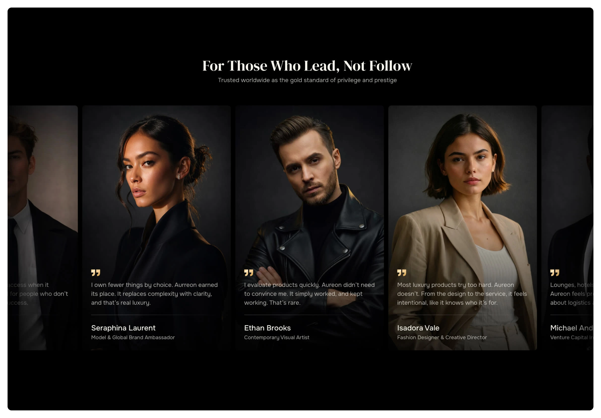 In shaping the brand and website, this philosophy translated into a rich visual system anchored in deep grey-black tones contrasted with refined gold accents. The dark foundation establishes depth, power, and sophistication, while gold introduces warmth, prestige, and a sense of rarity. Generous negative space, disciplined typography, and controlled motion create a composed and immersive experience. Each interaction is intentional, reinforcing a feeling of exclusivity and polish. The result is a digital presence that does not simply communicate luxury, but embodies it through every visual and experiential detail.