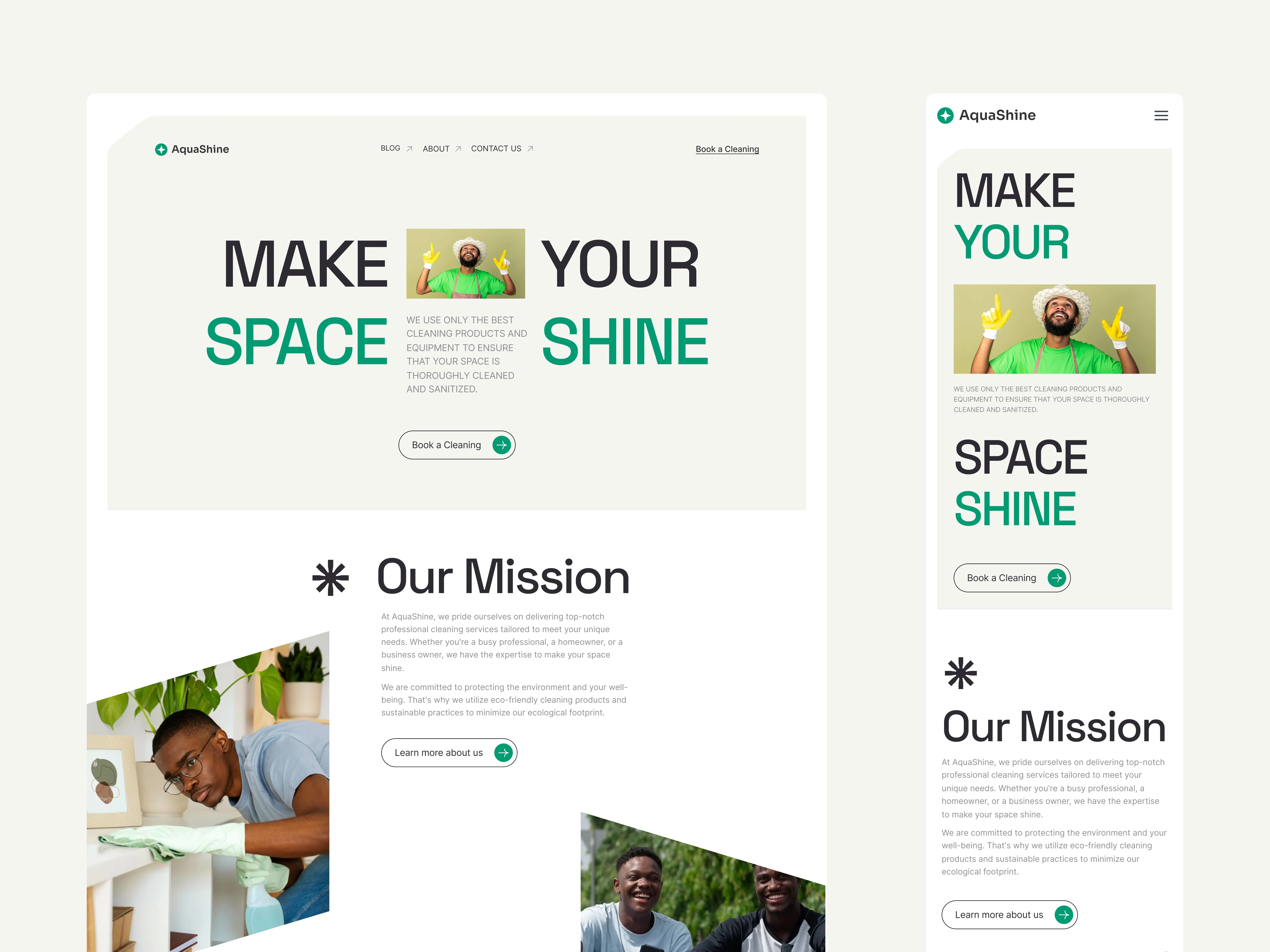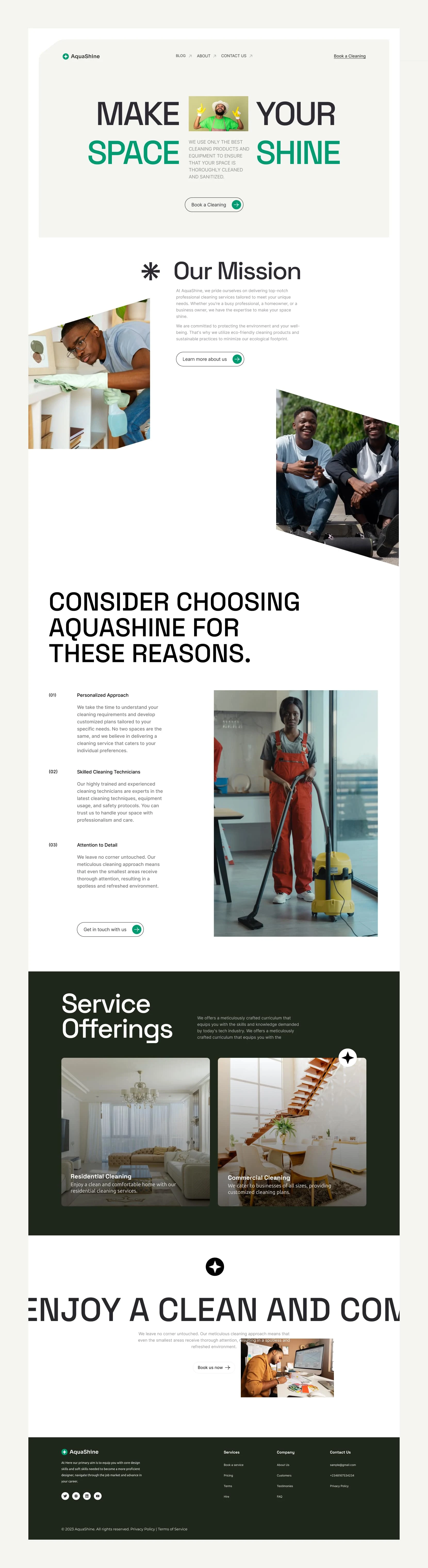 I designed a compelling landing page highlighting AquaShine’s key services, customer trust (via testimonials), and easy contact options.