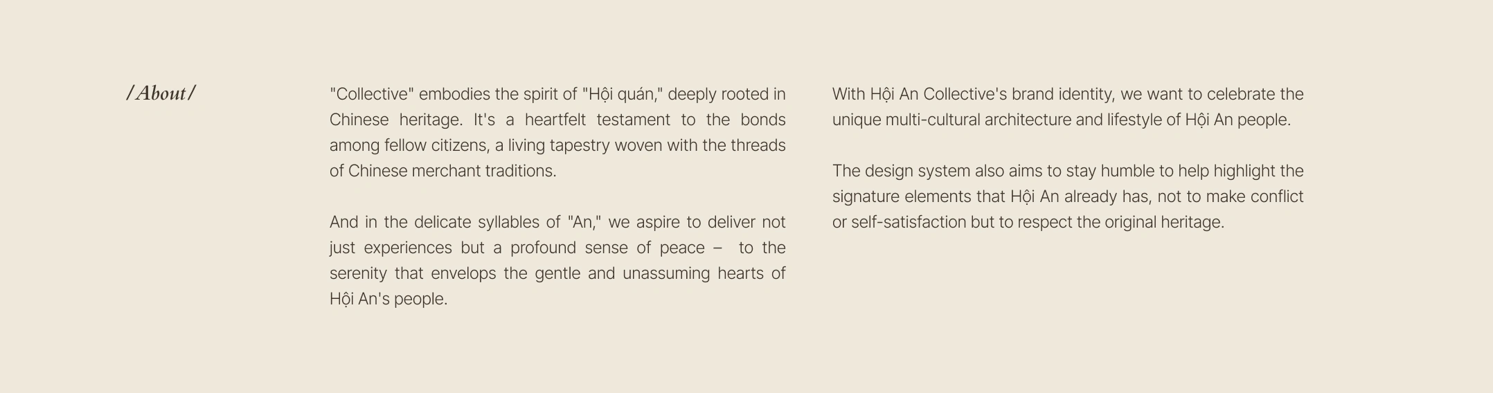 With Hội An Collective's brand identity, we want to celebrate the unique multi-cultural architecture and lifestyle of Hội An people.
