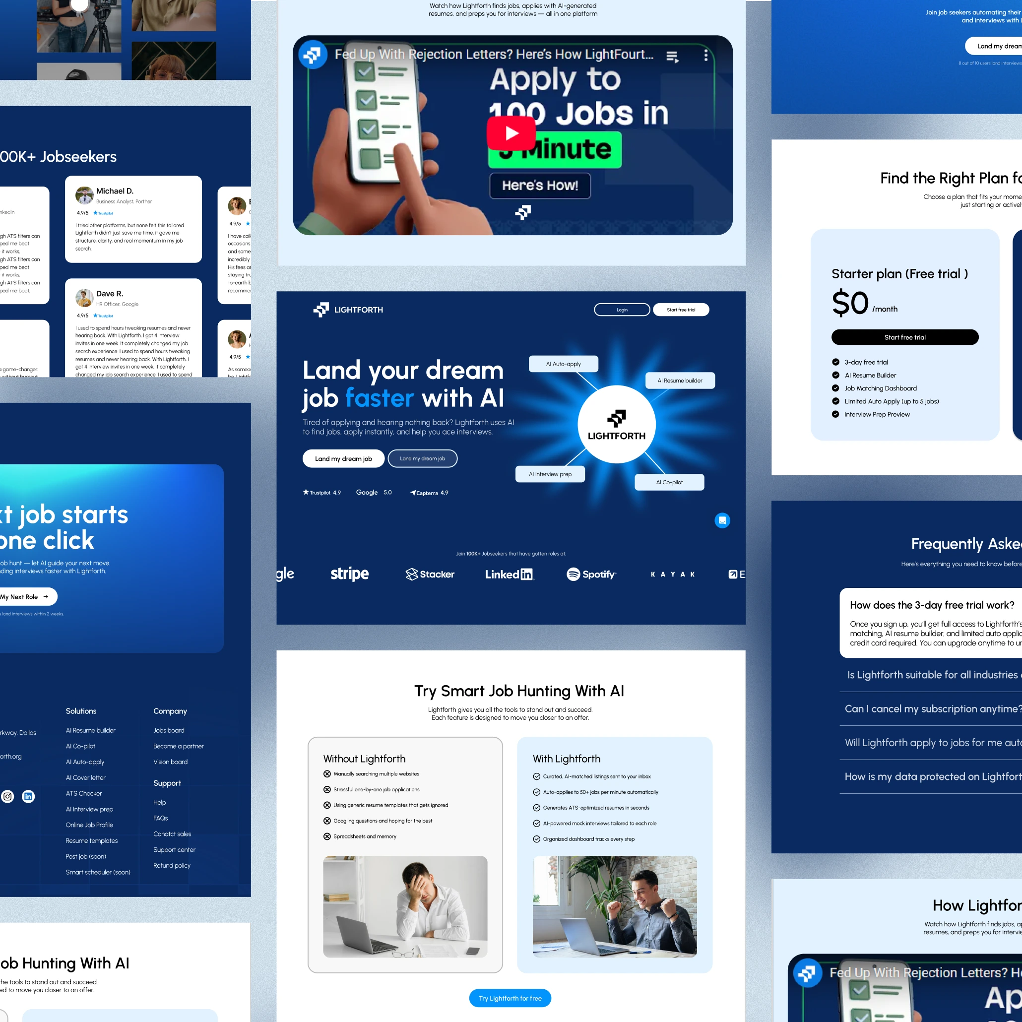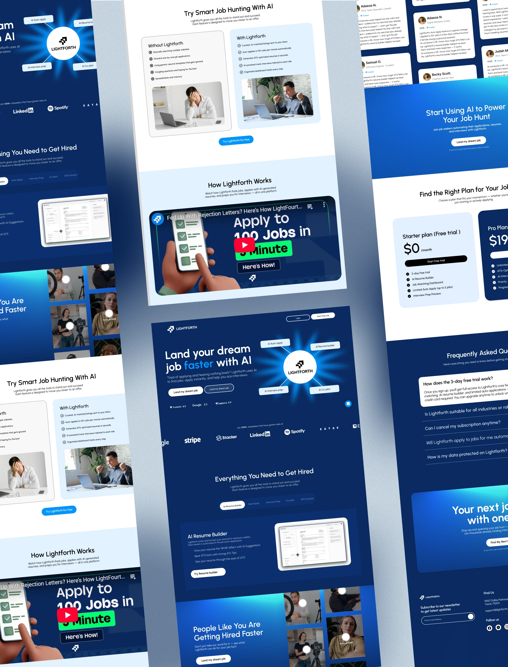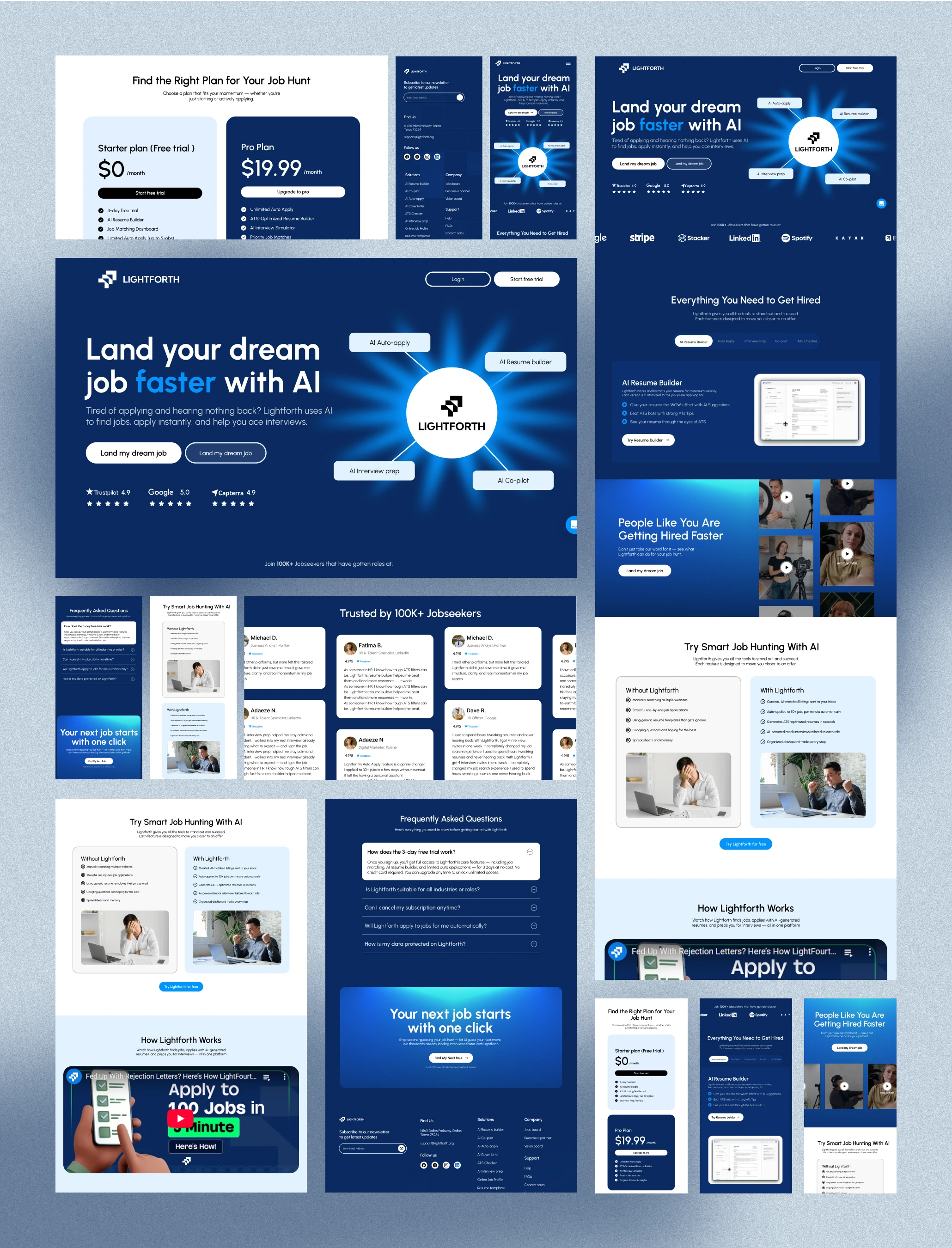 The final landing page delivers a smooth and persuasive journey for job seekers—balancing education, trust, and action. It establishes Lightforth as a credible, empowering platform while showcasing AI as a practical partner in the hiring journey. The design is conversion-driven, ensuring more users are convinced to sign up and take their next career step.
