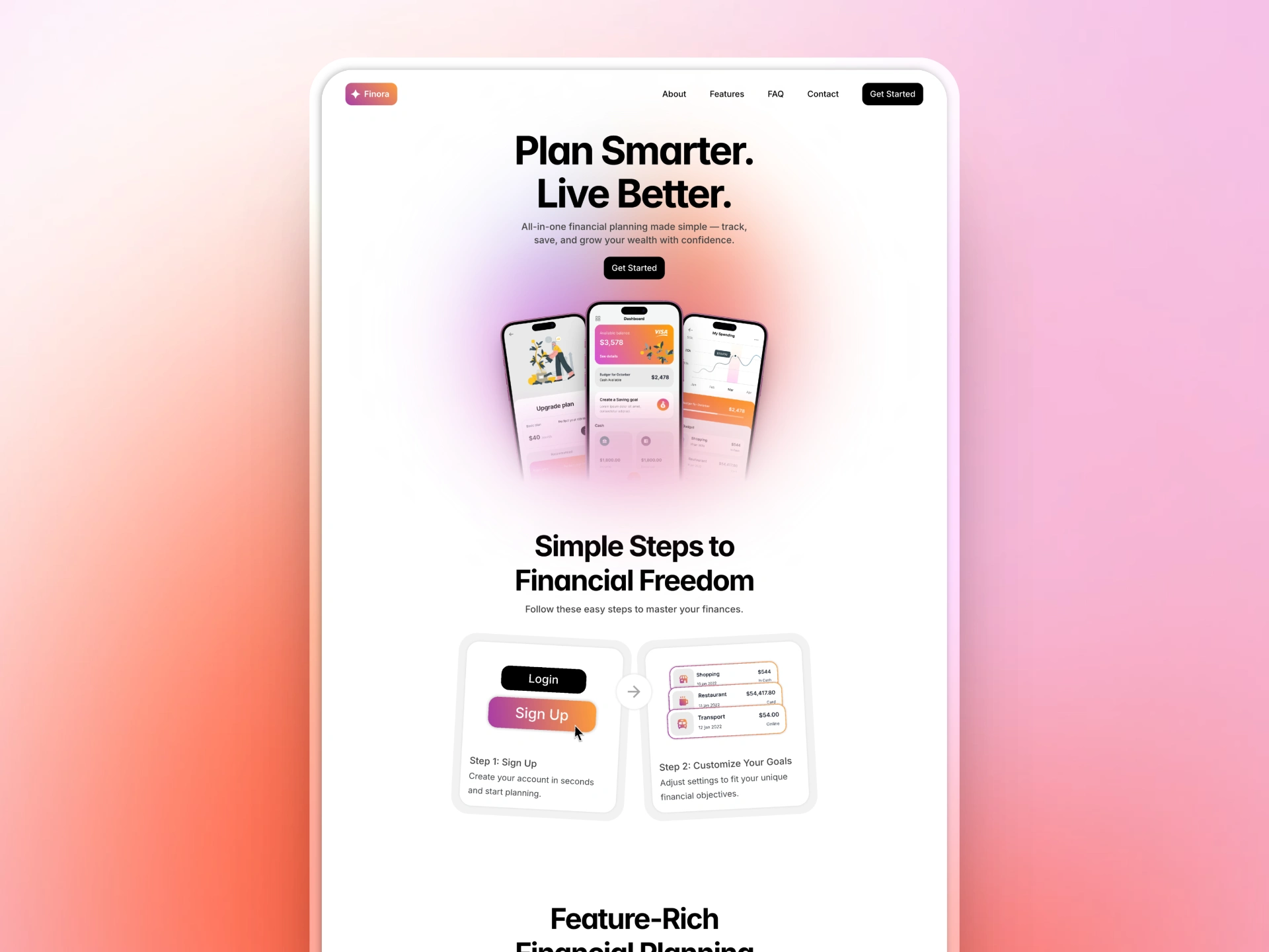 I designed and built Finora’s landing page to present a modern, trustworthy image for a financial planning SaaS platform. The page highlights Finora’s key features — budgeting tools, goal tracking, and secure data management — through a clean layout, soft gradients, and clear typography.