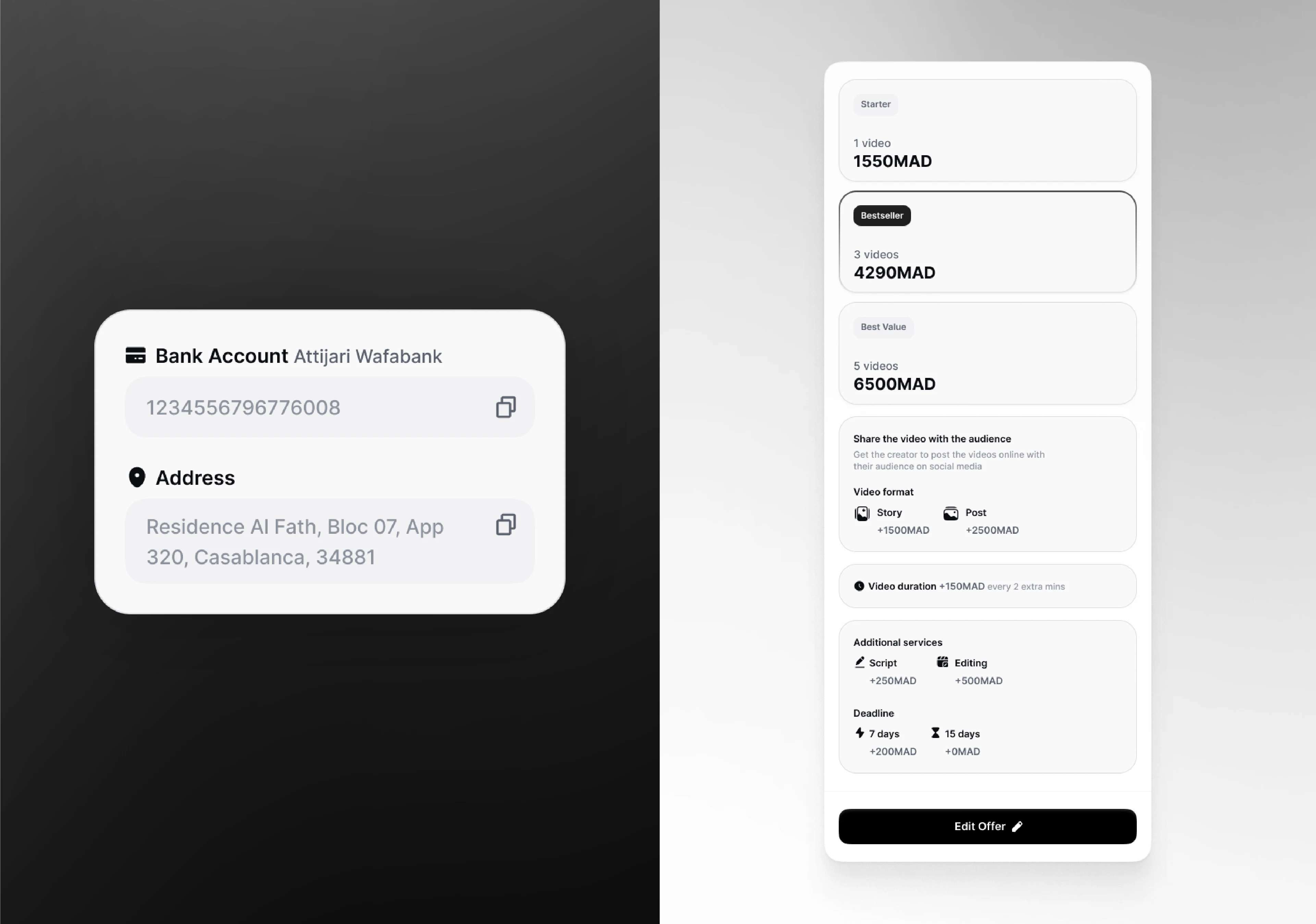 The rise of e-commerce in Morocco has created a massive demand for authentic, localized User-Generated Content (UGC). However, brands currently face an inefficient, fragmented process: discovering reliable creators, vetting their quality, managing communication, and handling payments is a high-friction, high-risk challenge. For creators, the process is equally broken, often plagued by unclear expectations, scope creep, and payment insecurity.