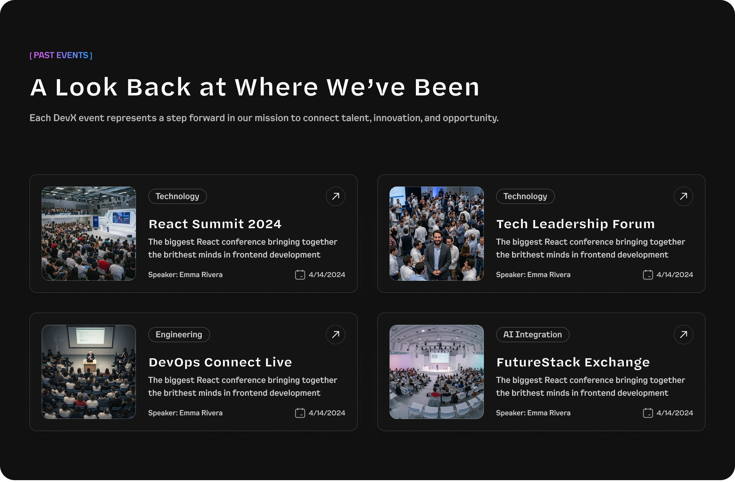 At devX, I worked on creating a new section of their website dedicated to showcasing events and meetups organized for the developer community. The page highlights both upcoming and past events, helping the company better engage with their audience.