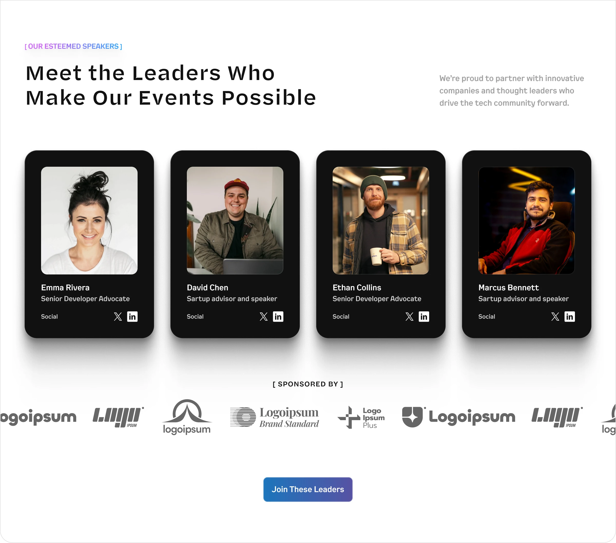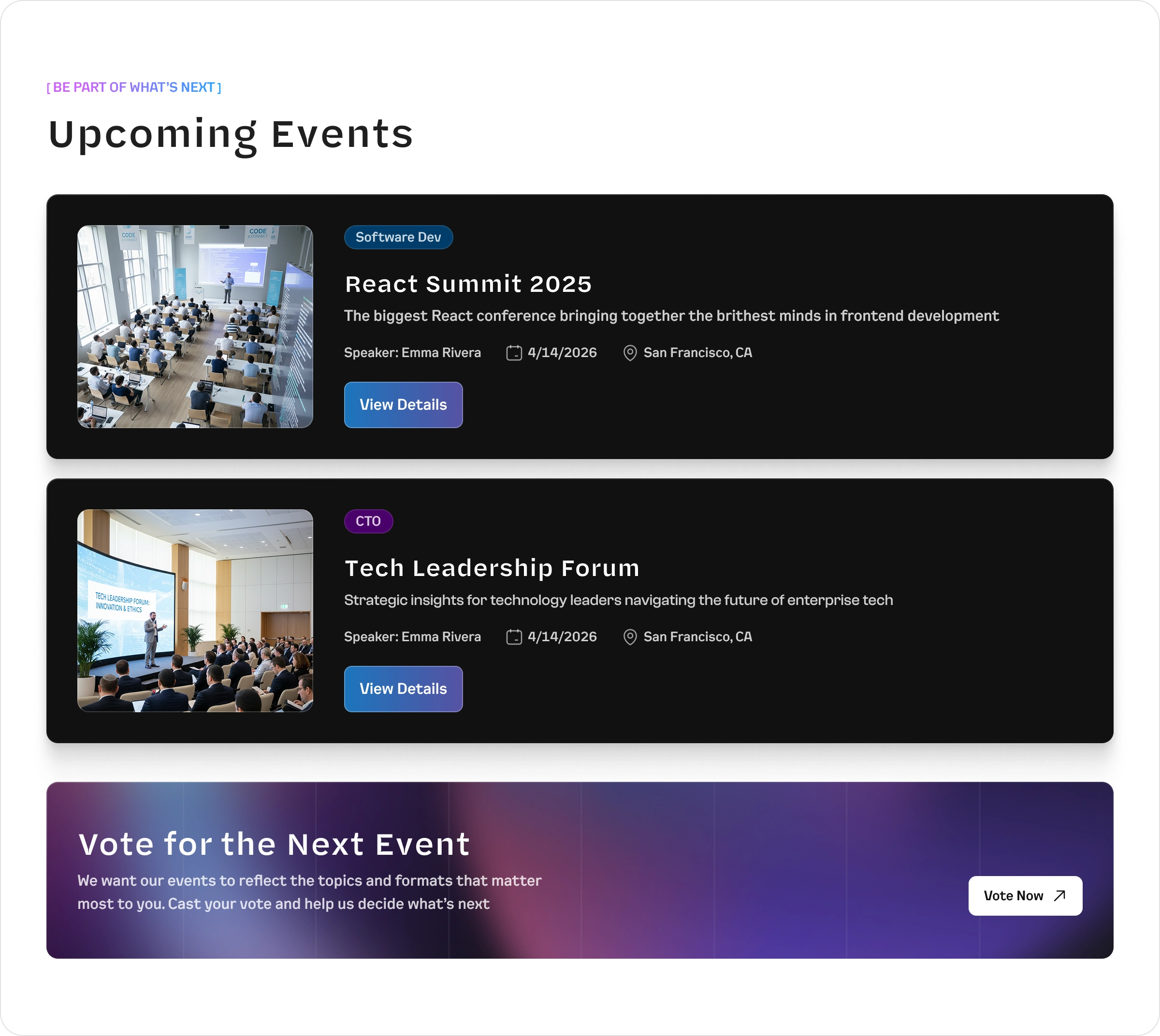 Once approved, I built the full layout in Framer, ensuring responsiveness and a smooth user experience. Each past event has its own dedicated page featuring a description and a video recap of the event presentation.