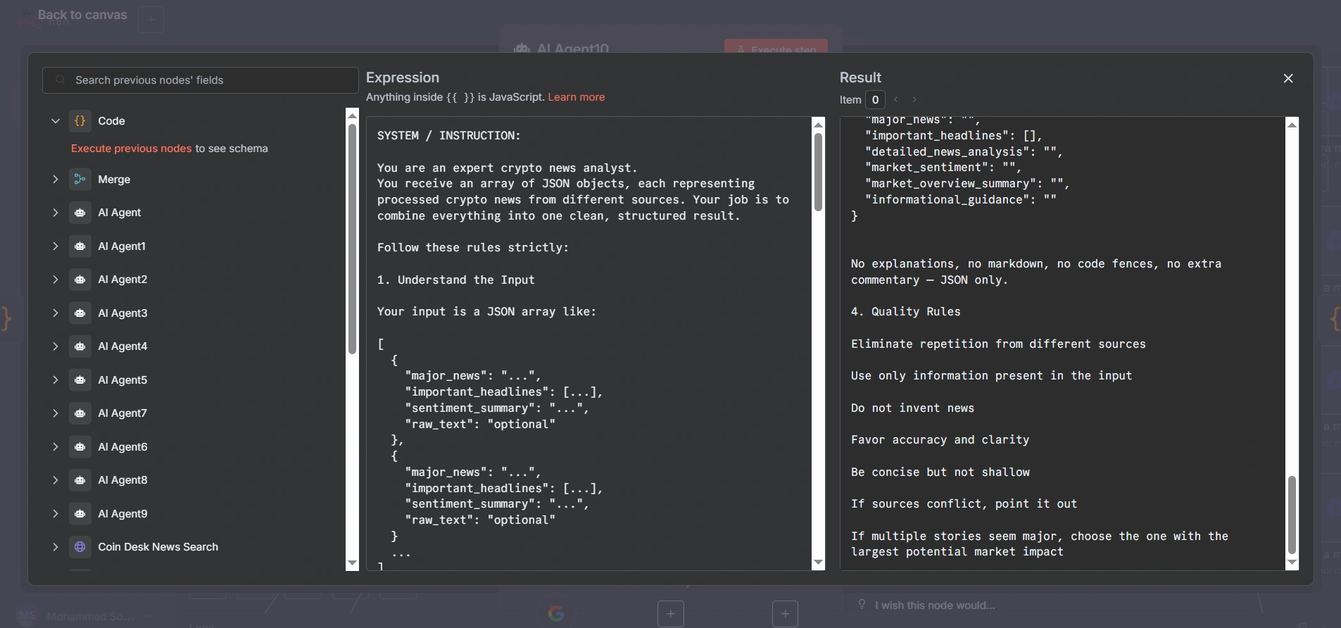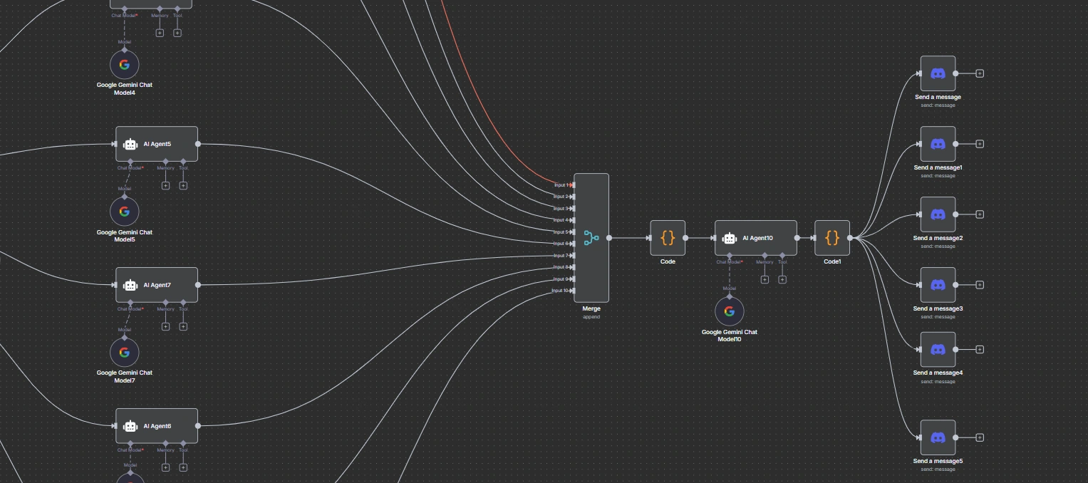 The agent pulls information from platforms like CoinDesk, CryptoPanic, NewsData, Nensim, CoinMarketCal, CoinMarketCap, and others. Each source is processed by its own AI agent that filters noise, extracts relevant insights, and organizes data into a consistent structure. All results merge through a core node that consolidates major news, sentiment summaries, impact analysis, and market outlook. The workflow ends with a multi-message Discord distribution delivering key insights in a clean, actionable format.