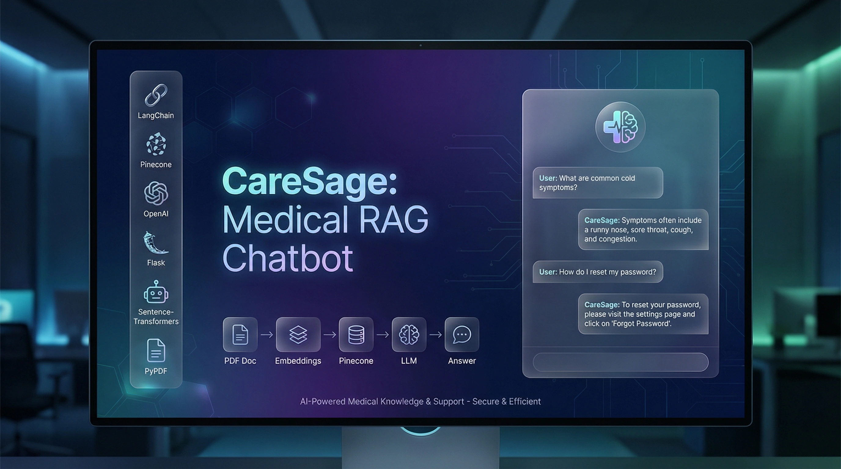 Built CareSage, a Retrieval-Augmented Generation (RAG) medical chatbot that answers user questions using knowledge pulled from PDF documents instead of guessing. The app ingests PDFs with PyPDF, chunks and embeds content using sentence-transformers, stores vectors in Pinecone, and retrieves the most relevant passages at query time. A LangChain pipeline then combines the retrieved context with an OpenAI LLM to generate grounded, helpful responses.