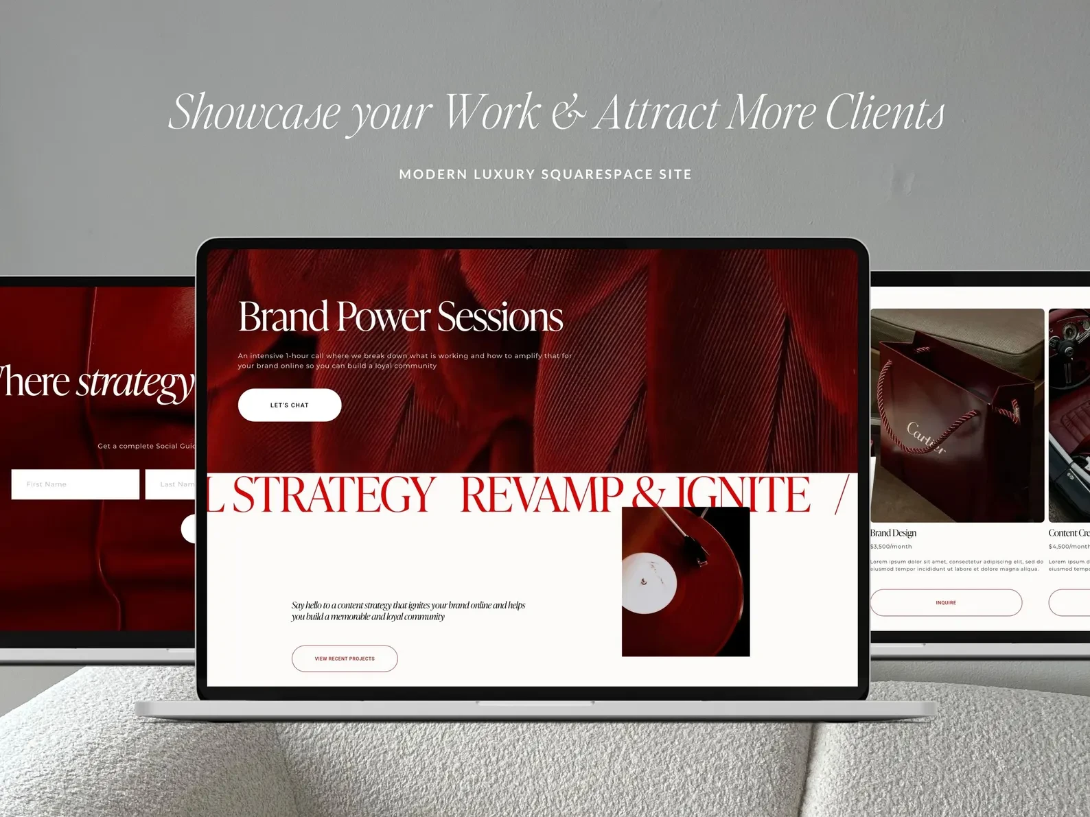 A deep red and neutral palette was chosen to evoke power, femininity, and confidence.