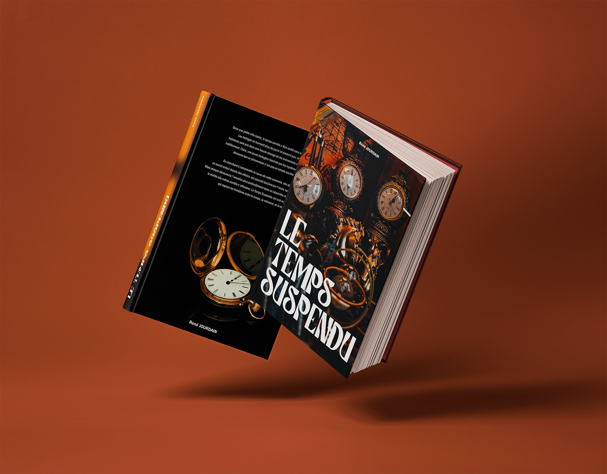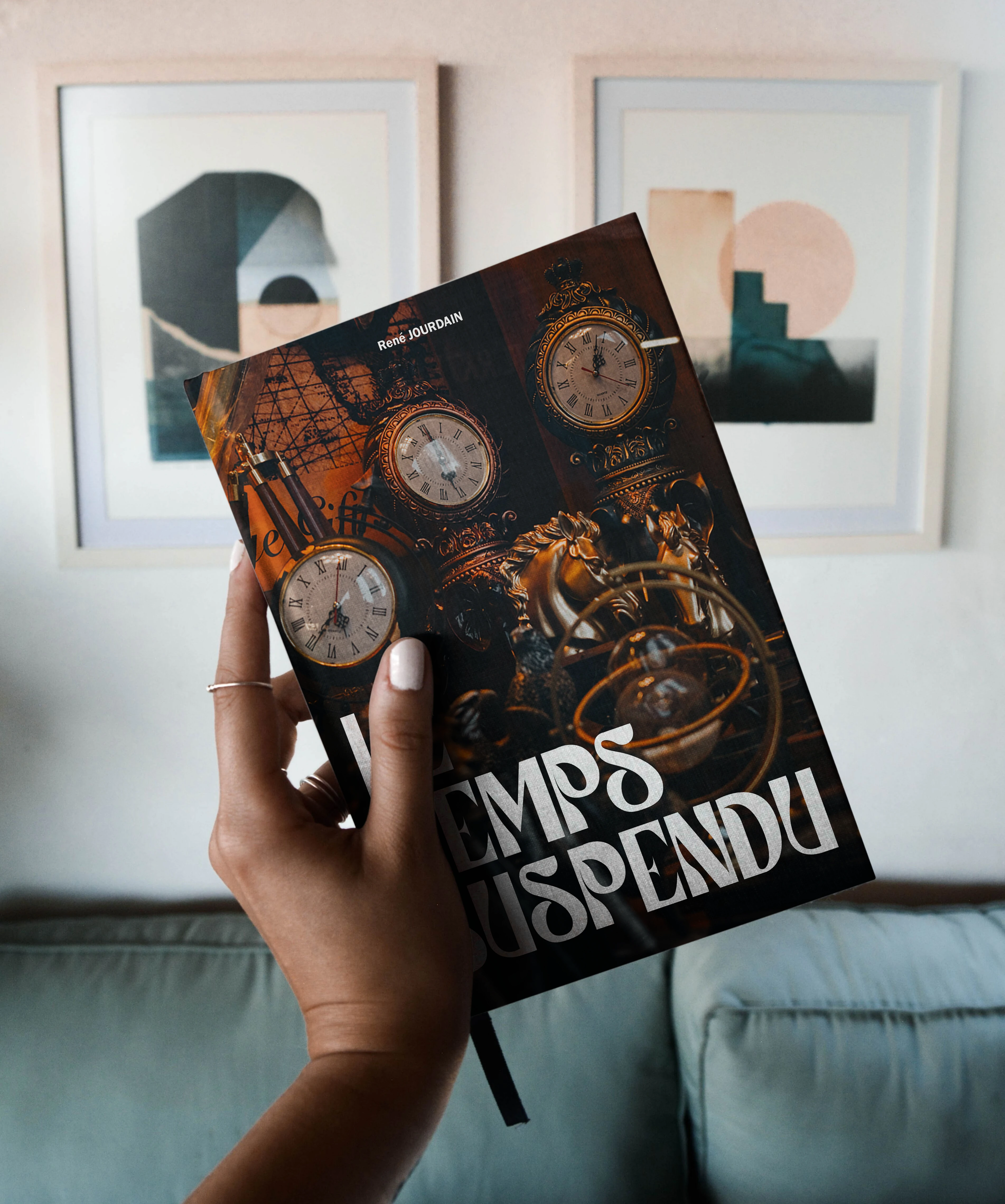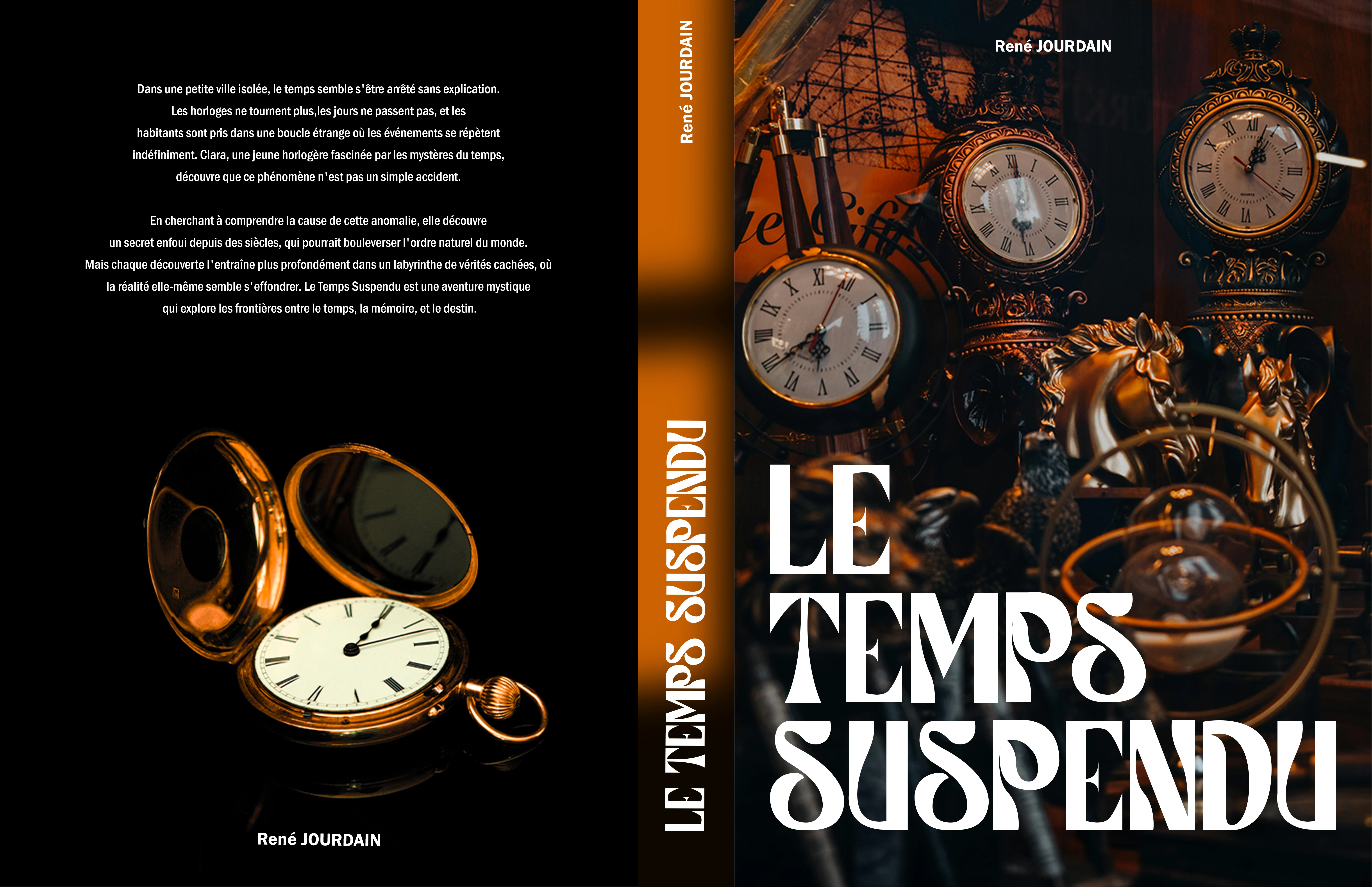 Cover design for Le Temps Suspendu, blending antique clocks and deep tones to reflect a mystical story where time, memory, and fate intertwine.