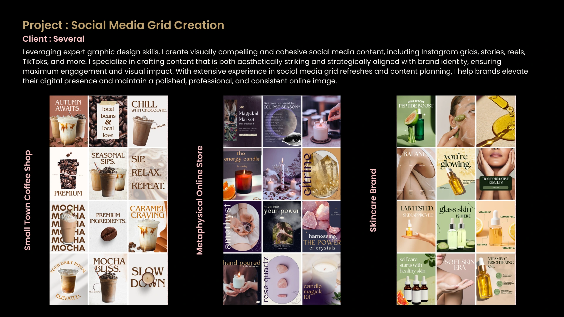 I help brands elevate their social presence through social media grid cleanup and design, creating visually engaging and aesthetic posts. I also handle content planning and creation, ensuring every post aligns with your brand and resonates with your audience.