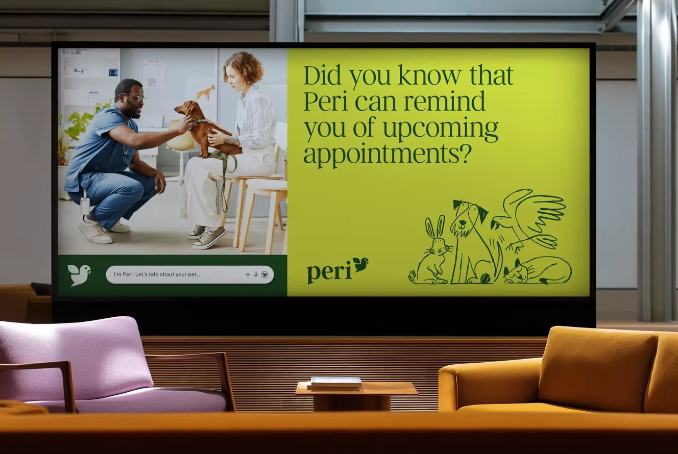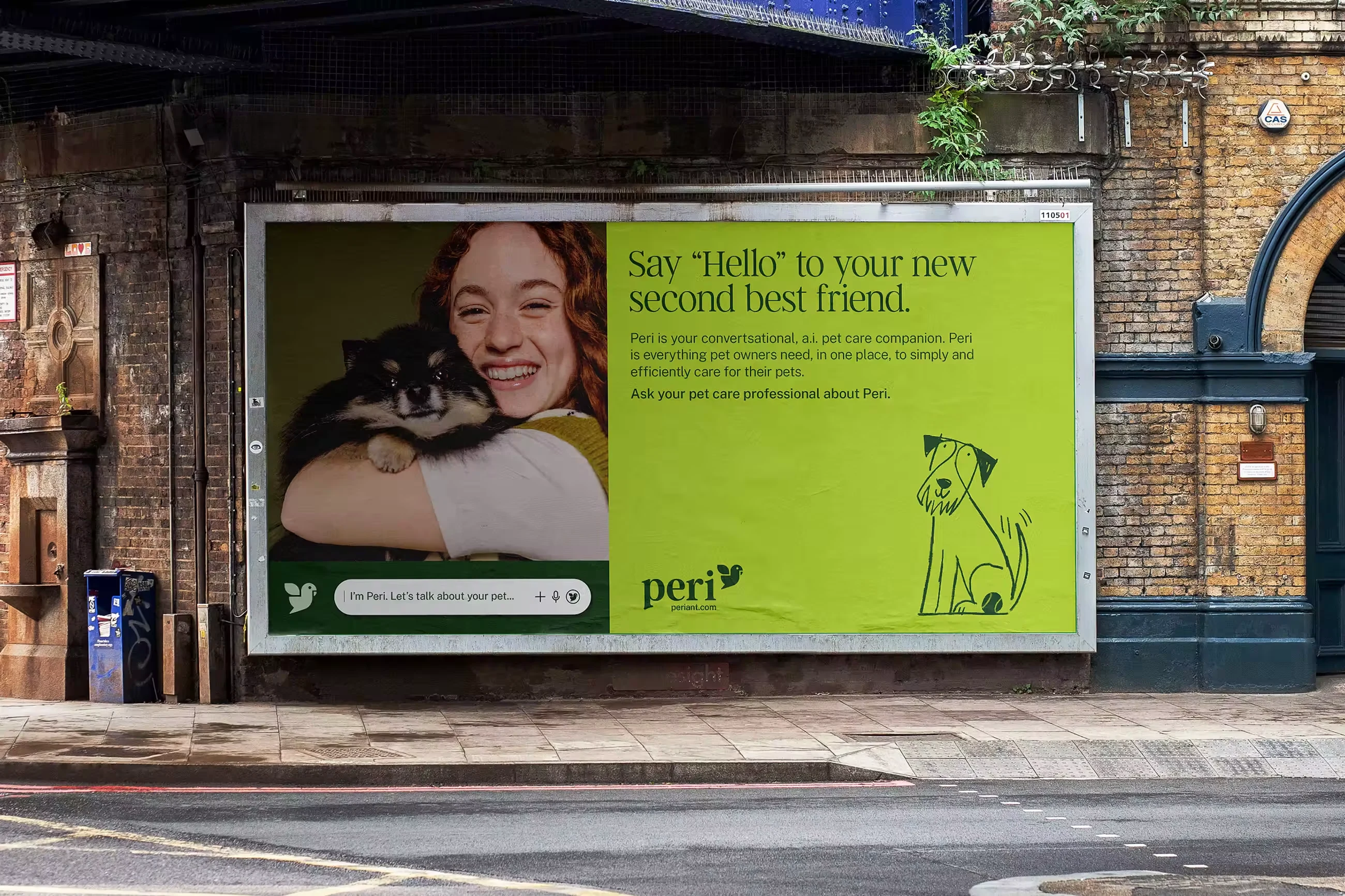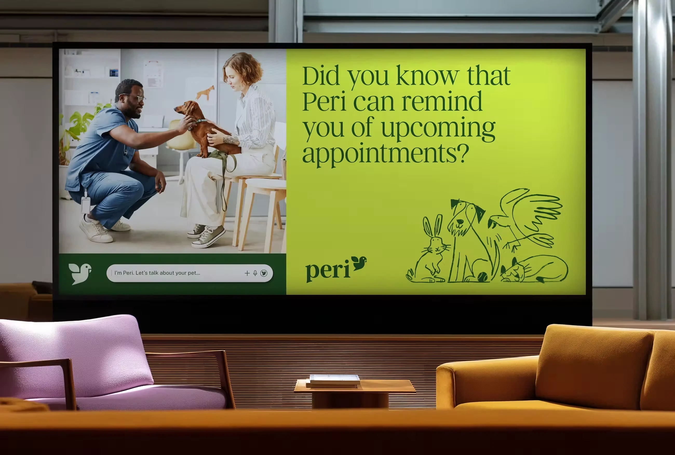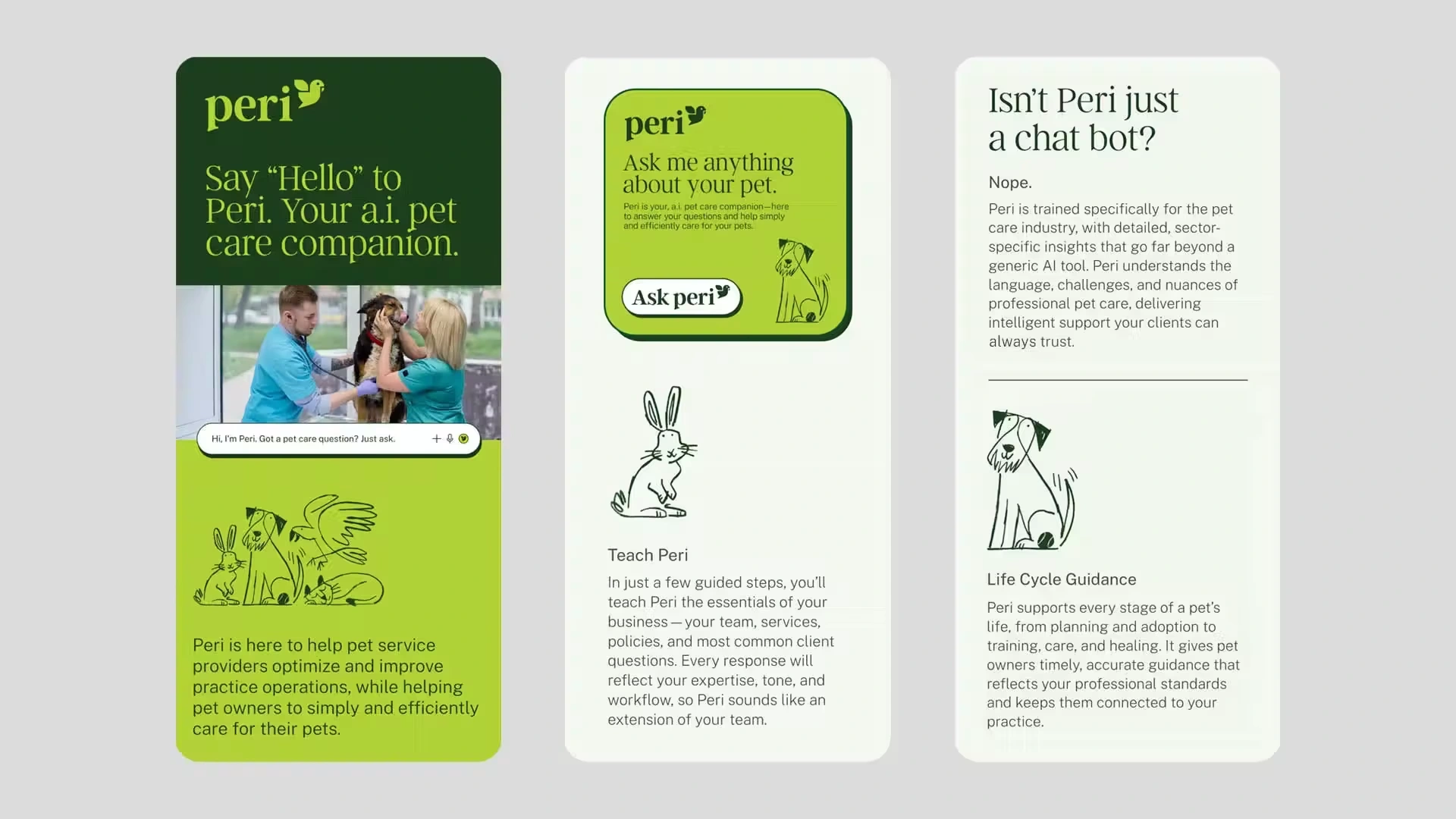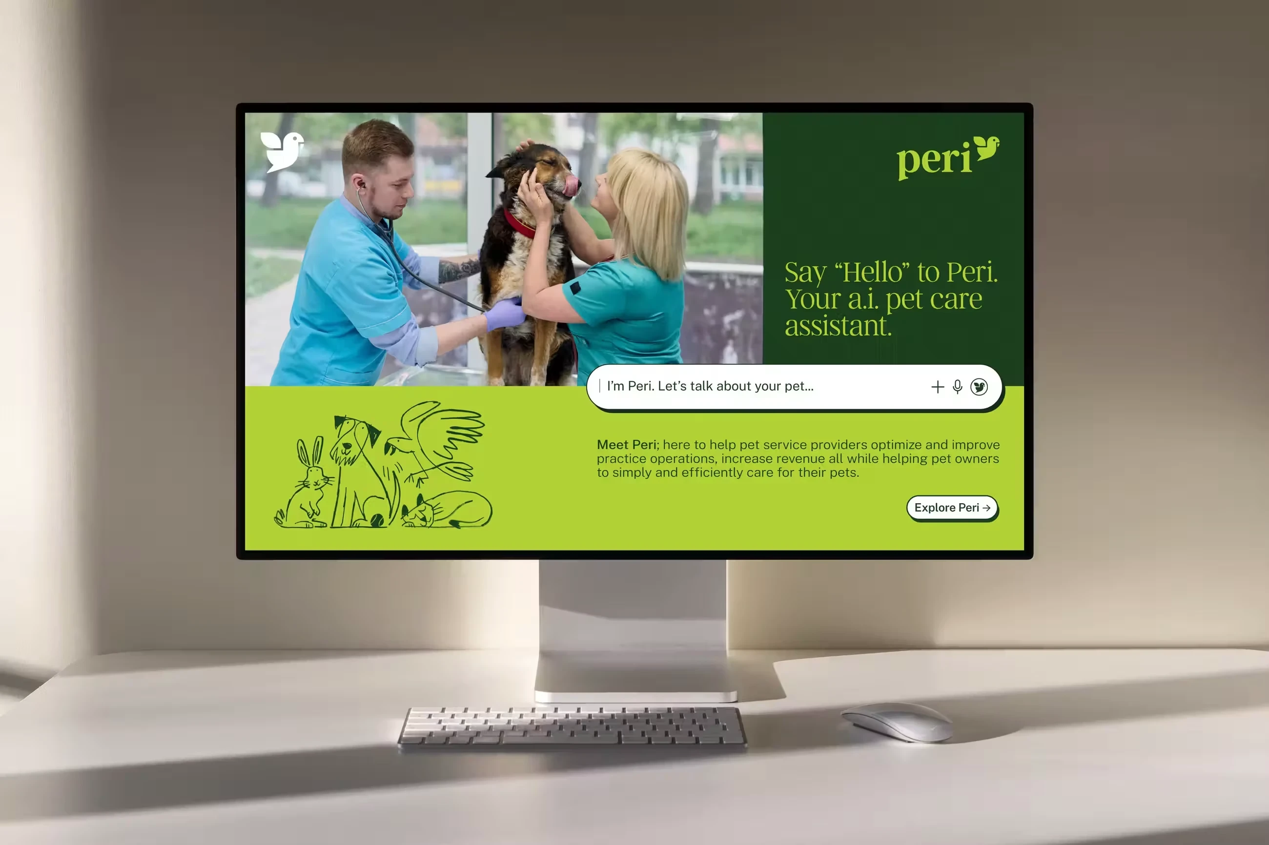 Developed by Periant, Peri is a conversational A.I. assistant designed to transform how pet care professionals and pet owners access information and support. The creative direction set out to humanize artificial intelligence; to make it feel trusted, intelligent, and genuinely helpful, without resorting to the typical visual language of tech and a.i.
