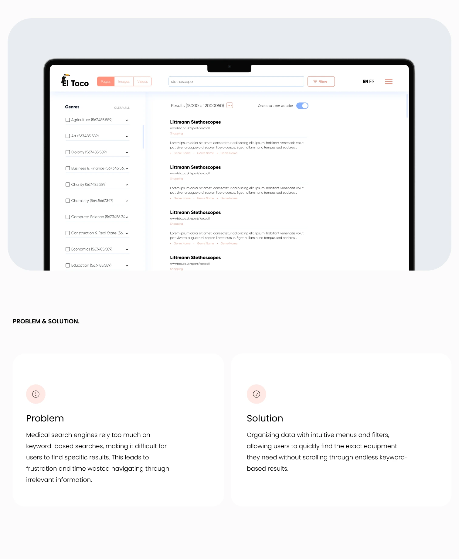 We designed a specialized search engine for medical equipment that stands out with its genre-based filtering system. This allows users to quickly narrow their …
