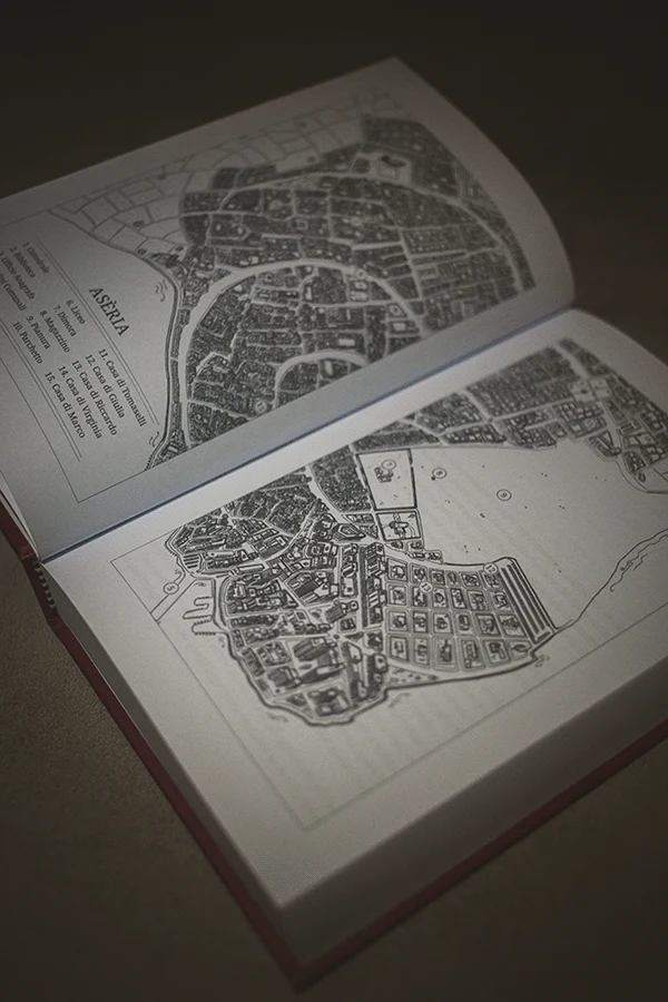 The opening pages of the book feature a detailed map of Asèria, the city where the story unfolds, highlighting its key landmarks and notable points of interest.