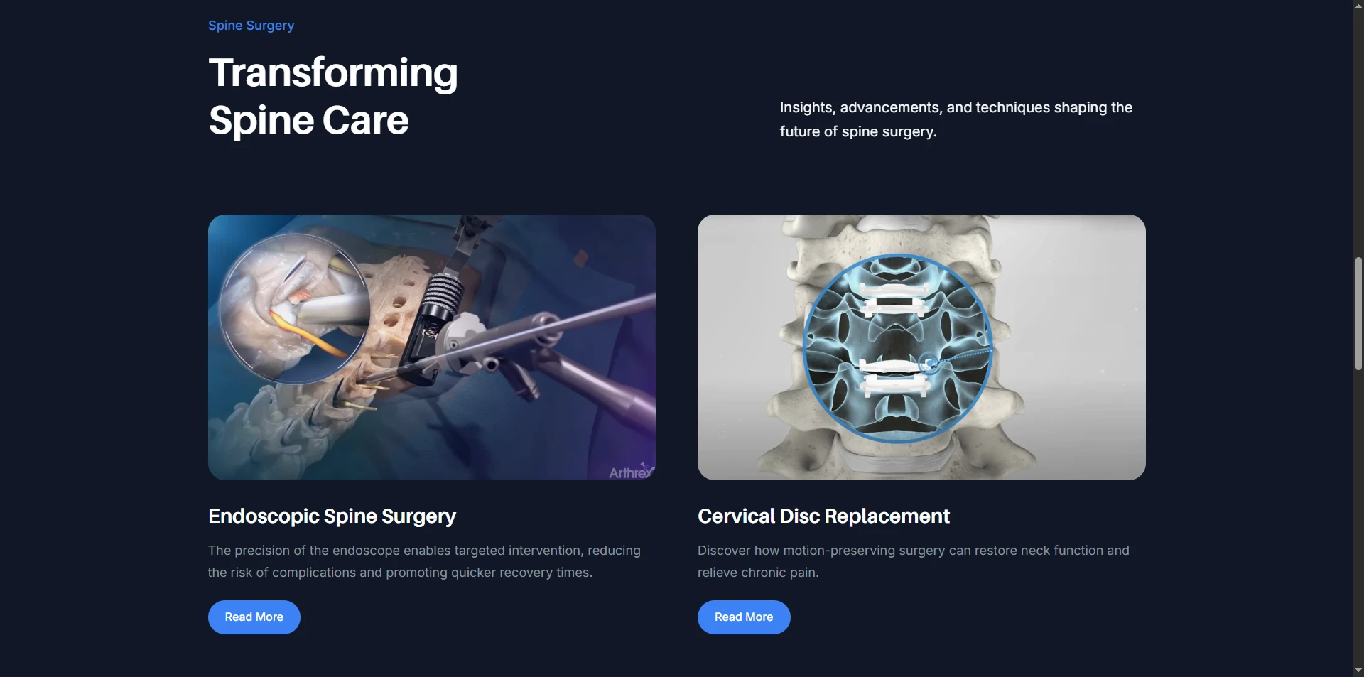 Service Highlight Modules: Key services like Endoscopic Spine Surgery and Cervical Disc Replacement are featured in a grid with imagery and quick “Read More” links emphasising specialisations.