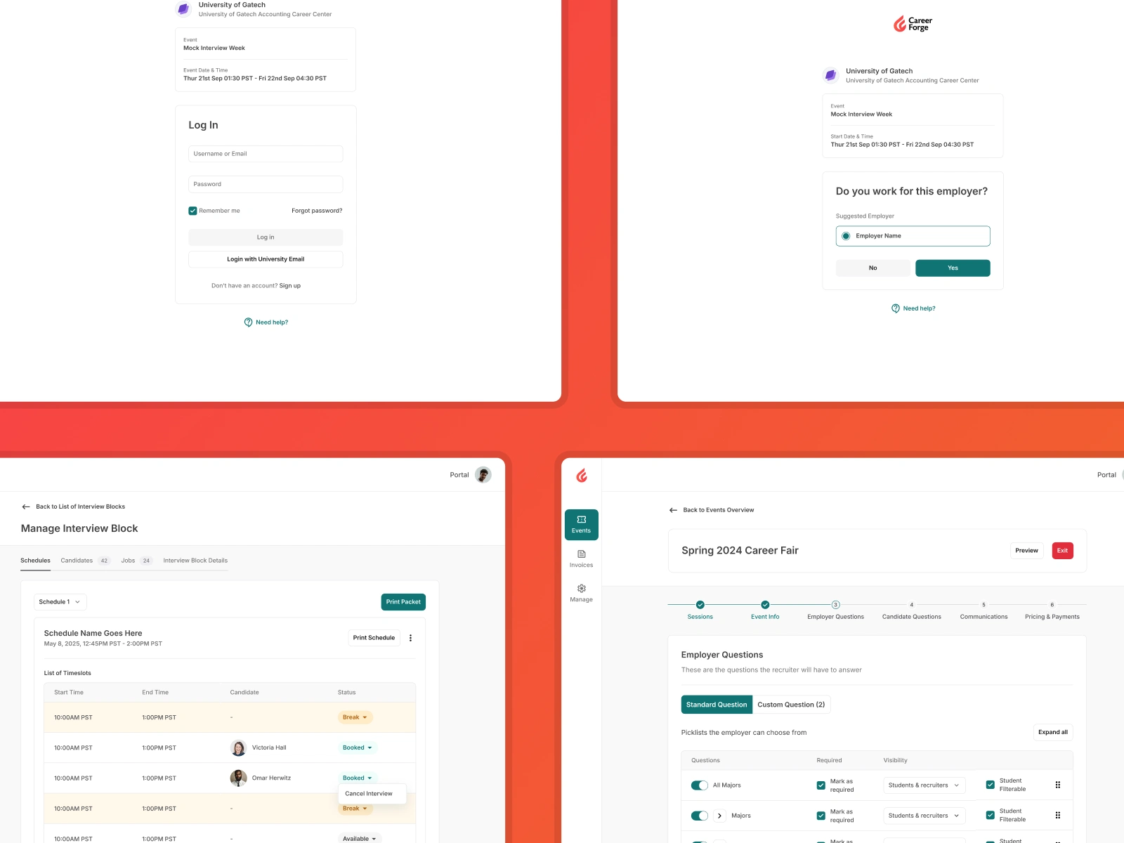 Career Forge is a robust SaaS platform tailored to the dynamic needs of university career centers, employers, recruiters, and students. Designed to unify and streamline workflows, it provides dedicated tools for job management, coaching, event coordination, experiential learning, survey creation, and interview scheduling. This client-commissioned project spanned one year. As the Product Designer, I led the end-to-end UX and UI design process using Figma, collaborating with cross-functional teams and stakeholders across institutions.