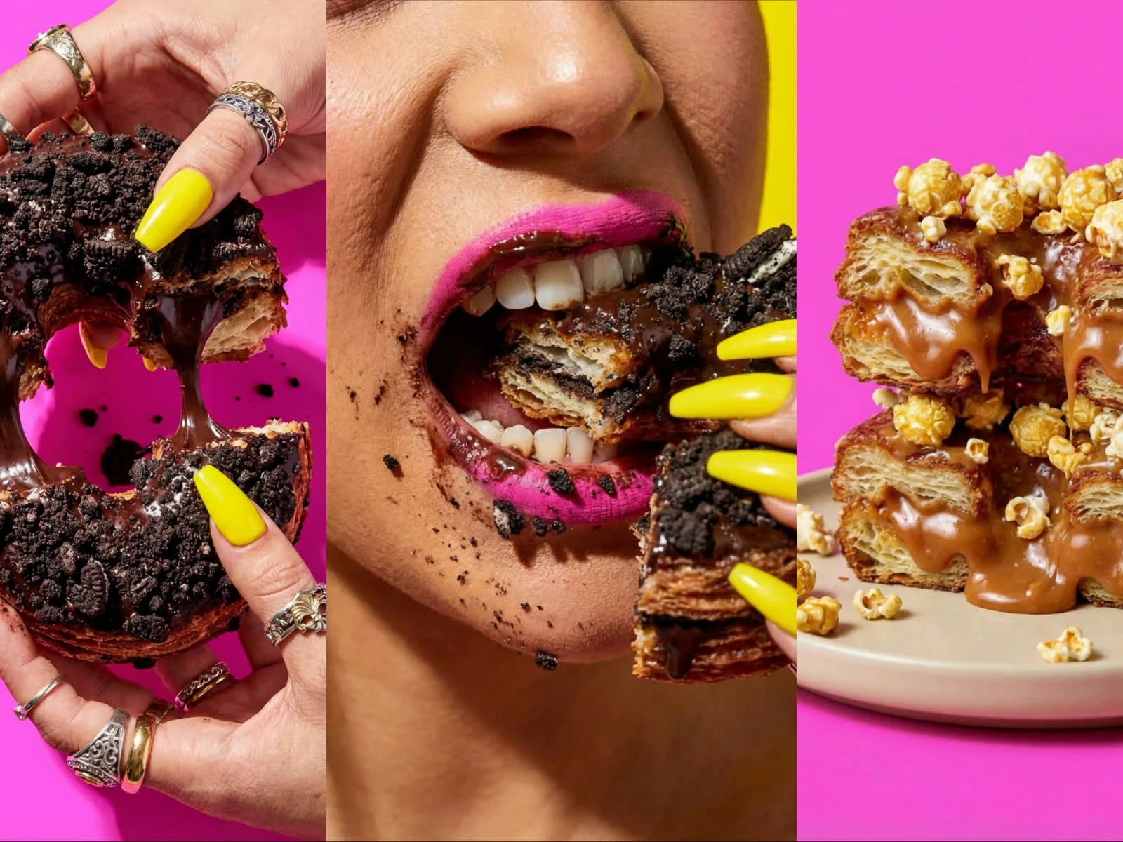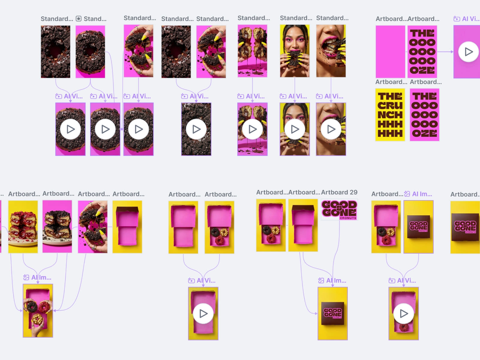 With the creative direction settled, I moved on to generating the key frames that would form the base of each video clip, using the Nana Banana Pro model. Every image had one job: make you hungry. A zoom out from the cronut topping as the opening hook, the slow tearing of the cronut in half with chocolate filling oozing out, the reveal of those layers inherited from the croissant, and then the crunchhh.