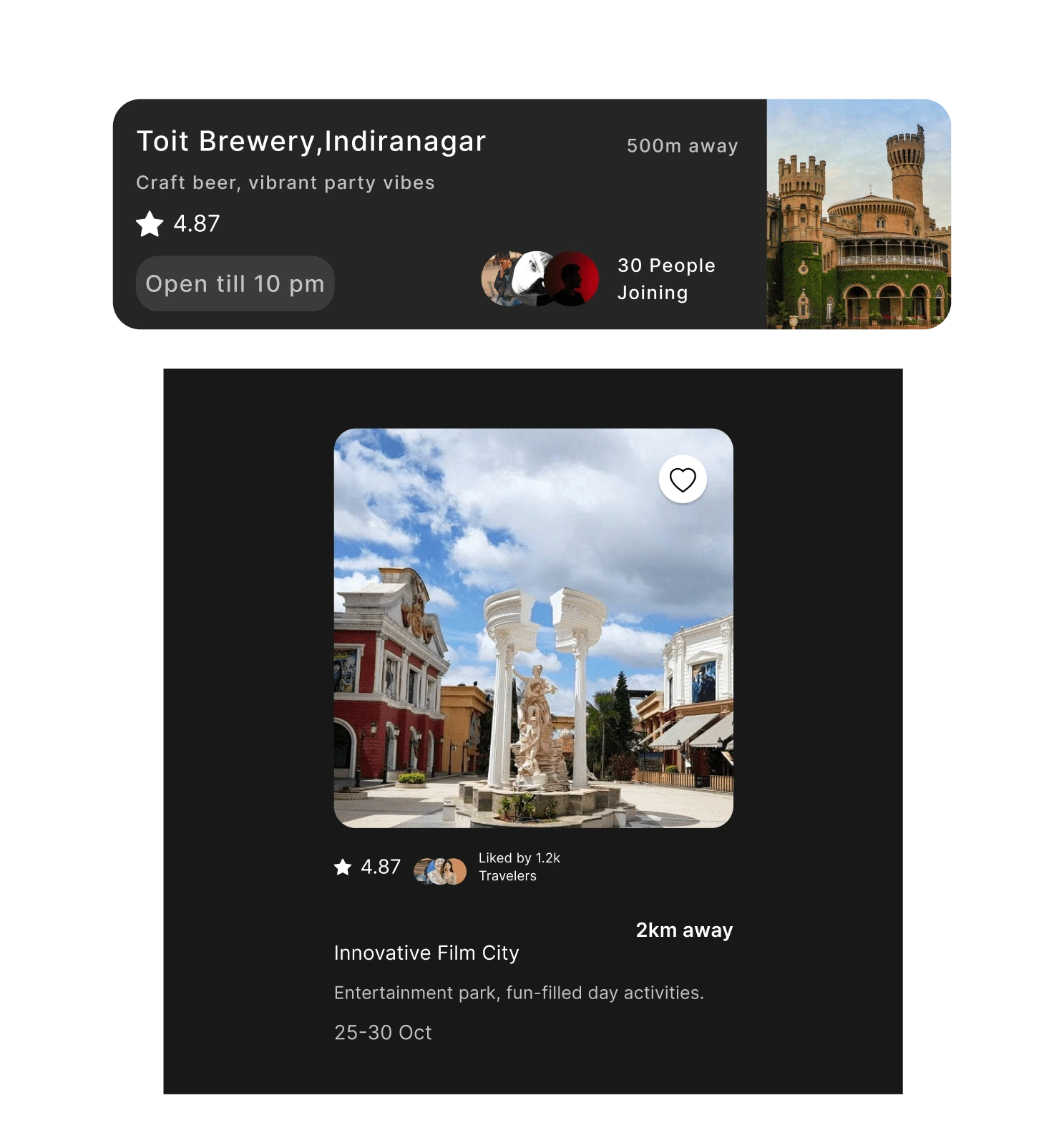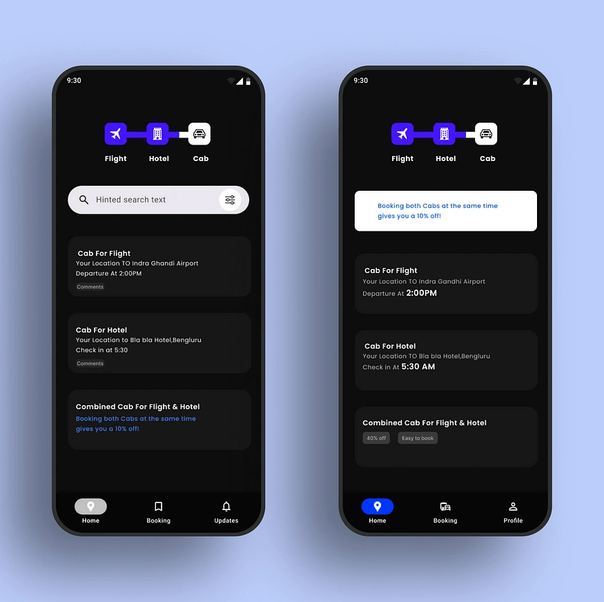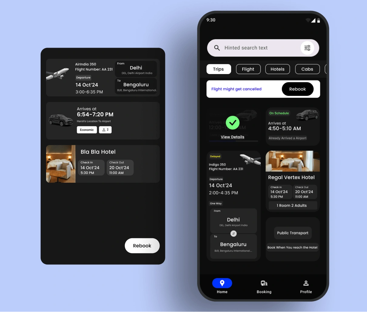 As the cab arrives, the notification bar does its job, displaying all the important details: a direct CTA to contact the driver, the estimated arrival time at the airport, and the specific gate where the flight will be departing. Meanwhile, the cab card shows the basic info, including the arrival time and an “On Schedule” element, which adds a sense of trust and reassurance that everything is on track. A helpful text element guides users, reminding them that the cab is on its way and when they can leave home. Finally, the progress bar tracks the journey from their location to the airport, providing a visual representation of the trip’s progress.\