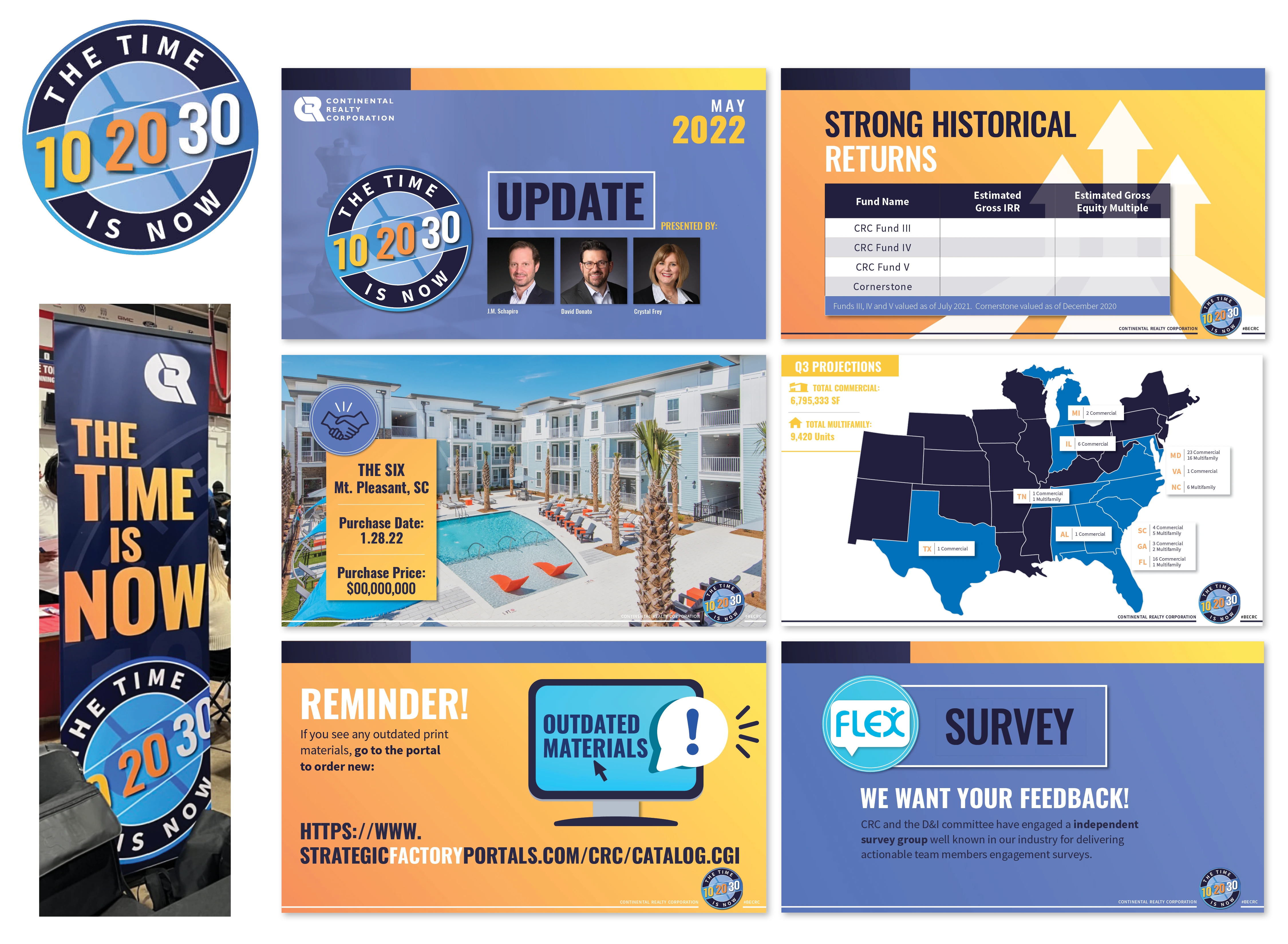 The project was to create a logo used for internal purposes to represent Continental Realty's goal of 10,000 apartment units + 20 million square feet of commercial space by the year 2030. Shown is the logo, a 82" x 26" retractable fabric banner and a few slides from a powerpoint presentation. The presentation was designed to be informal, light-hearted and enjoyable, fitting for a causal company update meeting.