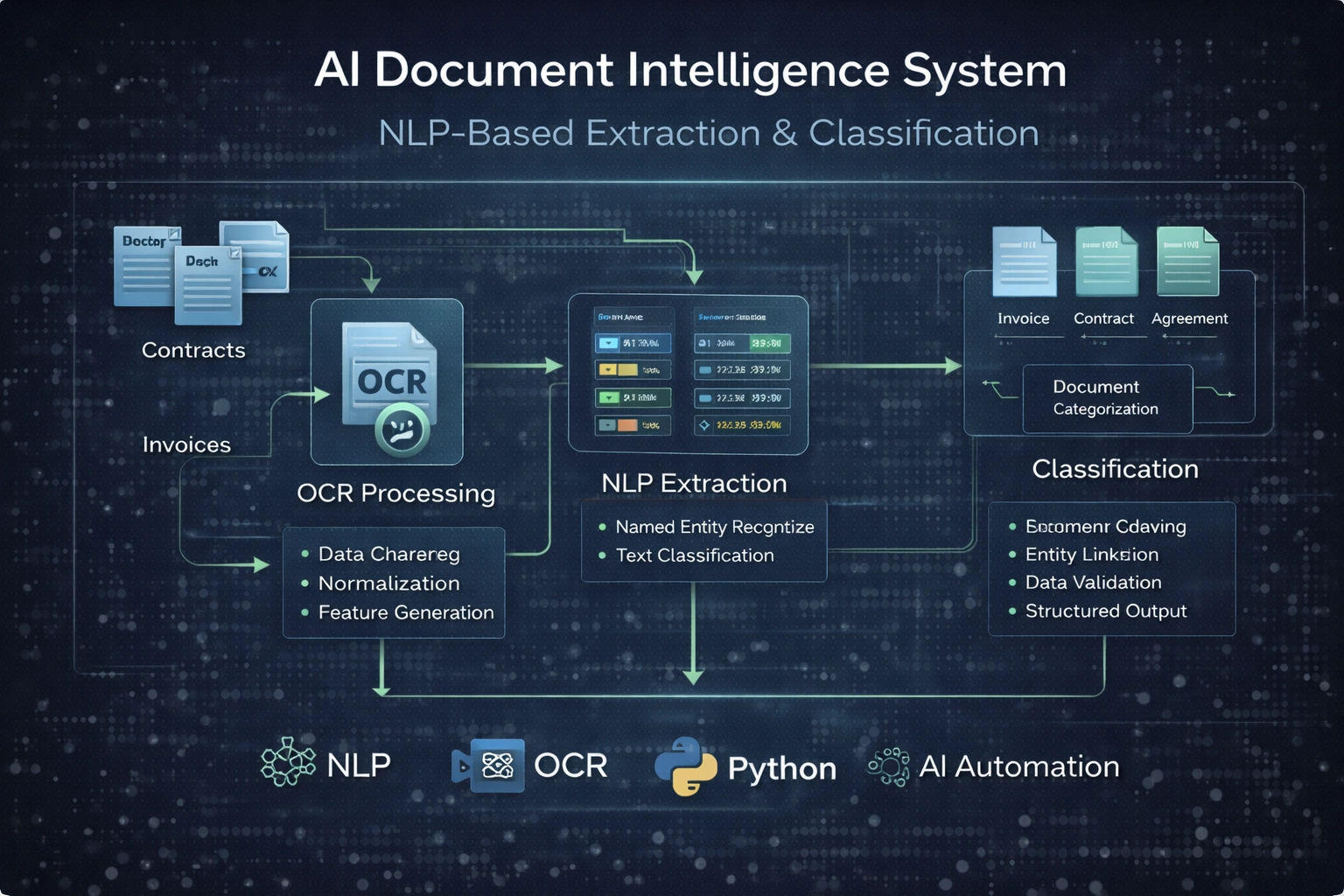 Built an AI-powered document intelligence system for automated extraction and classification of structured and unstructured data. Implemented OCR processing, NLP pipelines, and entity recognition to extract key information from invoices and contracts. Designed automated validation workflows and API integration for scalable deployment.