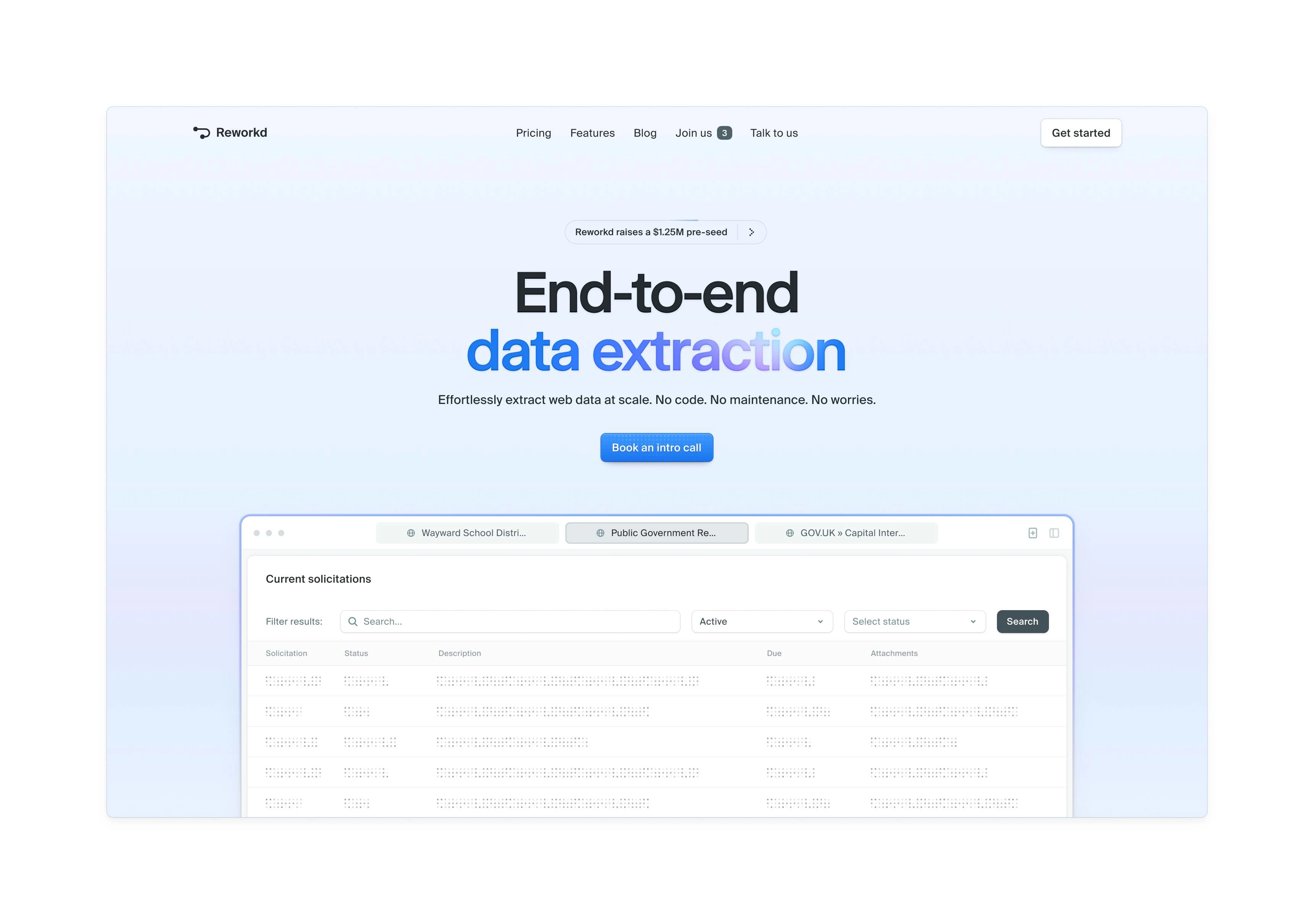 Reworkd automates your entire web data pipeline, end-to-end. It scans websites, generates code, runs extractors, validates results, and outputs data—all from one simple system.