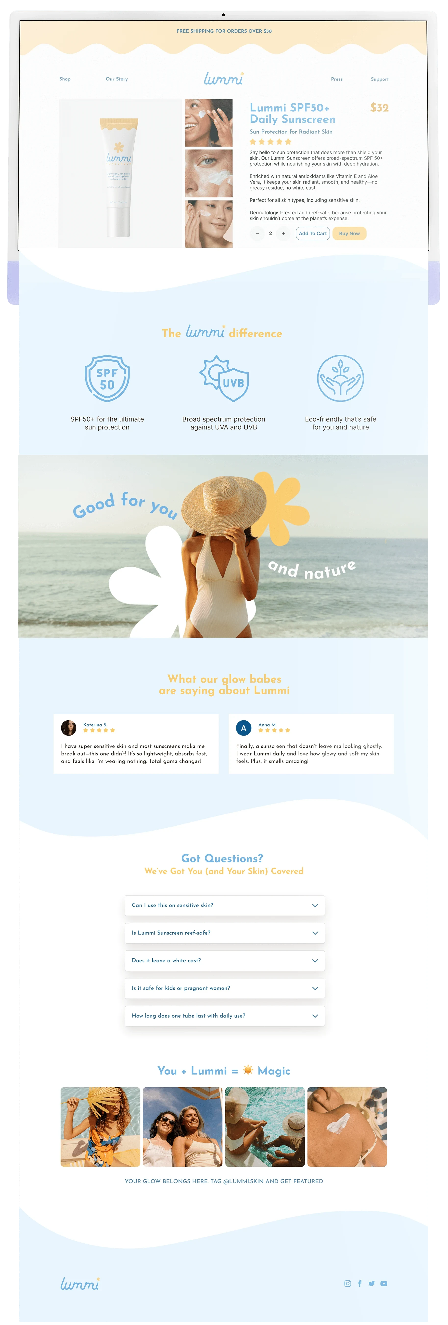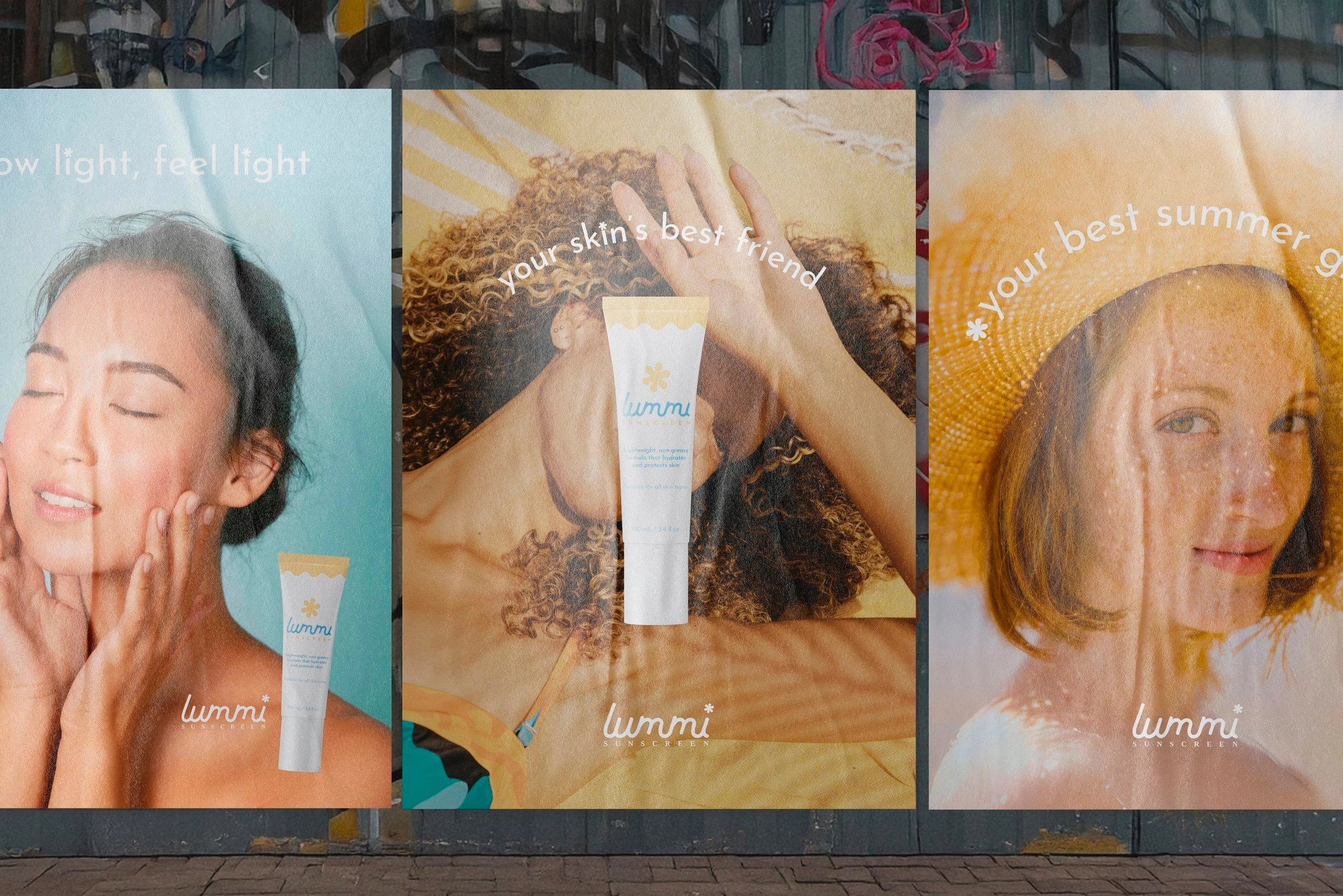 Lummi is a conceptual sunscreen brand developed through an Instagram design challenge. The project began with logo and packaging design and expanded into a fuller brand system that included poster ads, social media content, and a landing page. Soft colors, minimal packaging, and a gentle tone shape the brand to feel light, calm, and easy to integrate into daily skincare.