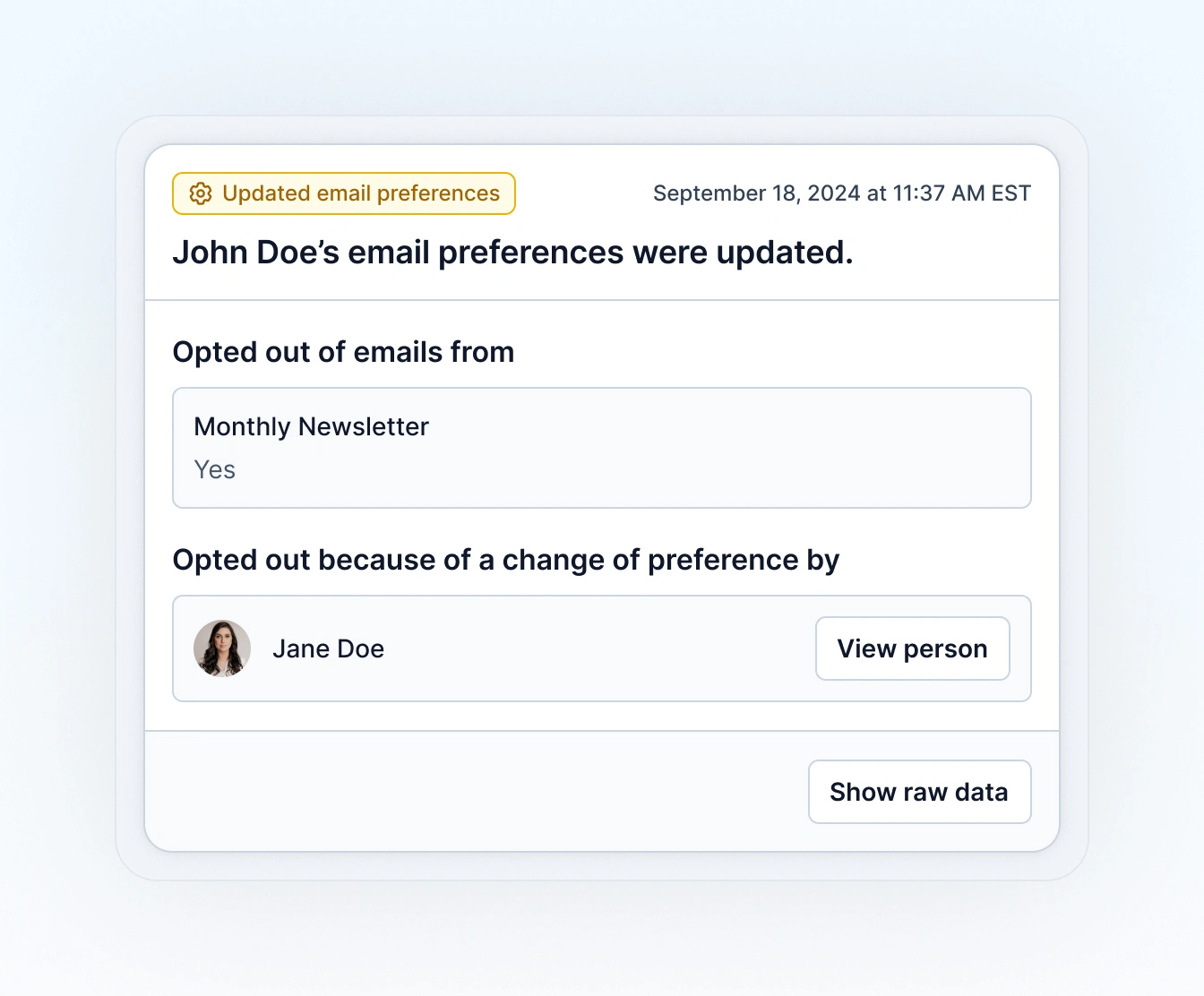 ALT: Screenshot of a notification showing that John Doe's email preferences were updated. The update took place on September 18, 2024, at 11:37 AM EST. The notification reveals that John Doe opted out of emails from the Monthly Newsletter, and it shows "Yes" under this section. The message also indicates that the opt-out occurred due to a change in preference by Jane Doe, whose profile picture is displayed. There's also a "View person" button next to Jane Doe's name, and a "Show raw data" button is located at the bottom right of the notification.