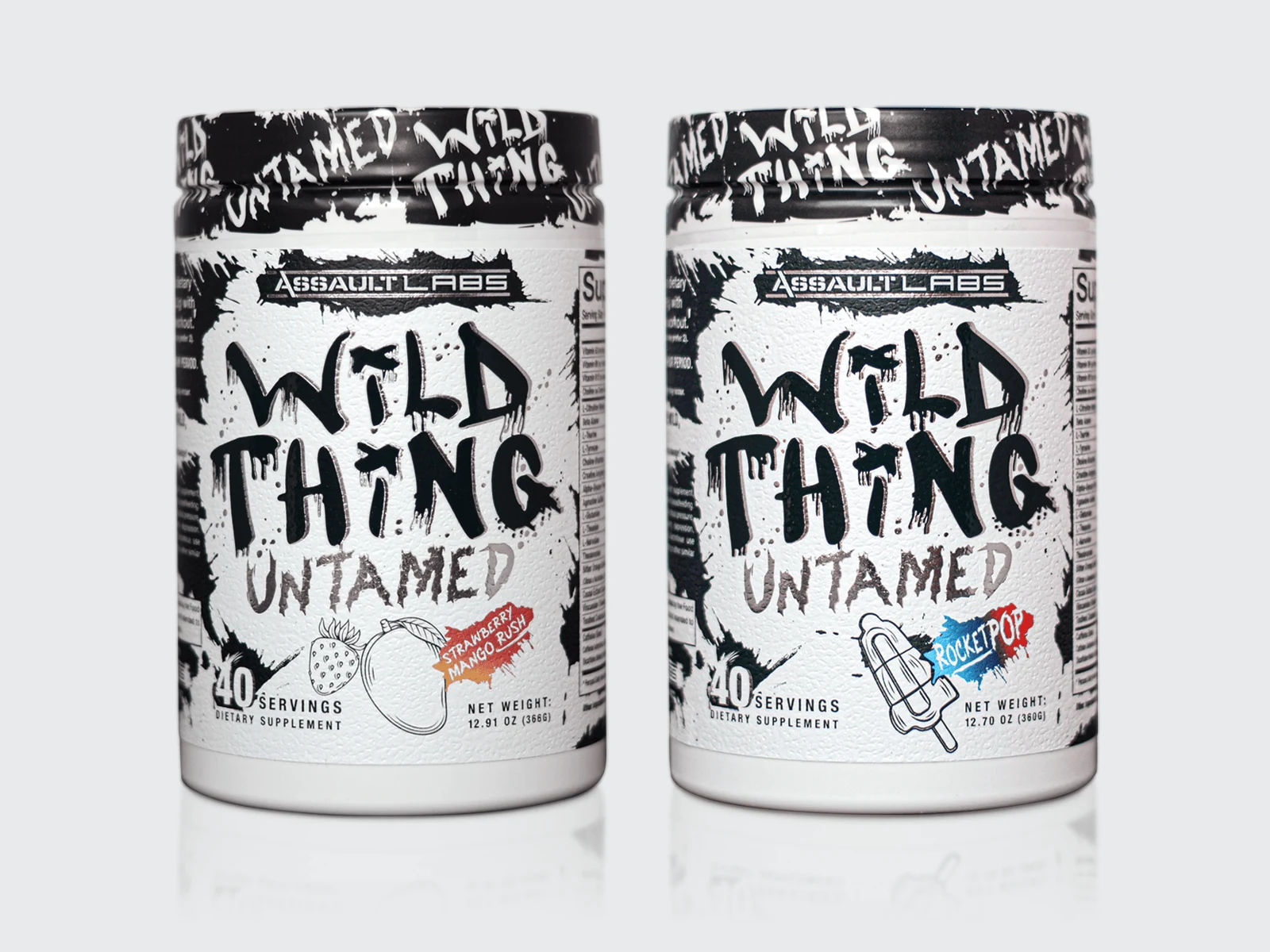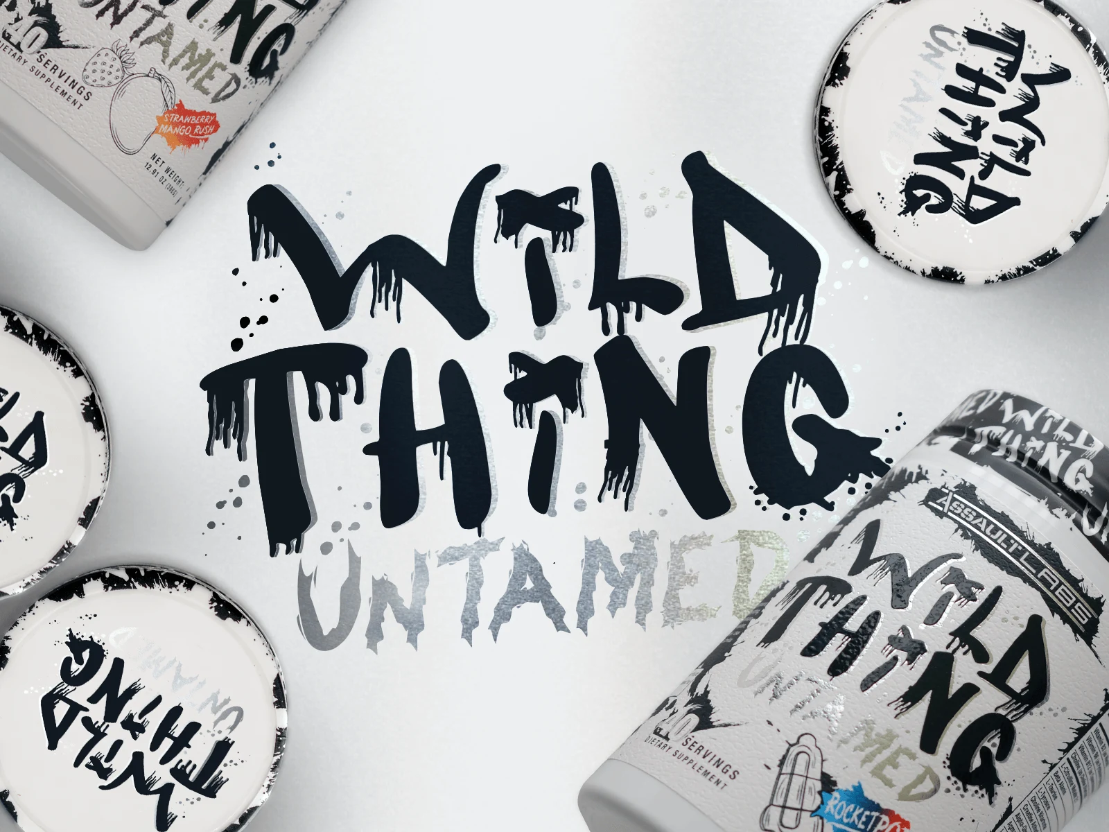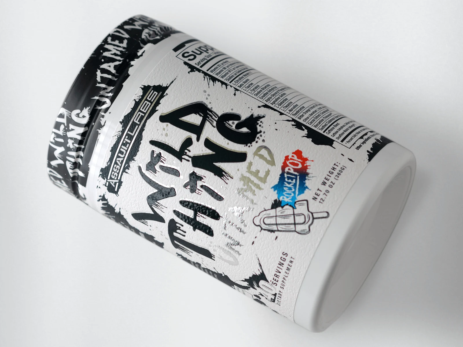 Selecting the white gloss container option available for this job, I went with a Cobblestone textured white sheet for the printing, along with silver foil stamping and raised gloss accents. Adding quality and value plus a tactile experience to the finished product. While staying on budget, I also created a one color, black on clear neck seal for the top with the Wild Thing product brand name in reverse to give it a more finished look.