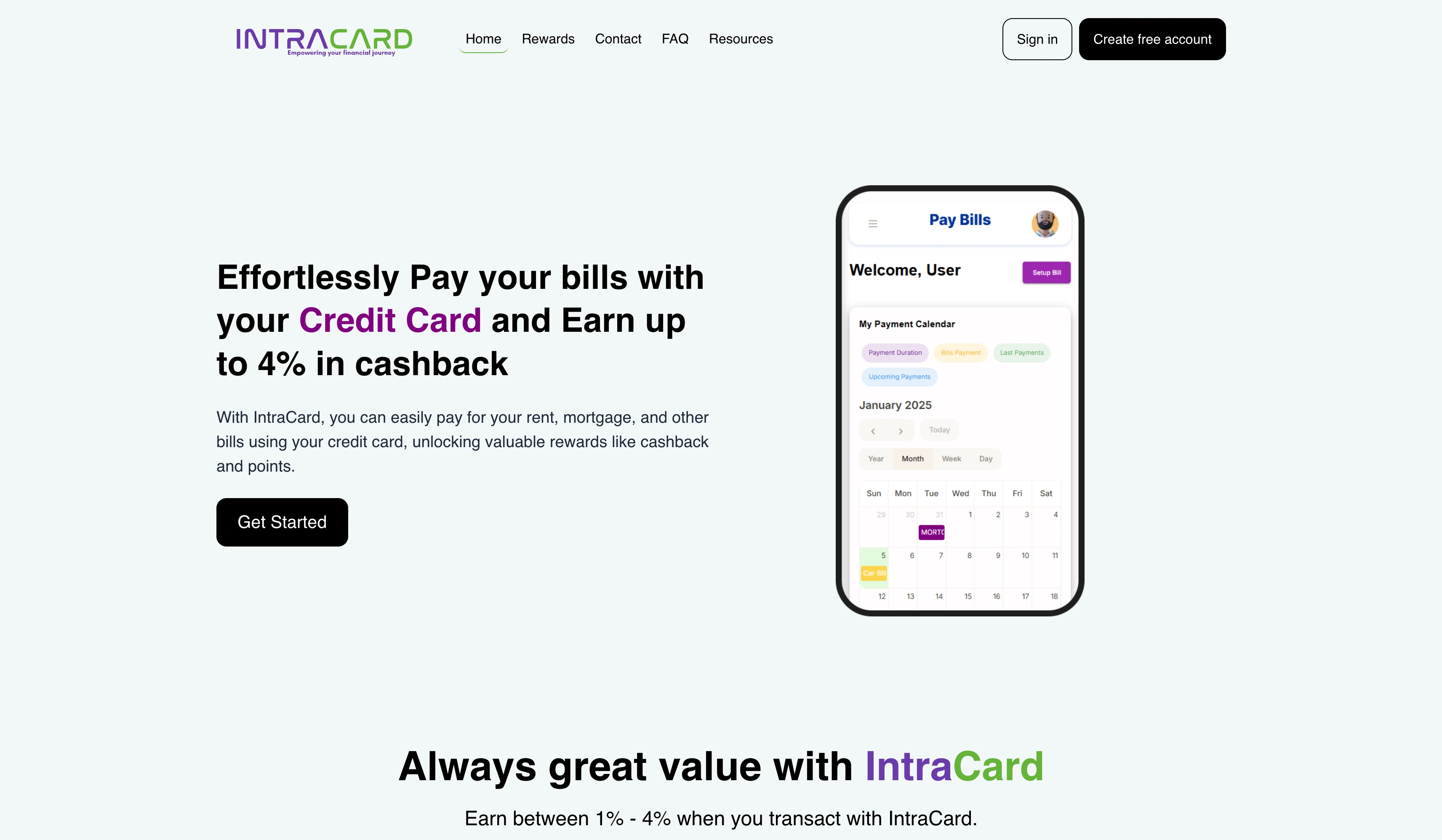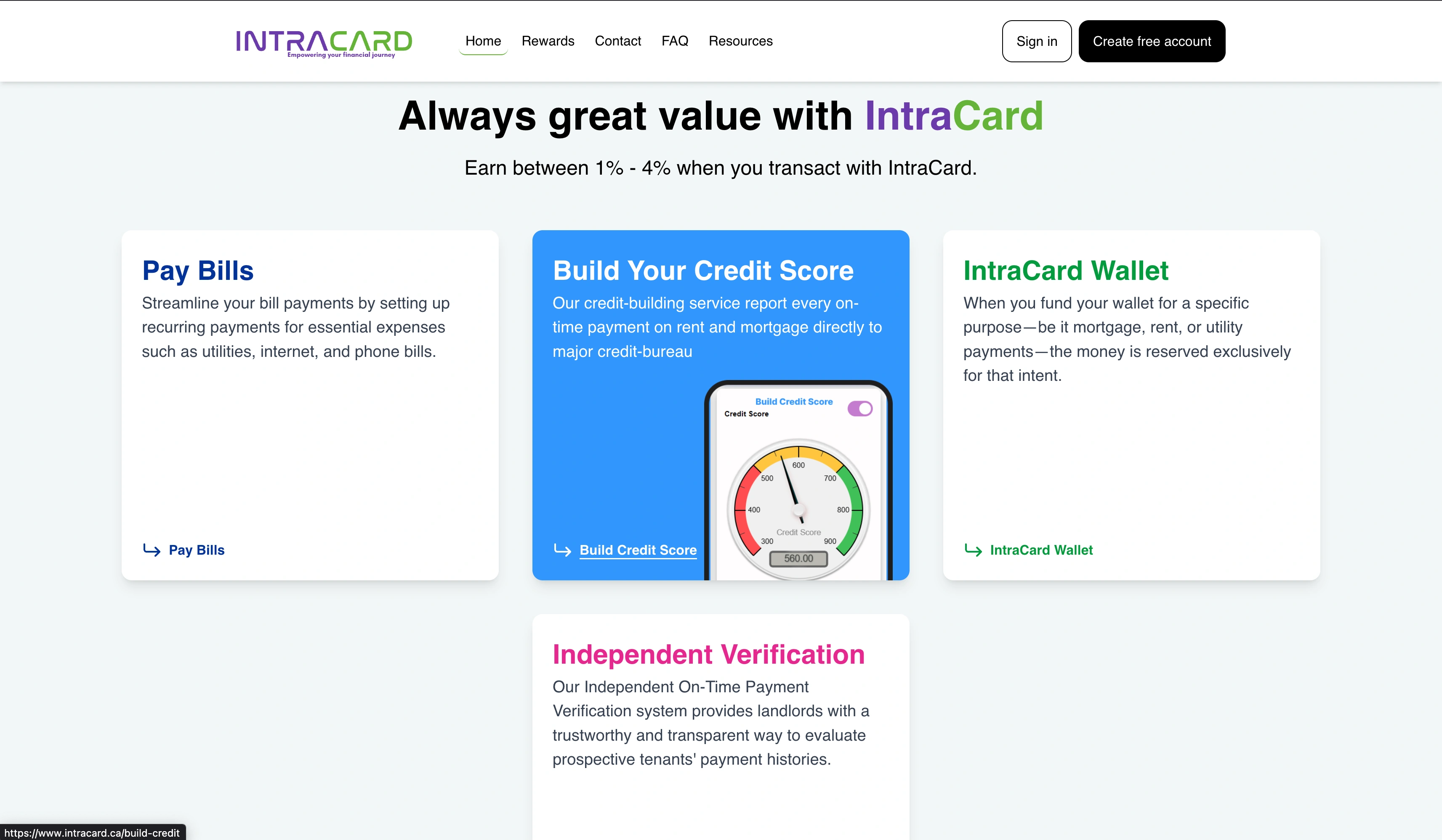 A fully responsive MVP for IntraCard using Vue, TypeScript, and TailwindCSS. Delivered in just 3 days, the 5-page web app (home, rewards, contact, FAQ, and resources) followed best practices in accessibility, SEO, and performance. The project earned me a 5-star review for speed, quality, and attention to detail.