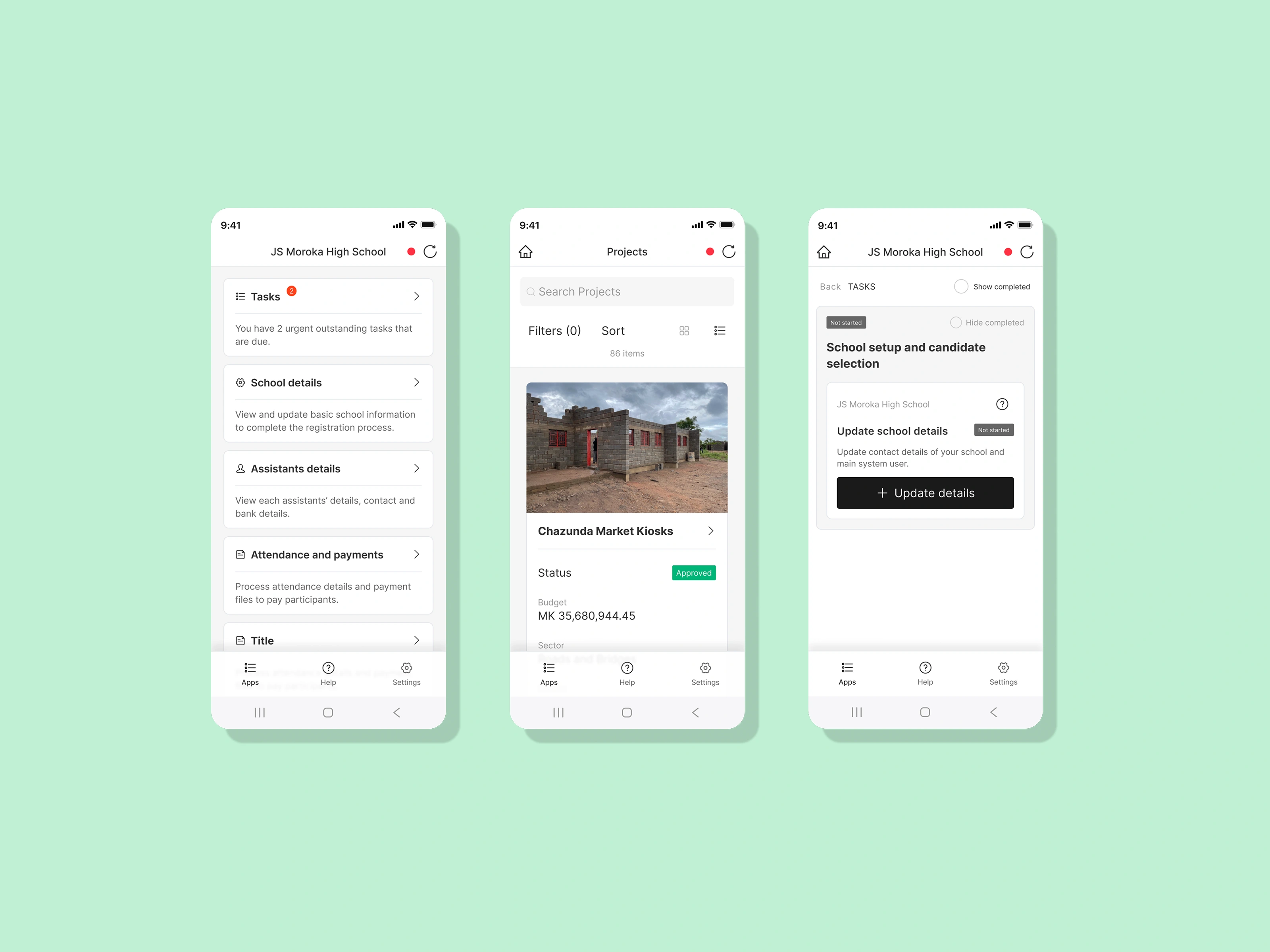 I designed a mobile extension of a nonprofit data platform to support schools and community programmes. The app focused on offline access, modular workflows, and simplicity, enabling staff to capture reliable data in low-bandwidth environments with minimal training.
