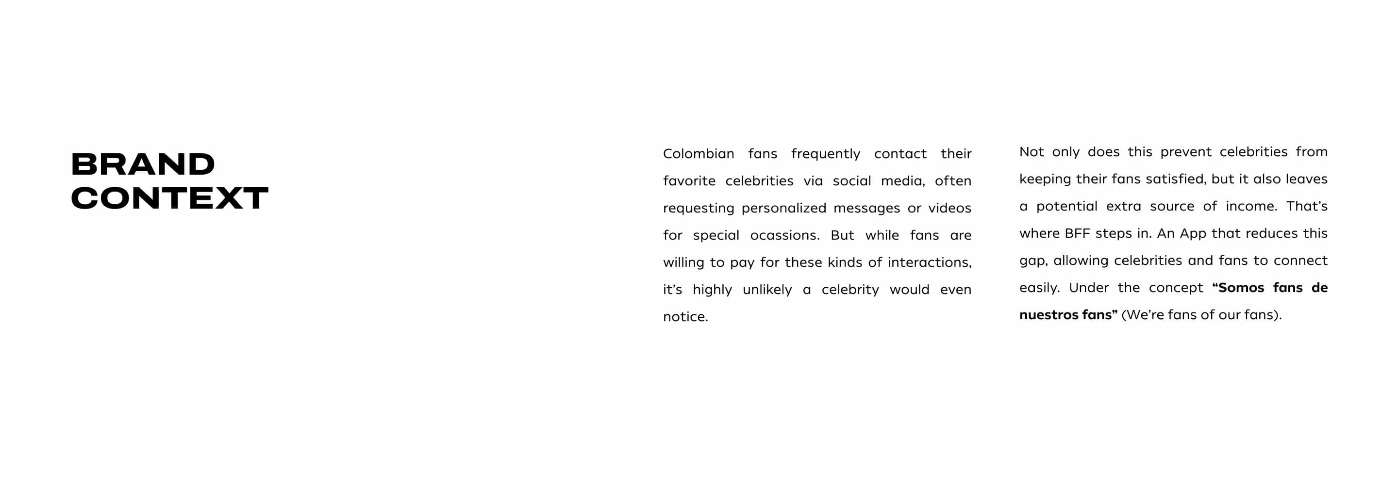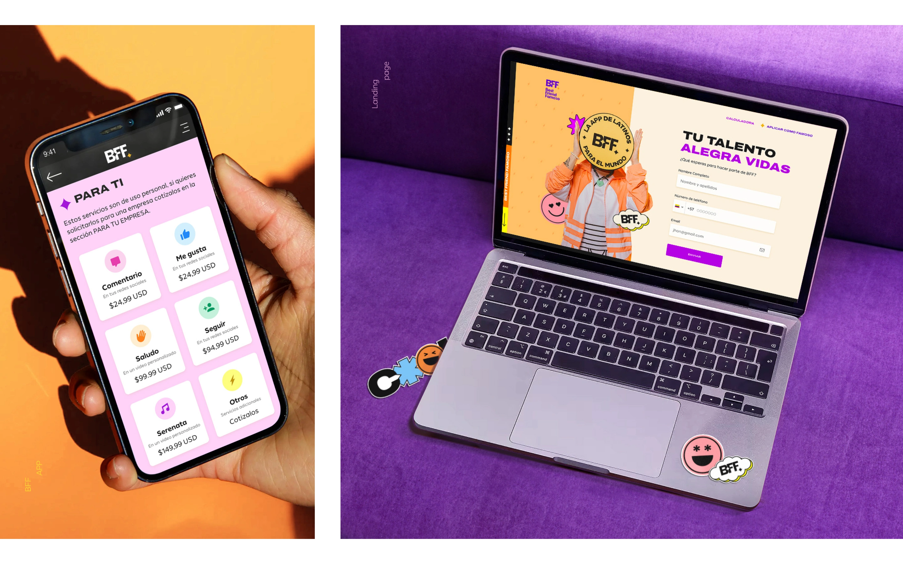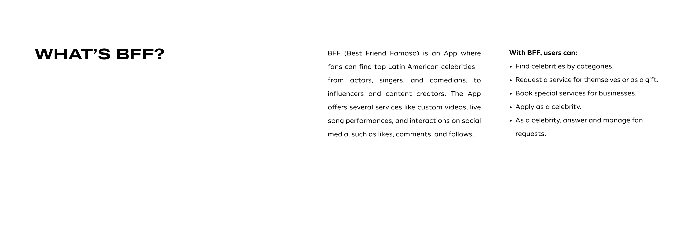 BFF (Best Friend Famoso) is an app that connects Latin American talents with their fans through social media interactions, serenades and much more.