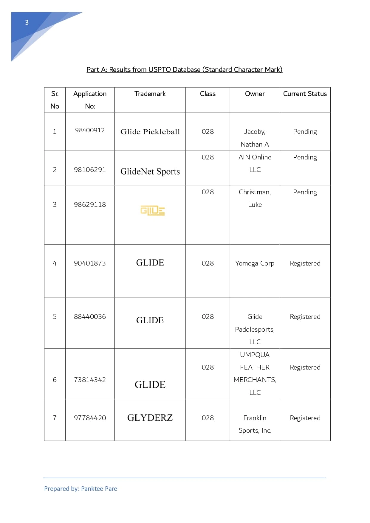 I prepare a comprehensive search report of the brand name. As seen in the image here, I shortlist some marks that may be confusing or conflicting in nature.