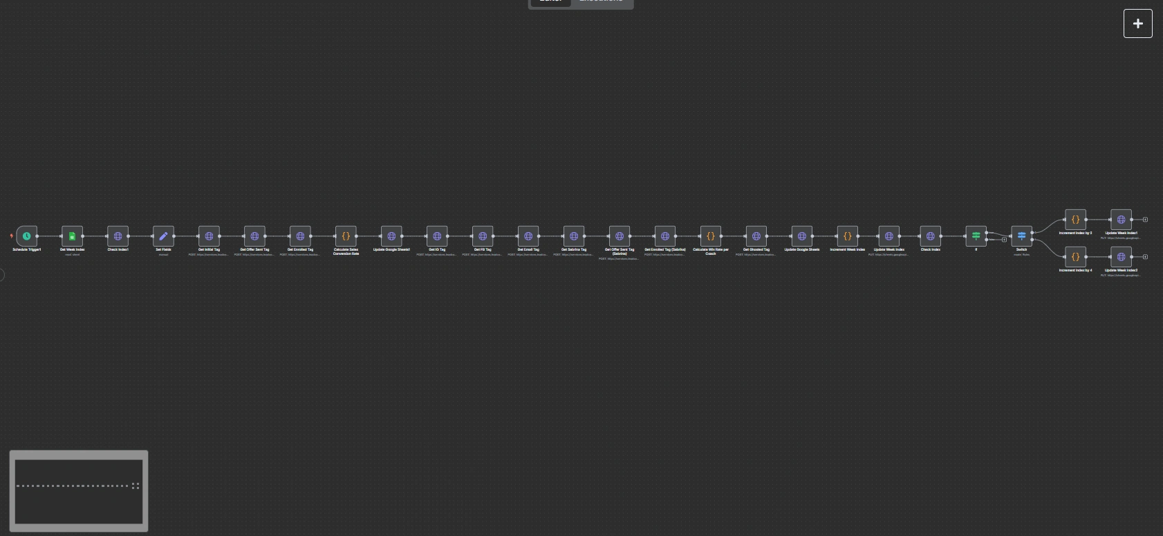 This automation pulls data from GHL, calculates it into specific metrics, and pushes it to Google Sheets. It triggers weekly based on a specific timeframe.