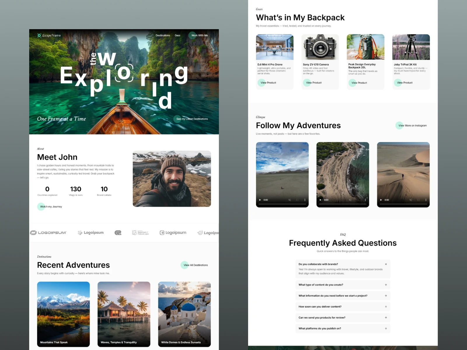 Escape Frame is a website experience designed for travel influencers who want a professional space to showcase their journeys, highlight affiliate products, and attract brand collaborations.