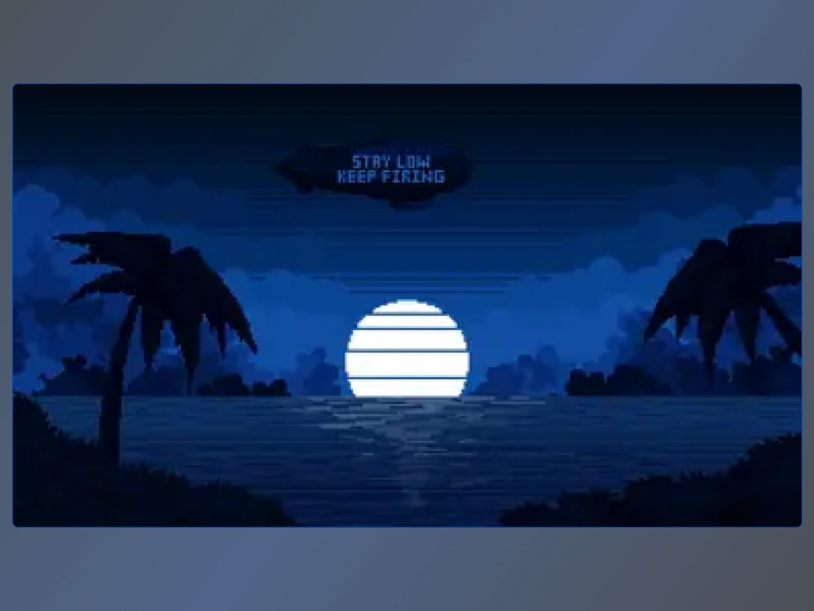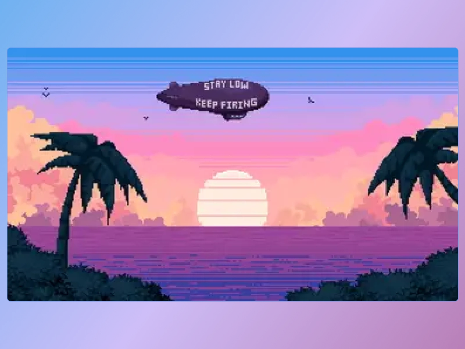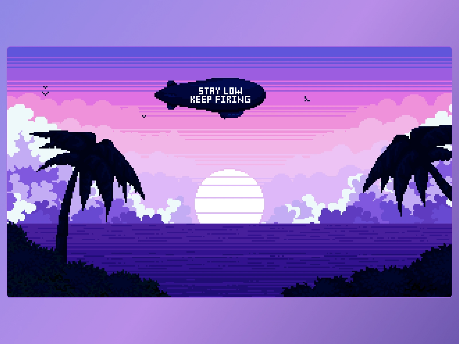 A serene 16-bit pixel beach scene series showing morning, evening & midnight vibes. Features soft waves, a floating blimp, and nostalgic game-style charm.