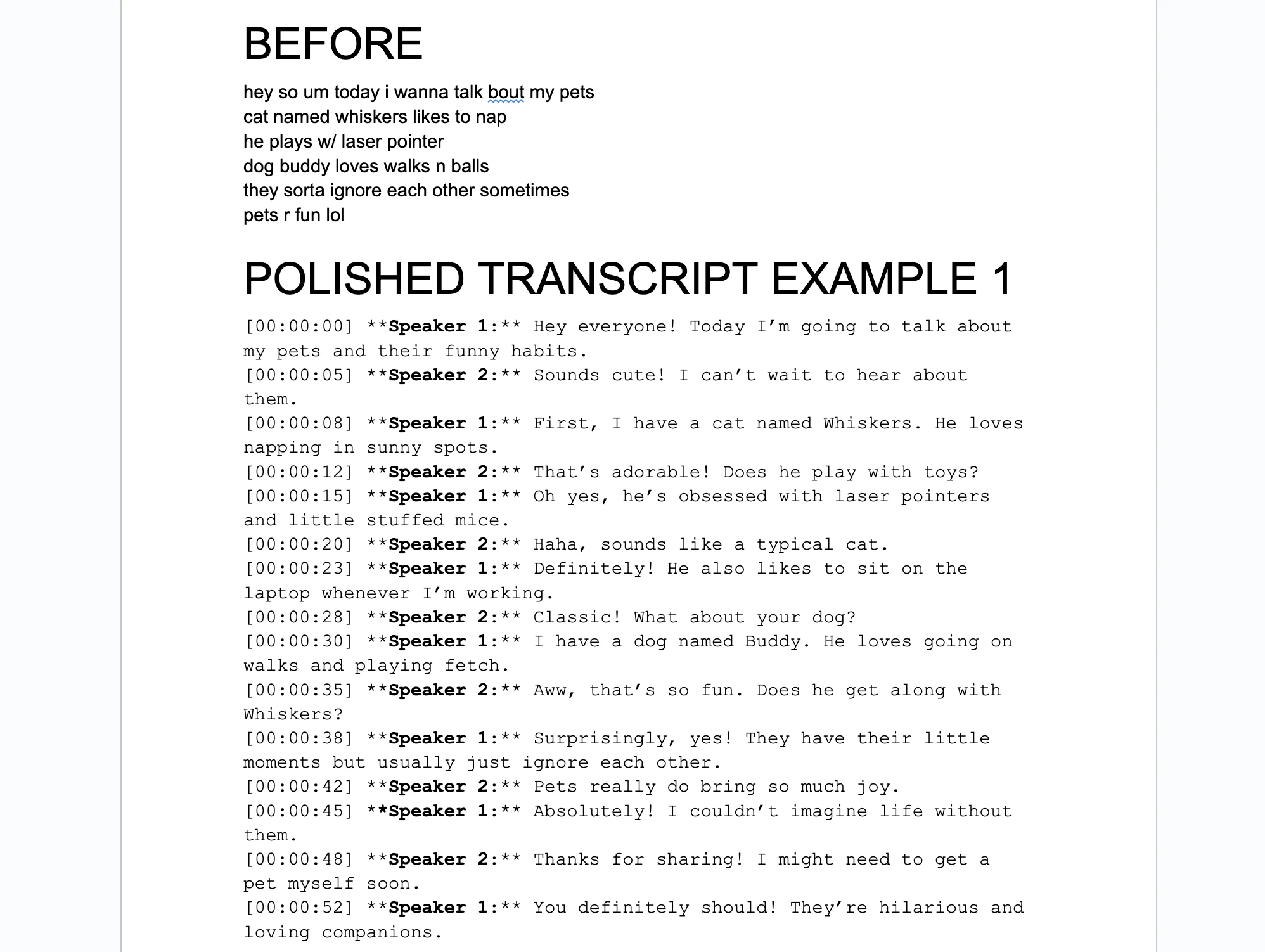 Example of my transcription workflow from messy audio notes → polished transcript with timestamps and speaker labels.