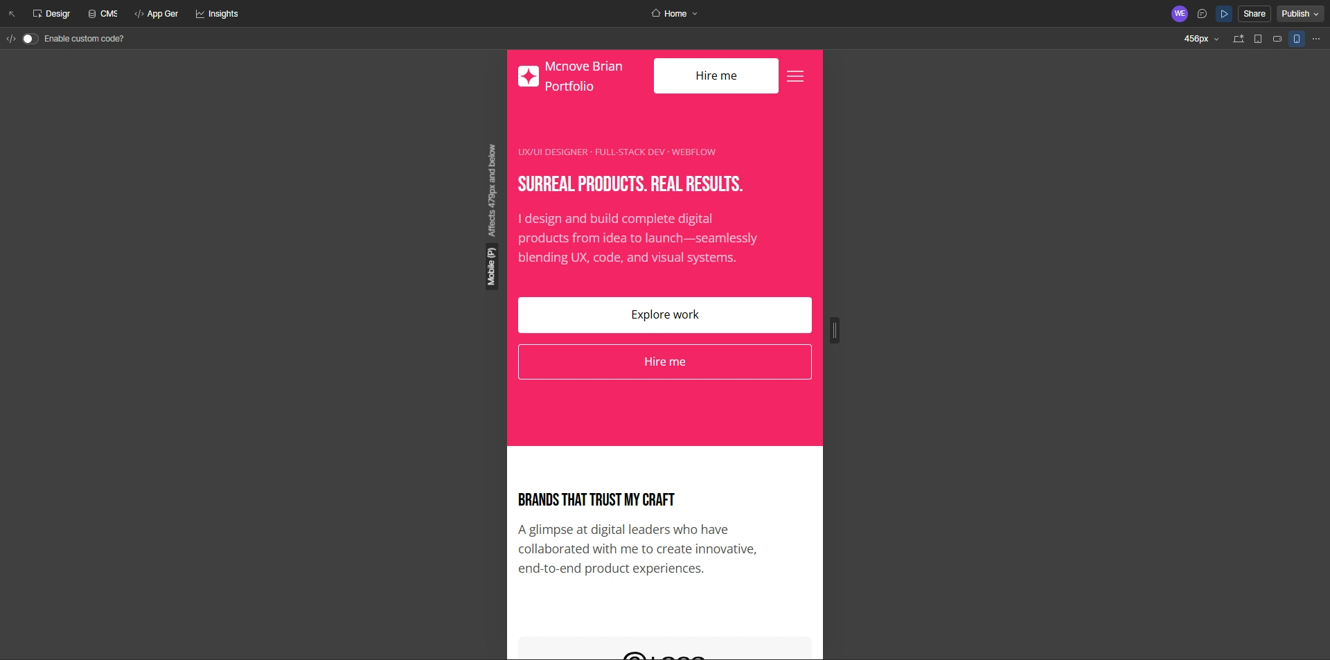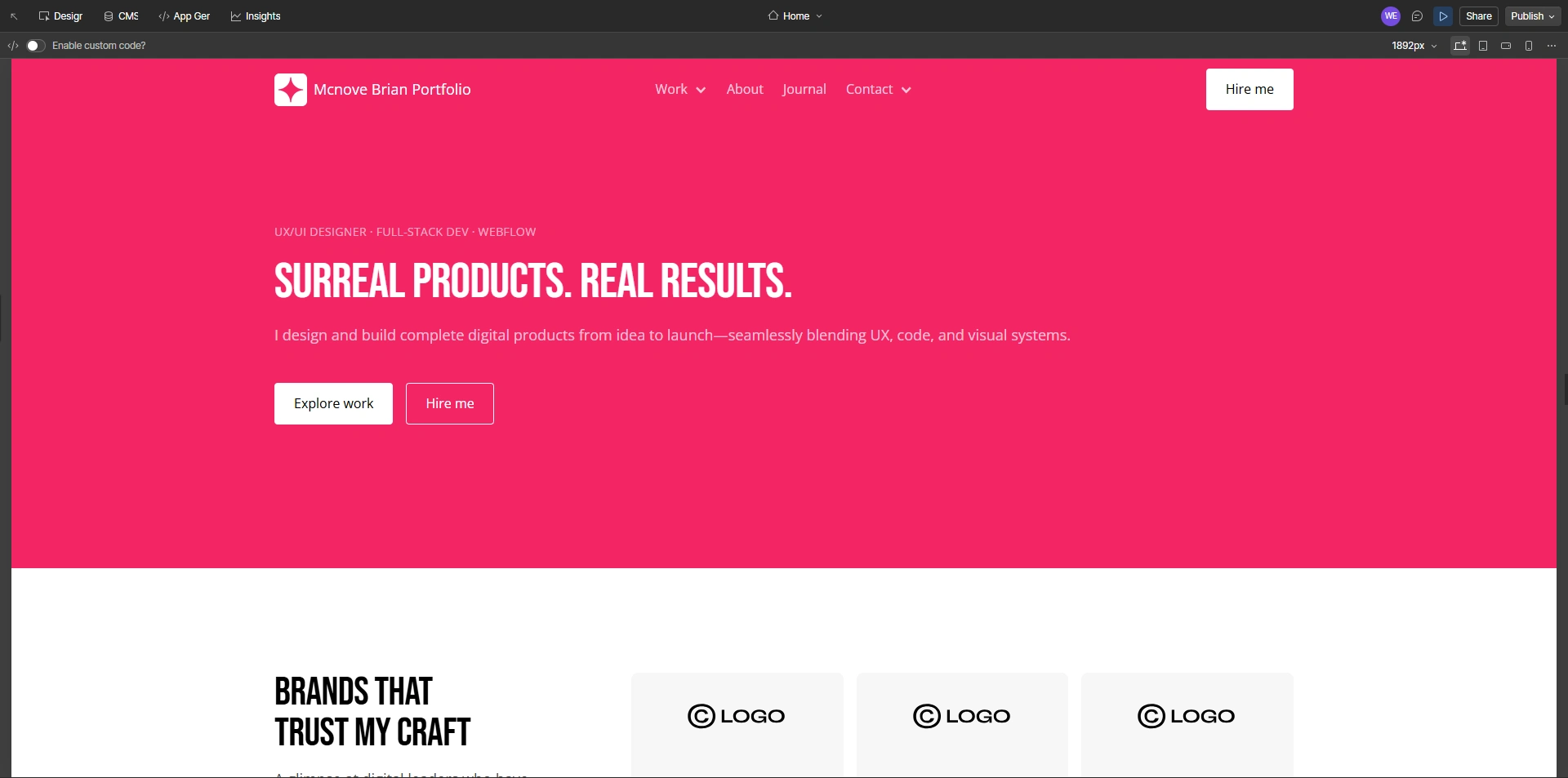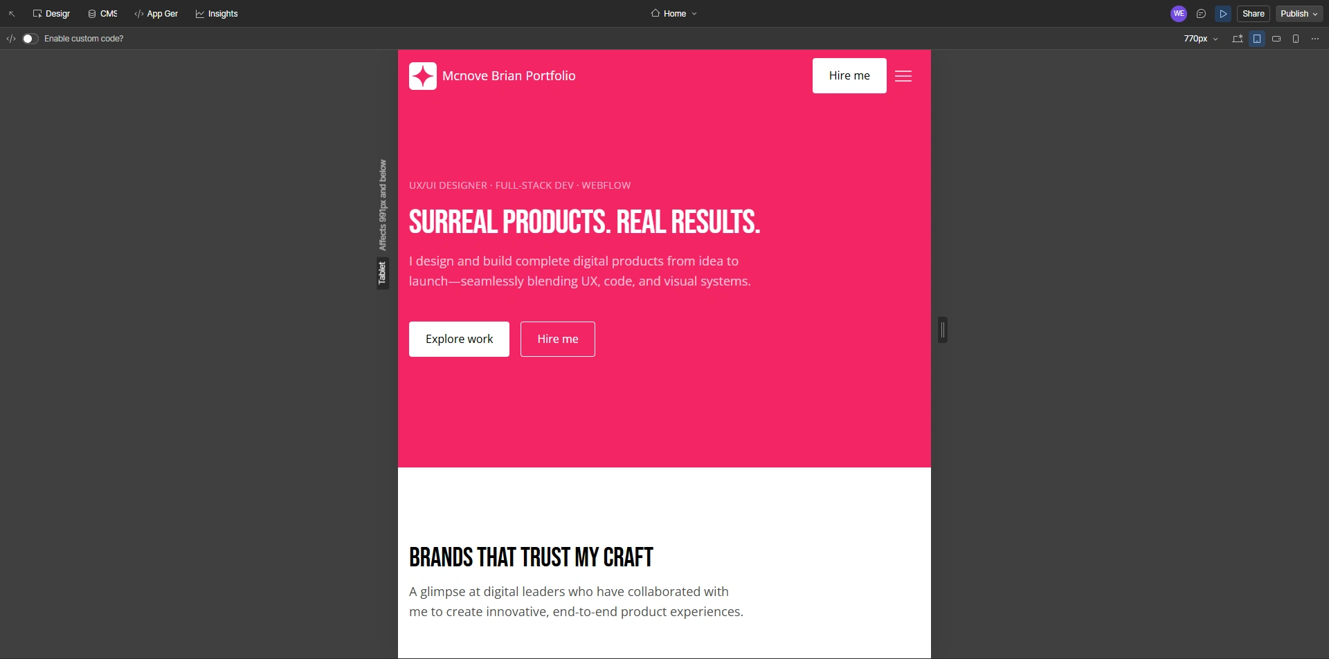 Built a custom portfolio website from concept to launch using Webflow. The project focused on creating a visually engaging and conversion-friendly experience while maintaining clean structure and responsive performance across desktop, tablet, and mobile.