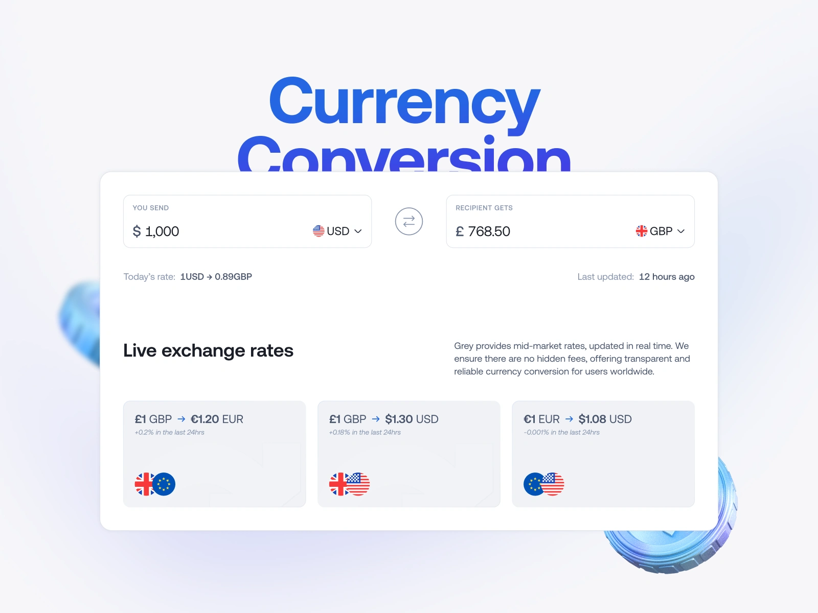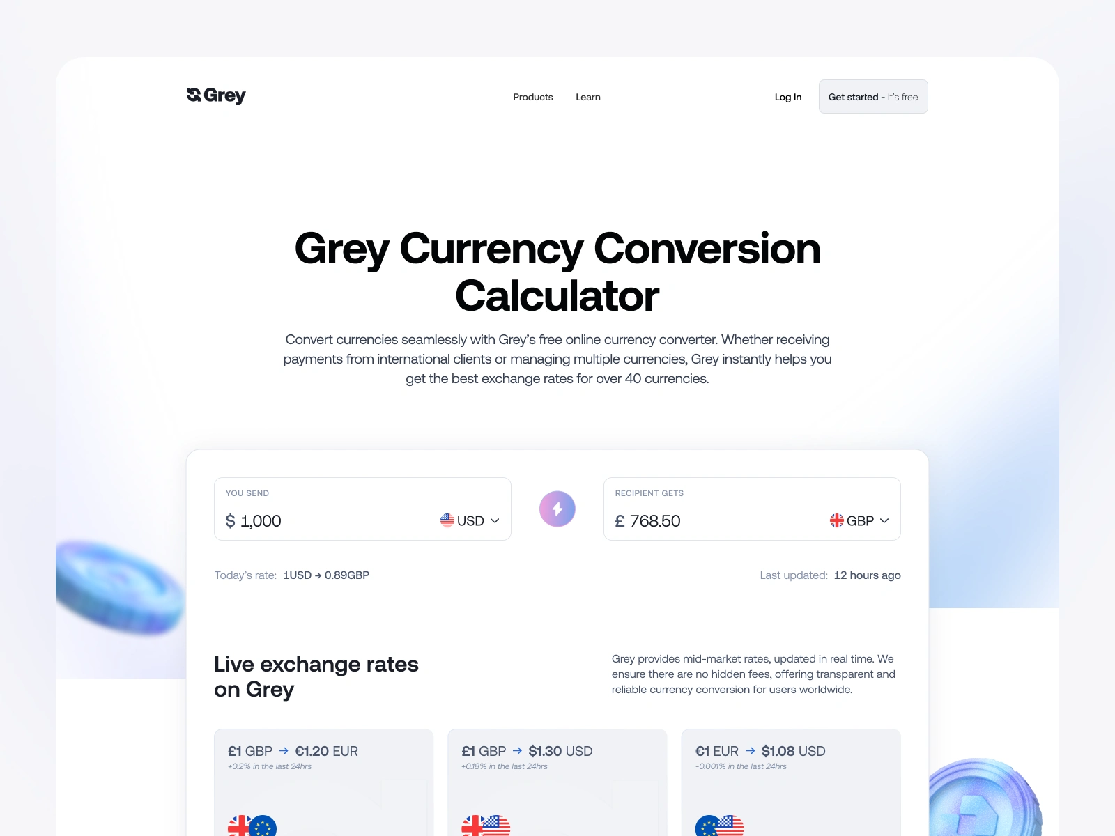Grey helps users send, receive, and convert foreign currencies with ease. I was responsible for designing and developing the Currency Exchange page, a key part of the user journey where users learn about Grey’s exchange rates and can interact with a live converter.