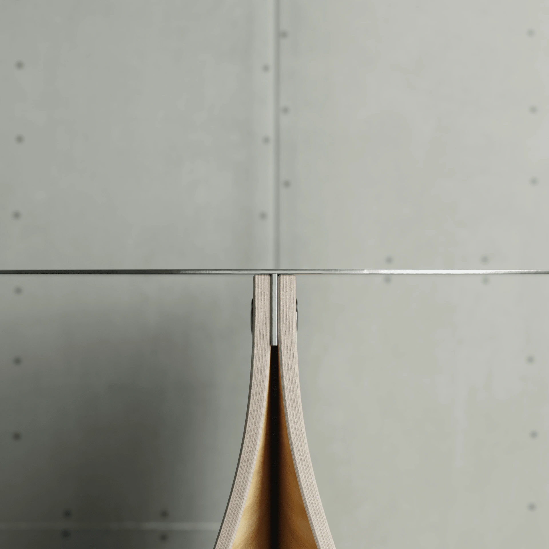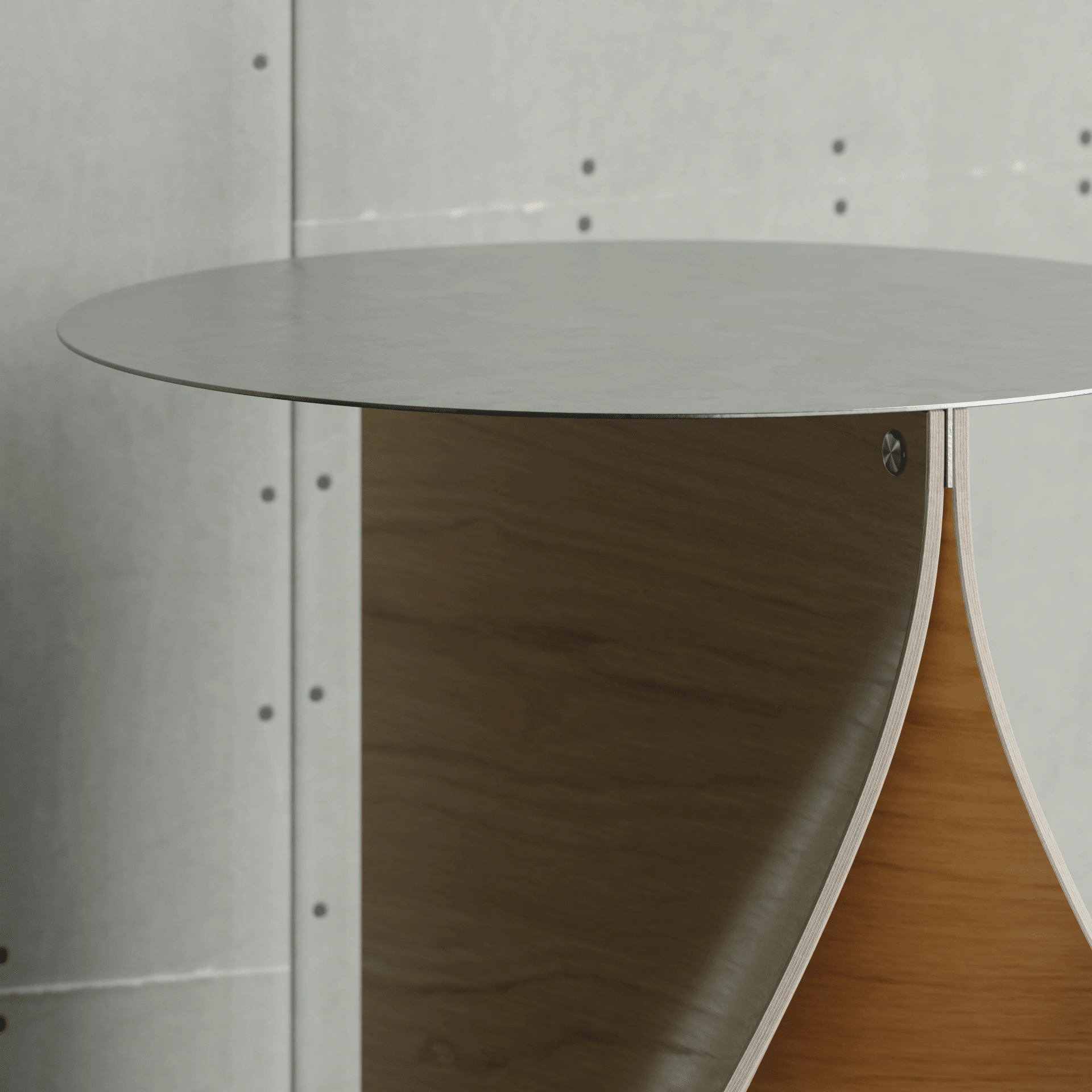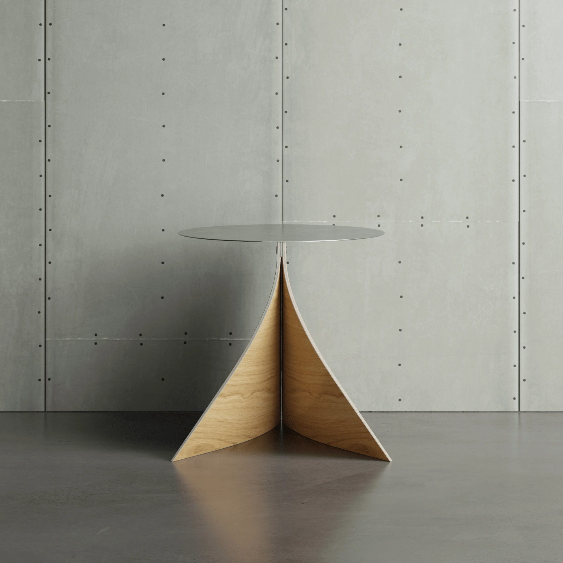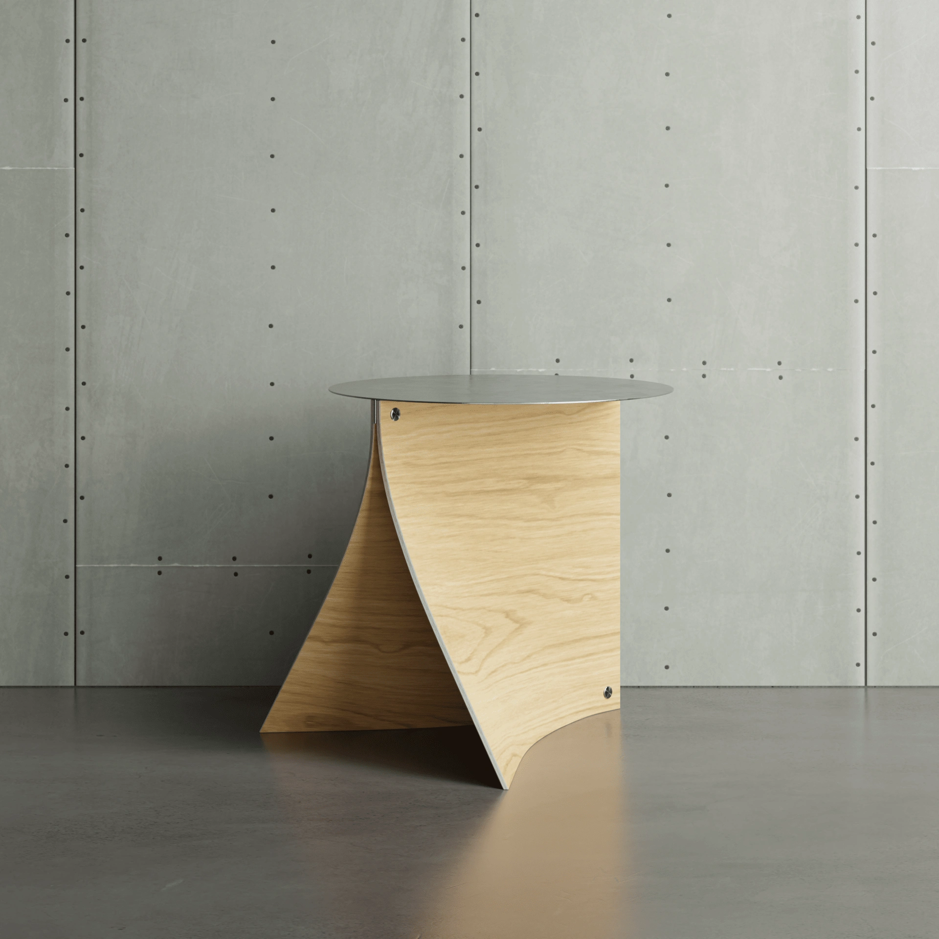 Crafted Elegance: Witness the seamless fusion of form and function as two bent plywood sheets delicately cradle a sleek metal tabletop, united by the subtle strength of steel pins. Beauty in simplicity, captured in furniture design.