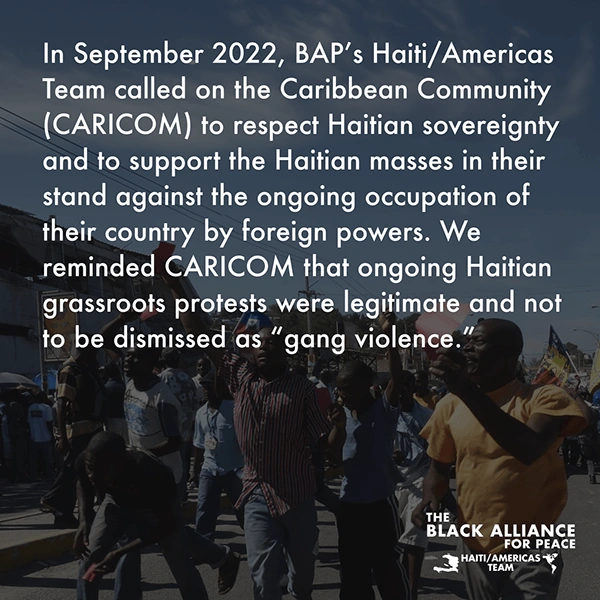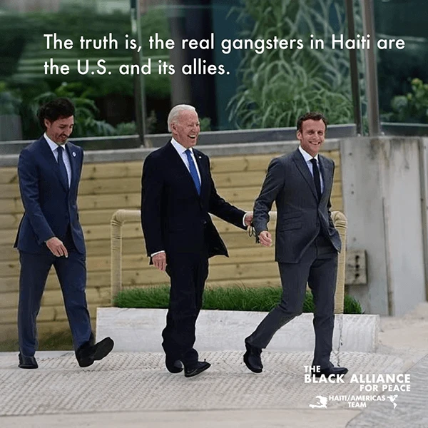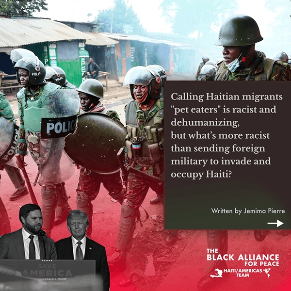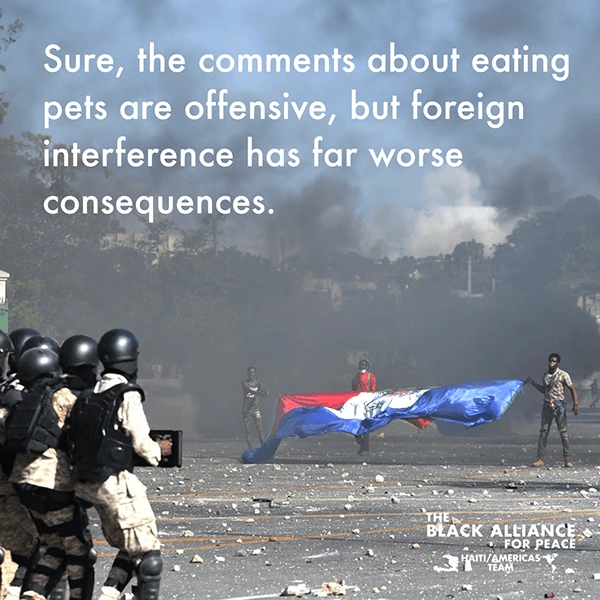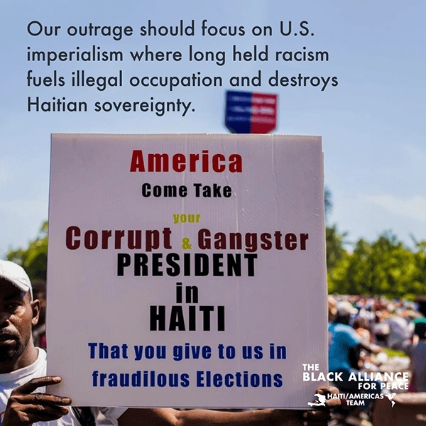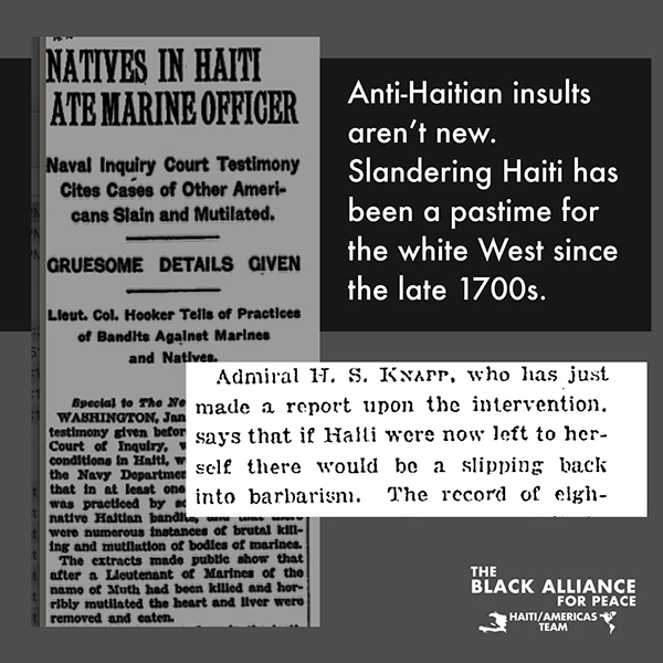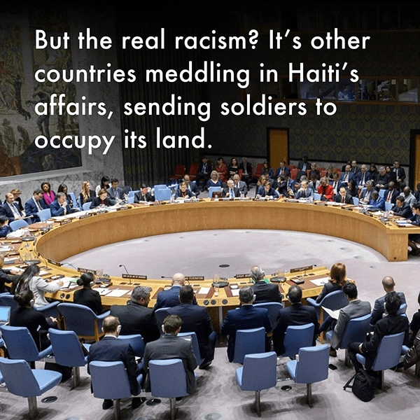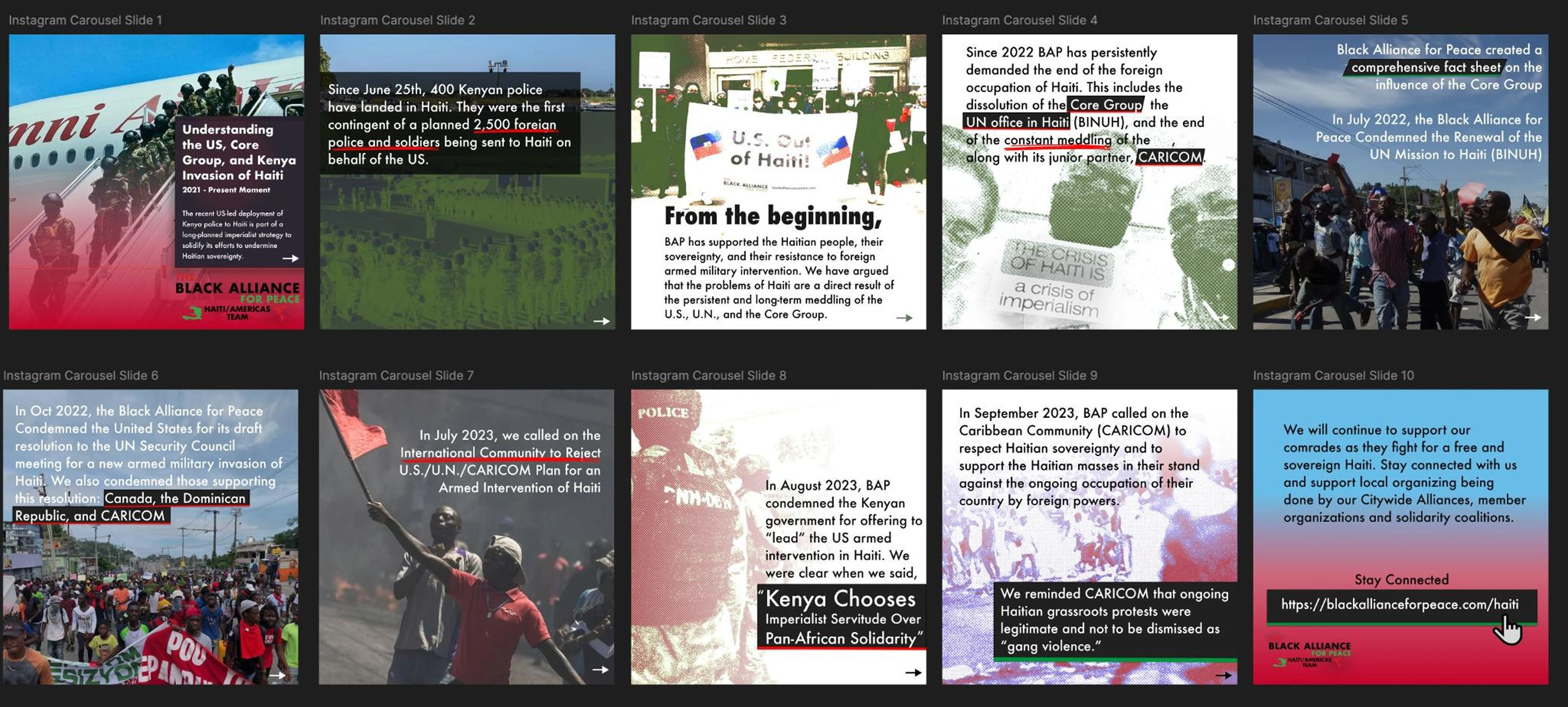 The carousel below builds on previous messaging by highlighting how racist narratives are used to justify foreign occupation in Haiti. Using historical clippings, protest images, and bold messaging, the design connects long-standing Western slander with modern political interference. It reframes the conversation from superficial outrage to systemic critique, calling out the real agents of destabilization.