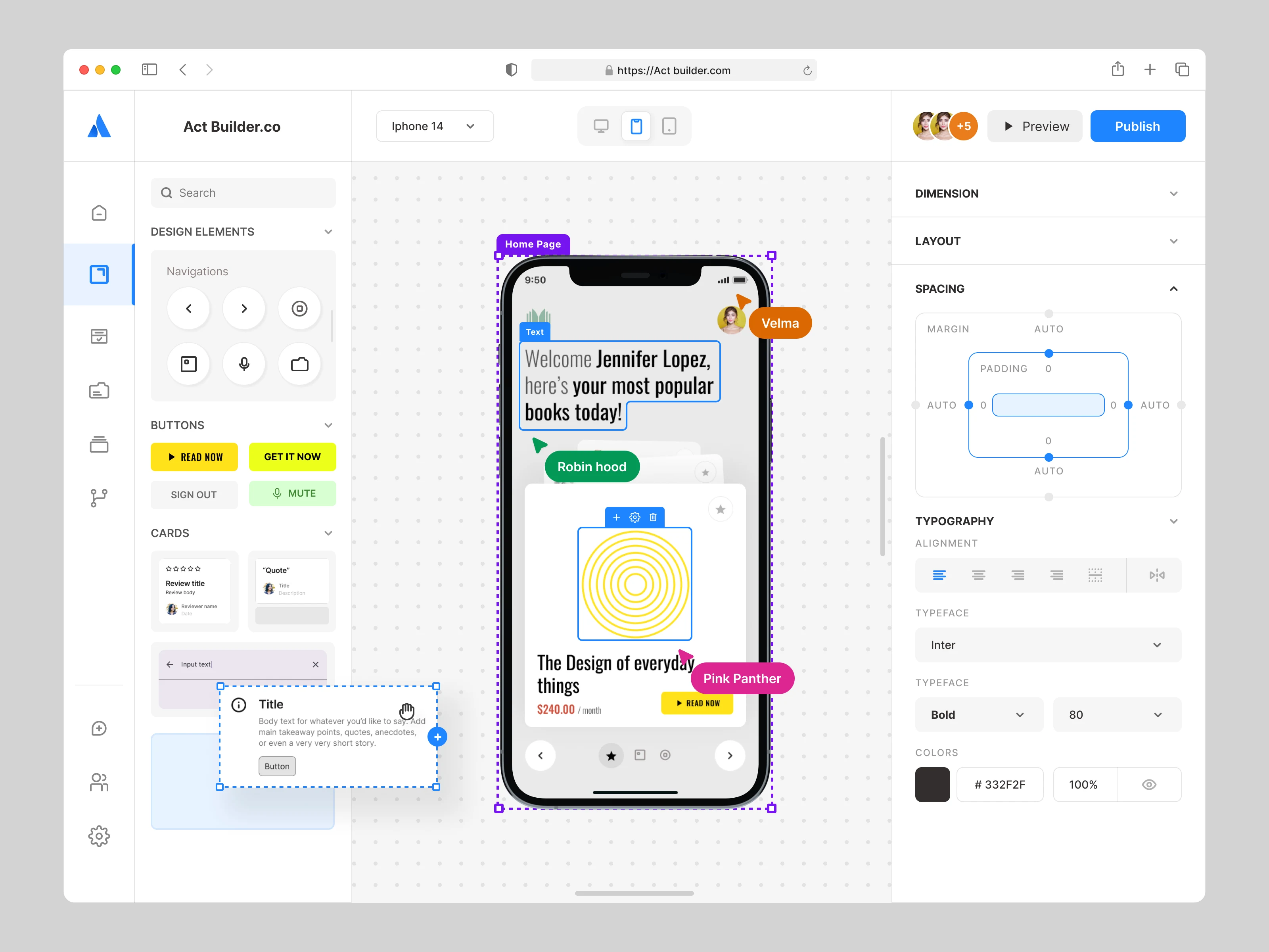• Editable text, buttons, and cards directly on the preview