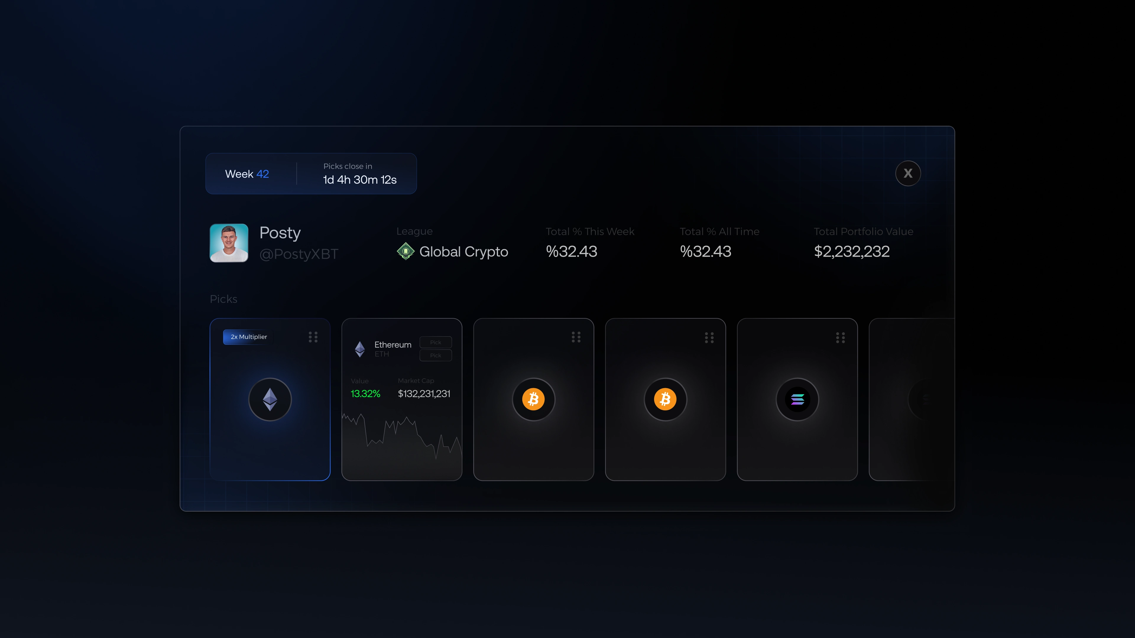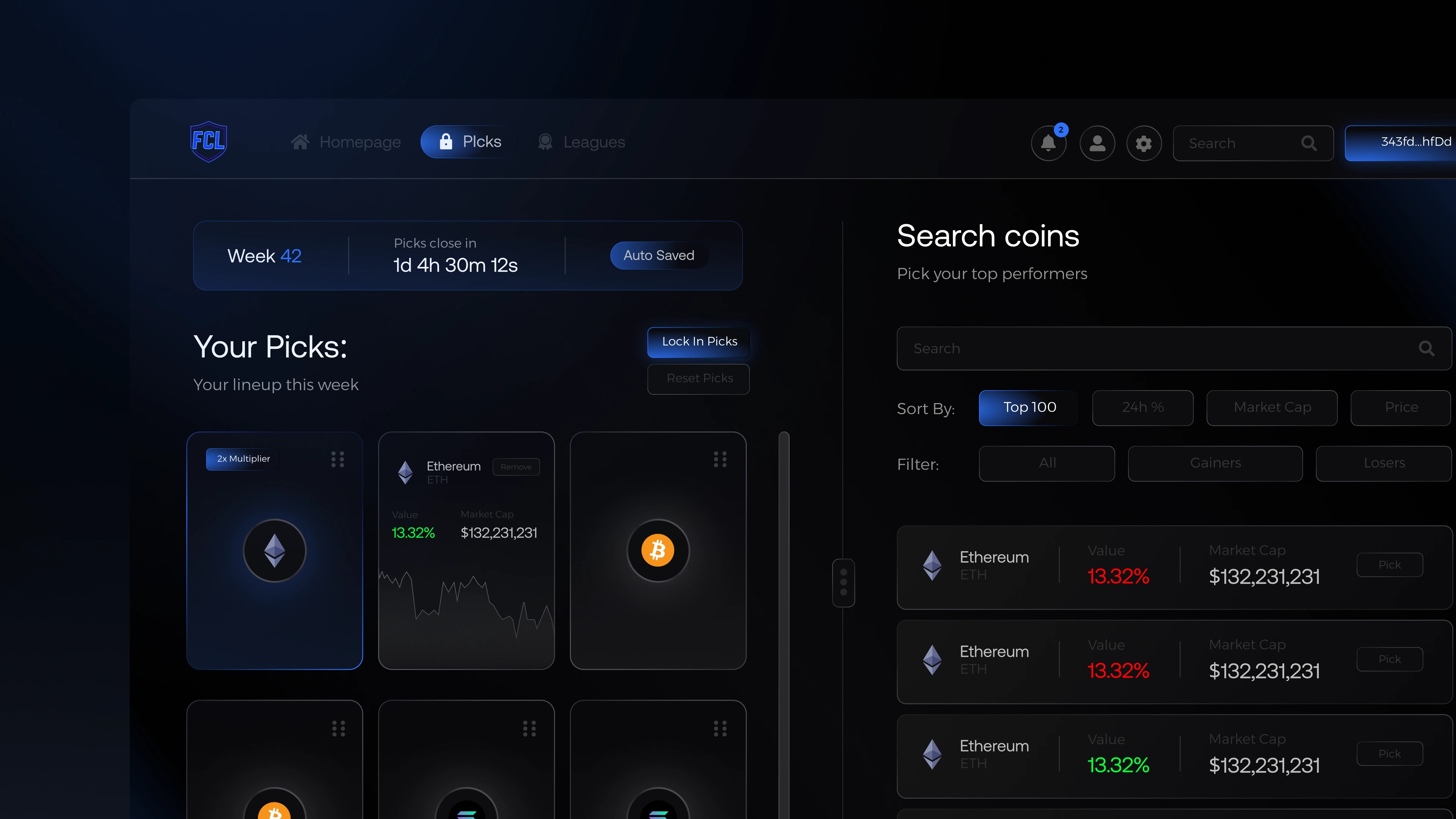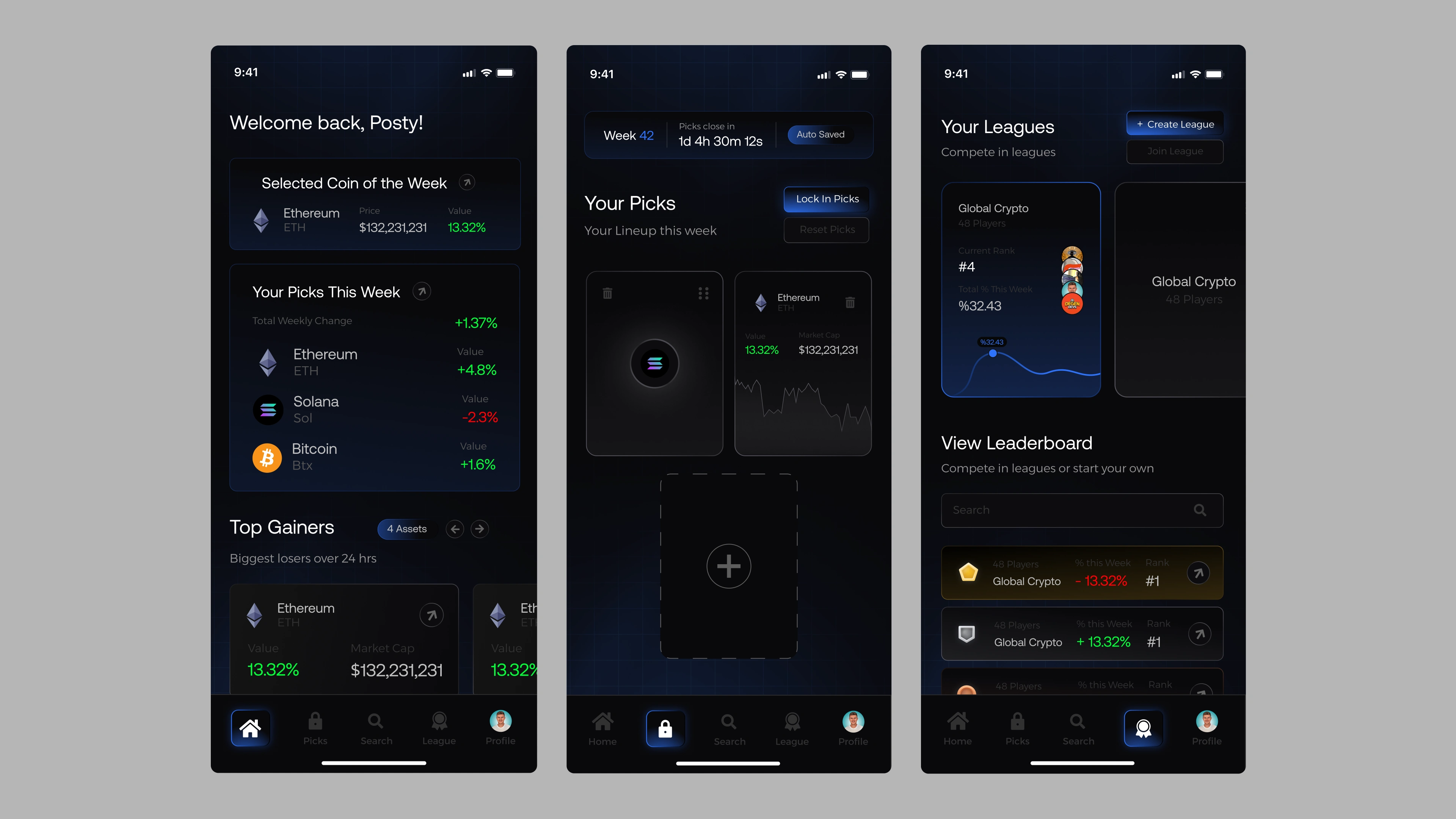 The challenge was designing a version 1 product that felt polished and launch-ready while capturing the high-energy, gamified experience users expect from a betting platform. I designed the full UI across web and mobile, building an interface that balanced a professional, techy aesthetic with the visual language of competitive gaming. The work covered core product flows including coin selection, leaderboards, and live market tracking, creating a cohesive experience that felt exciting to use without sacrificing clarity or trust.