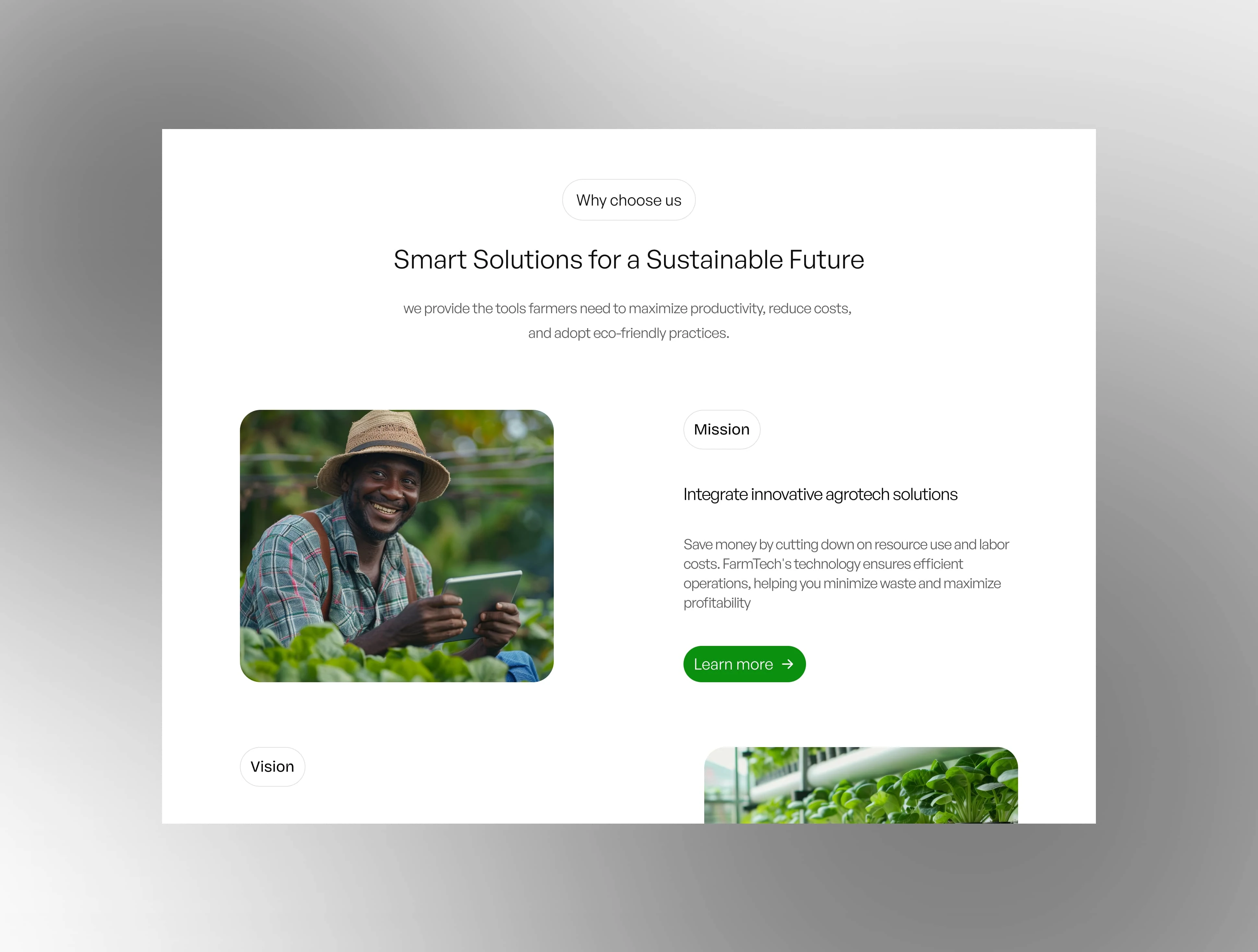 Designed a comprehensive, responsive website for a cutting-edge agricultural technology company focused on sustainable farming solutions.