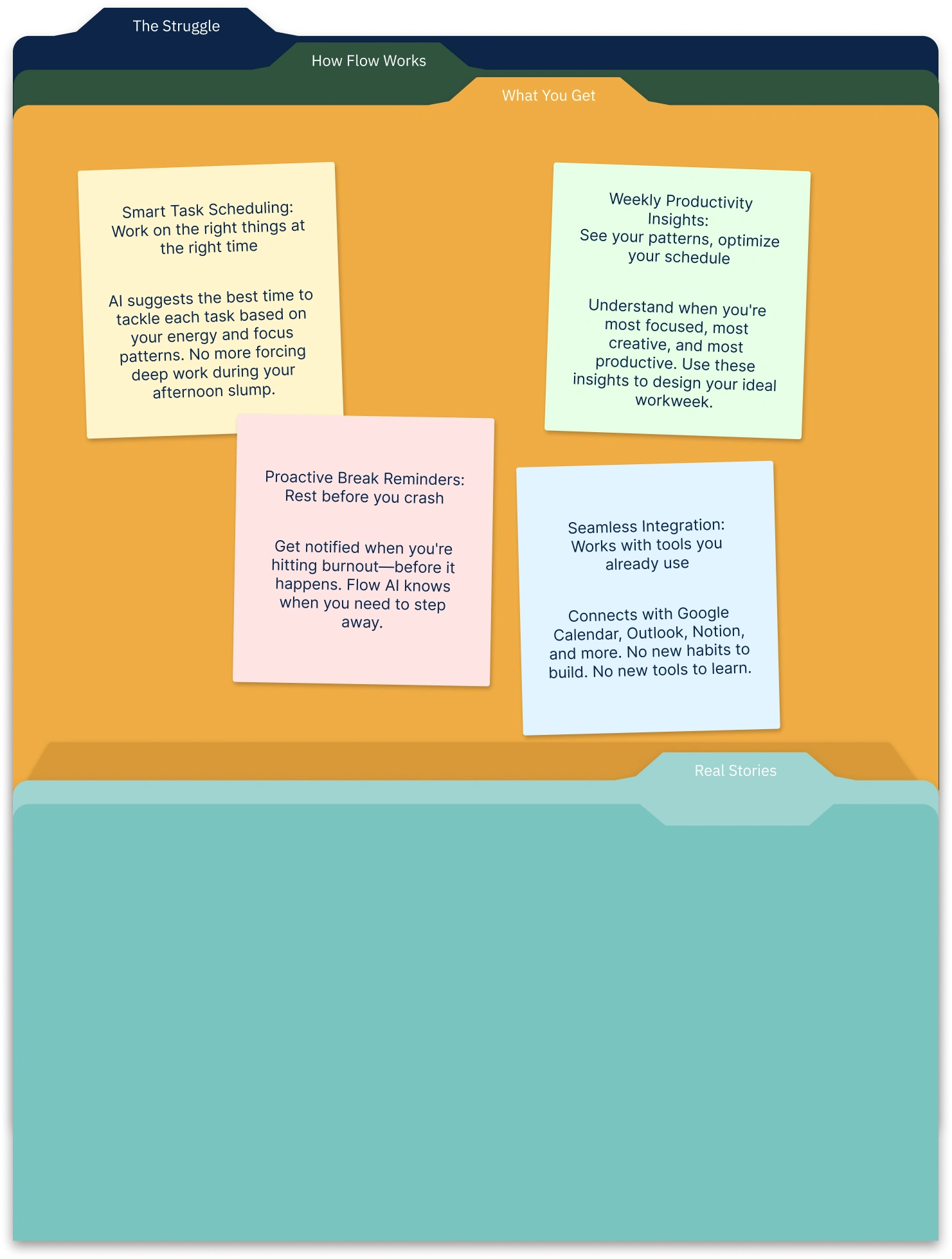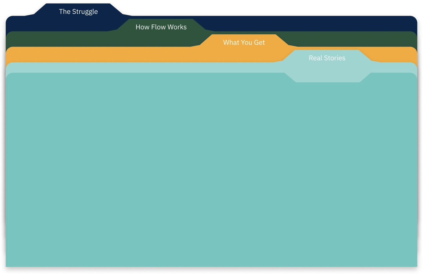 Instead of standard dividers or background color changes, each content section became a distinct "folder" with a labeled tab. The Struggle, How Flow Works, What You Get, Real Stories.