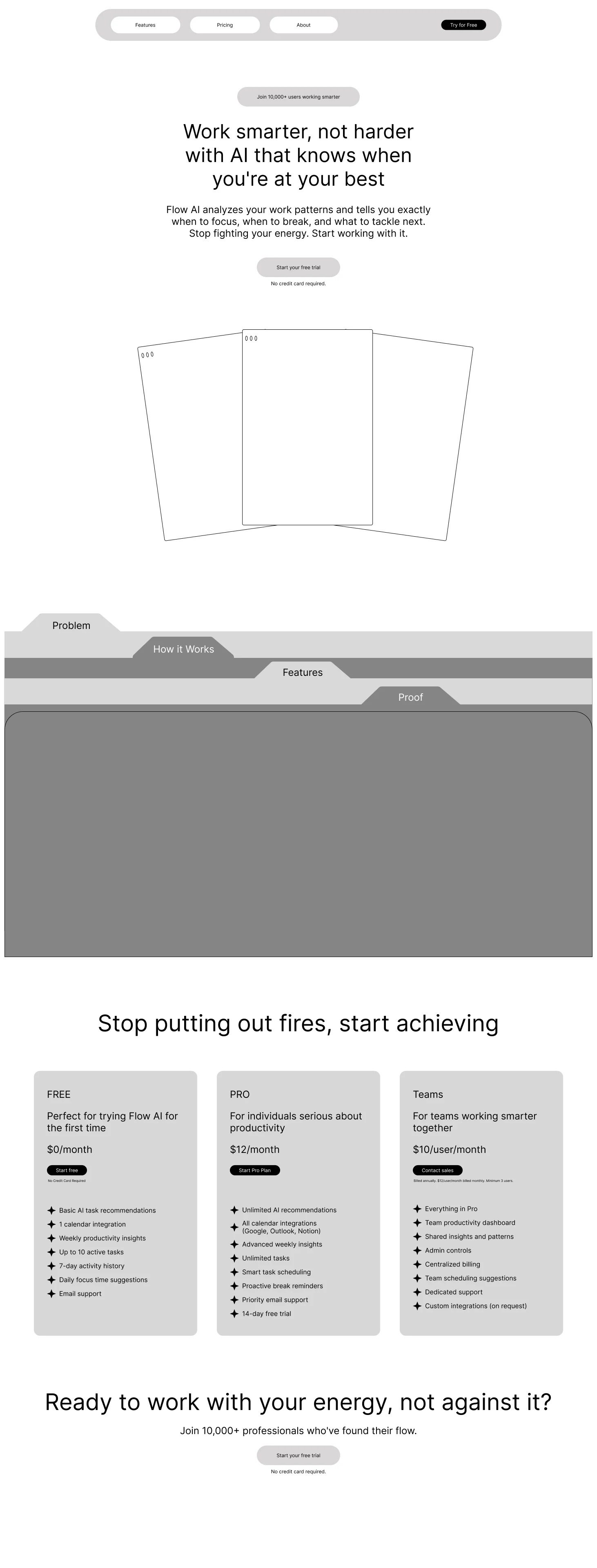 Flow AI is a fictional productivity app that helps users work with their natural energy rhythms. I designed a complete landing page that breaks away from standard SaaS templates through unique structural elements and tactile design details.