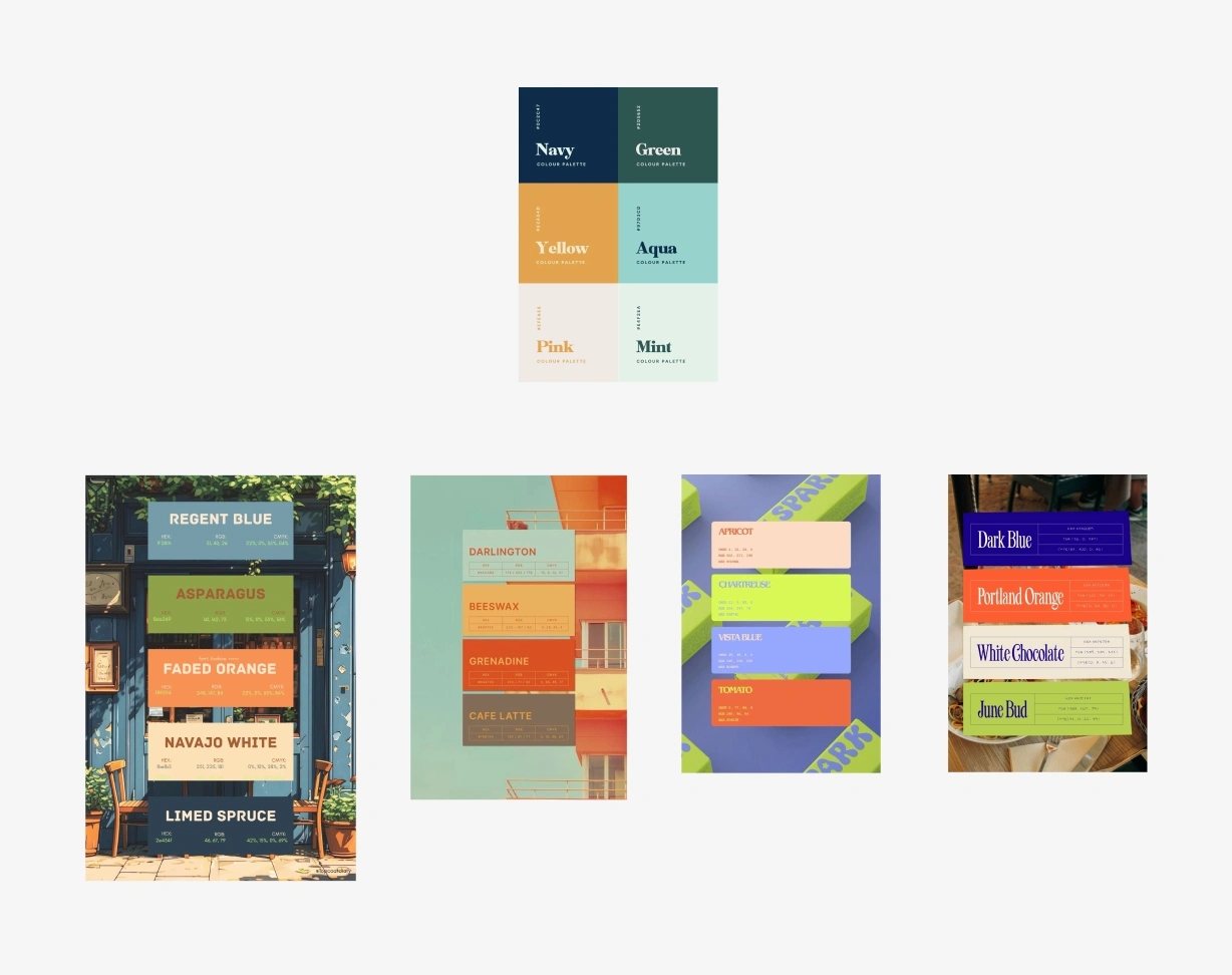 Pastel colors. Light yellow, pink, blue, and green outside the main palette. Soft enough to feel approachable, distinct enough to stand out.