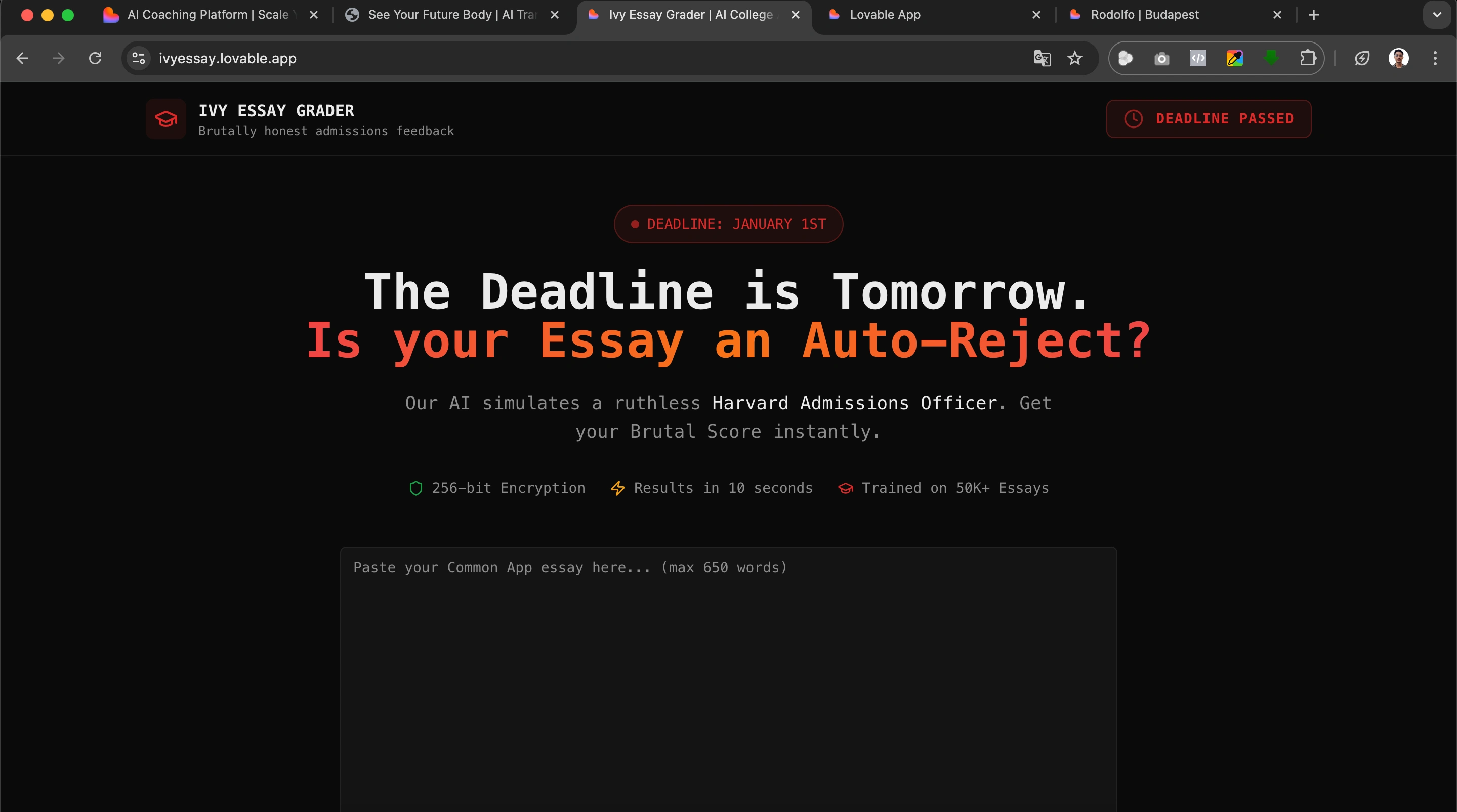 I developed an automated essay analysis tool using Lovable Cloud logic. The app provides a "roast" (critique) and a numerical rank for free, then utilizes a hard paywall for actionable improvement strategies.
