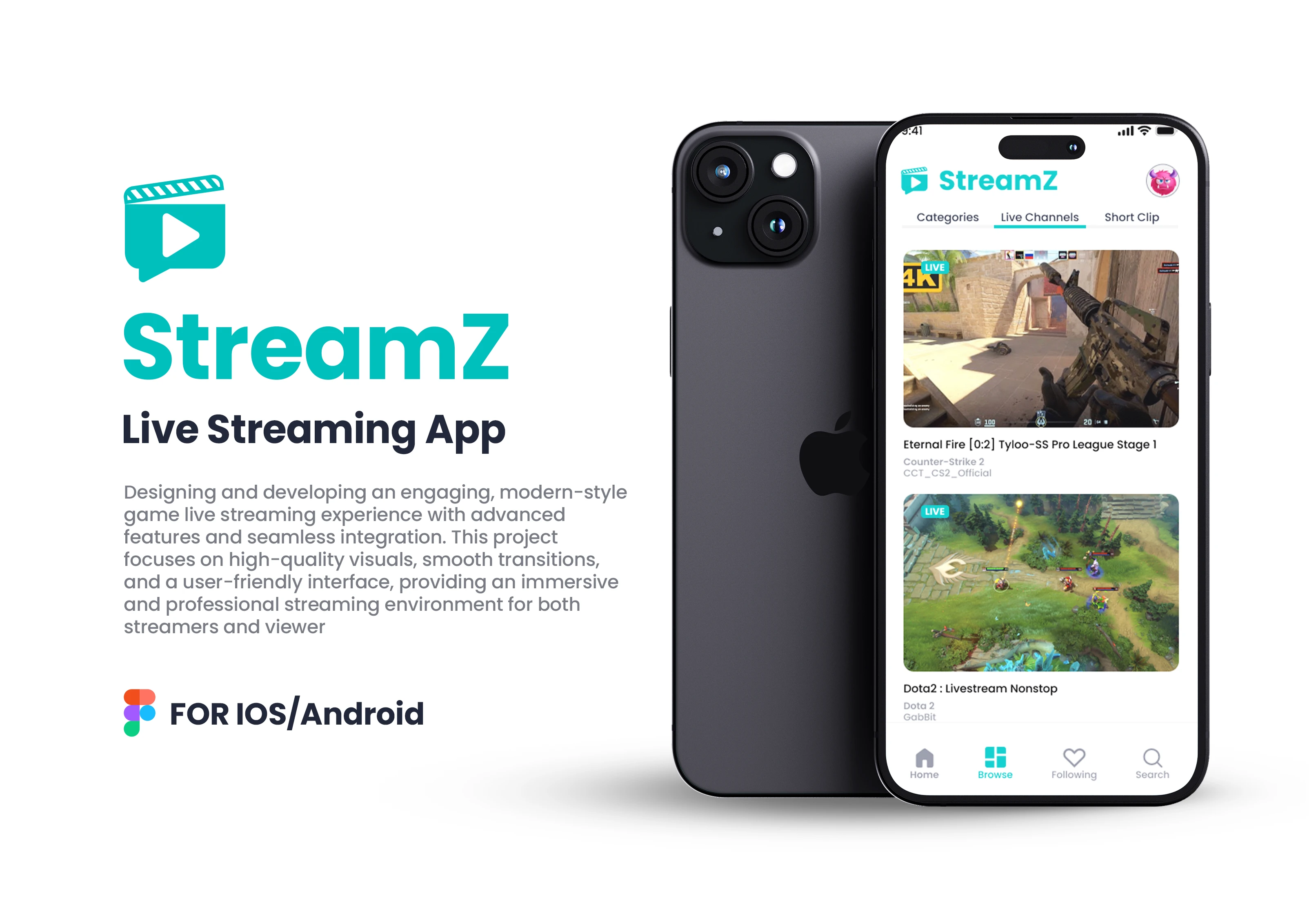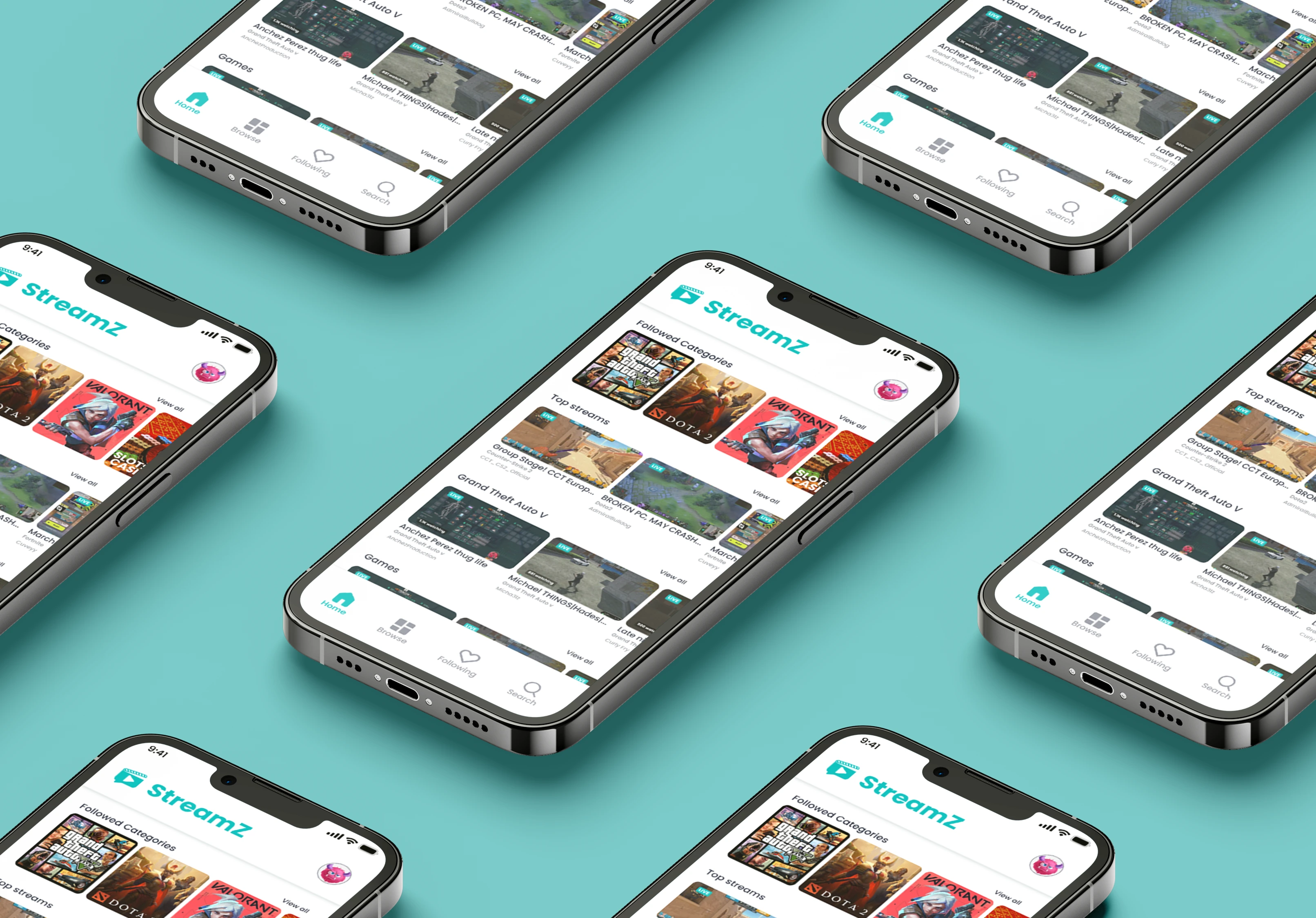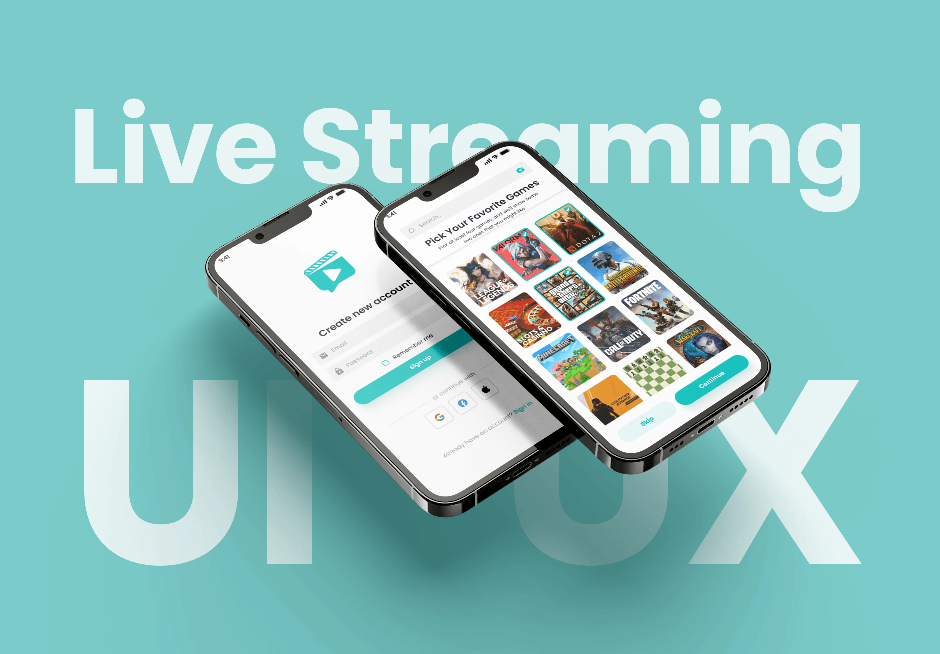 Live streaming and game streaming apps designed in Figma, with mockups created using Photoshop.