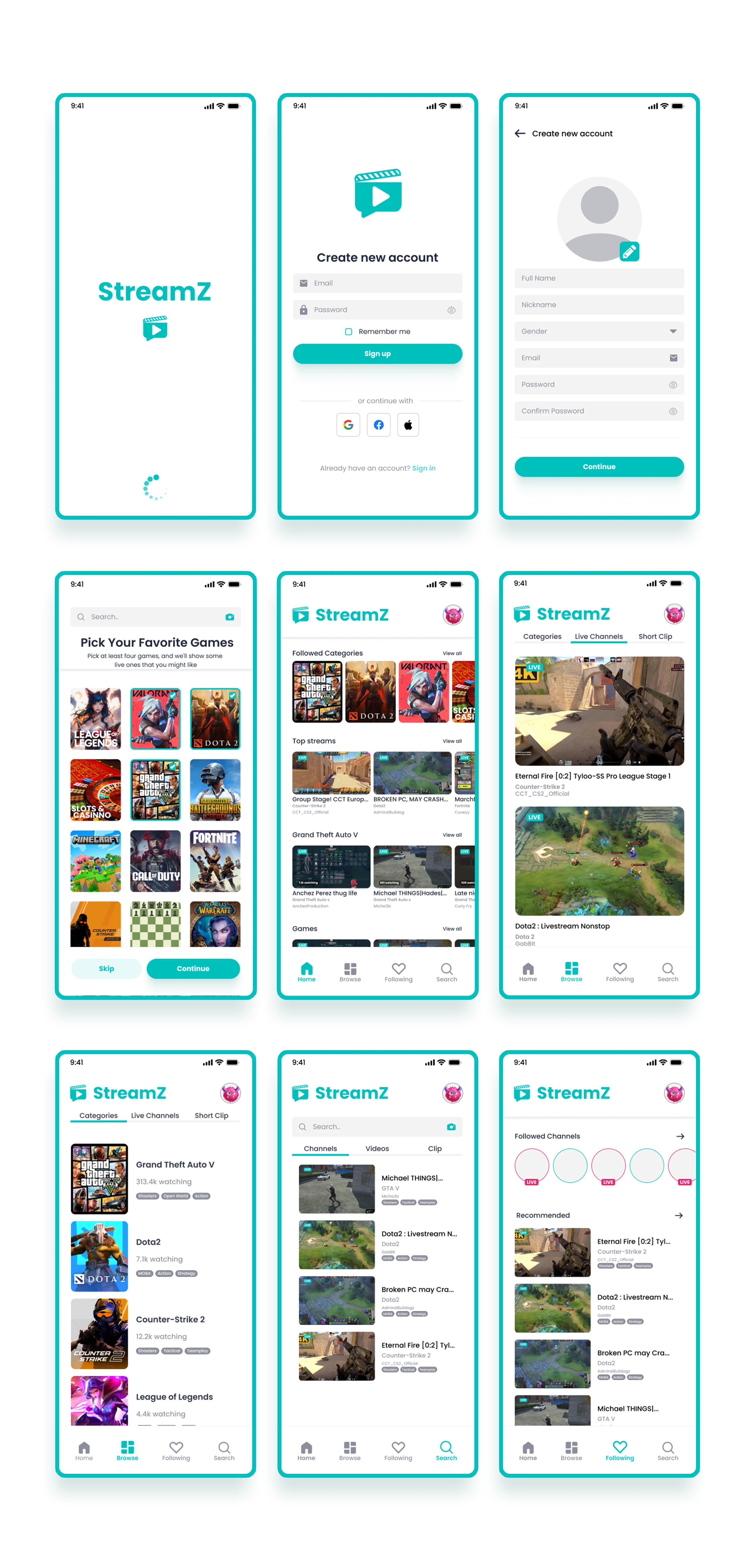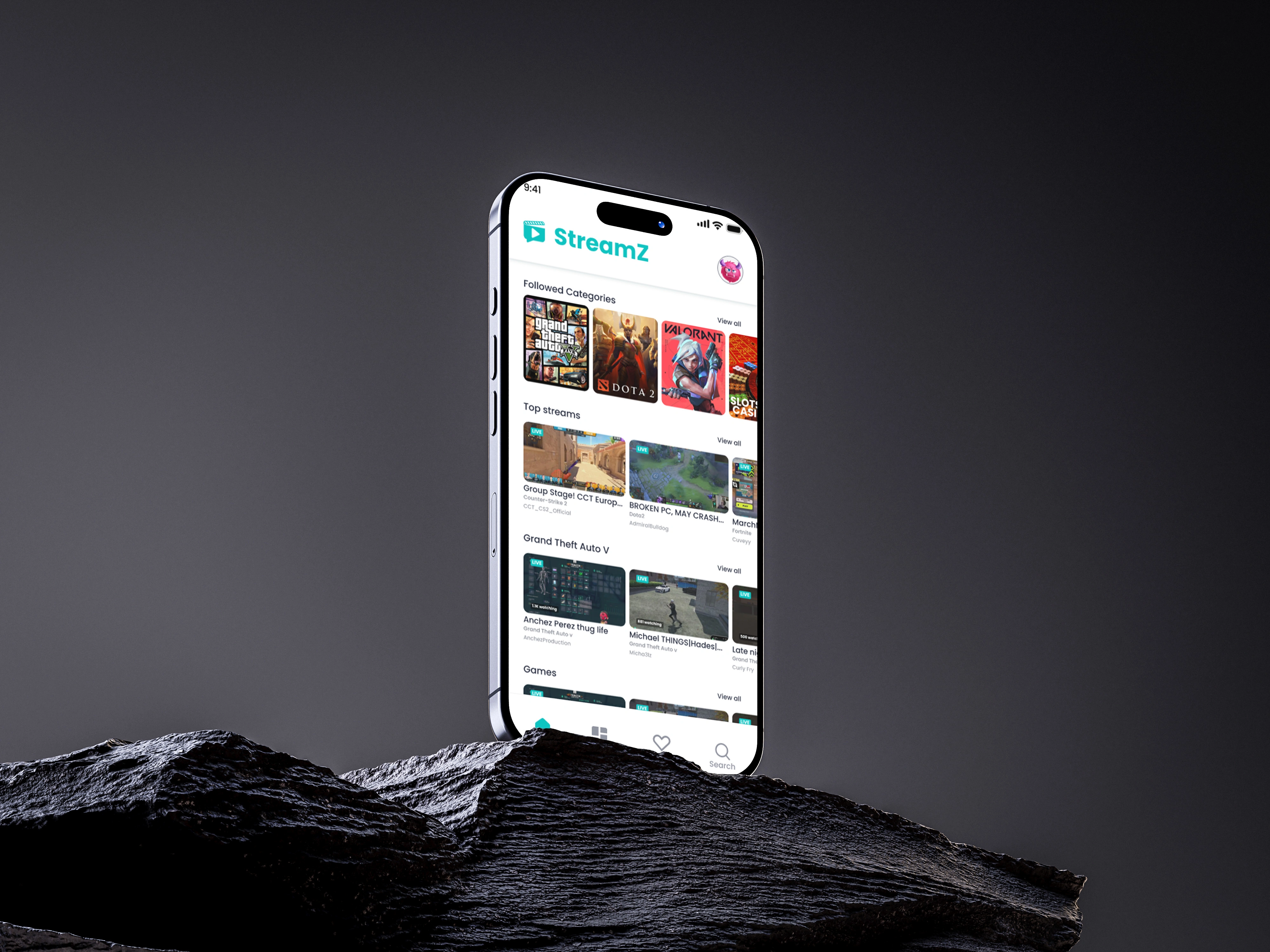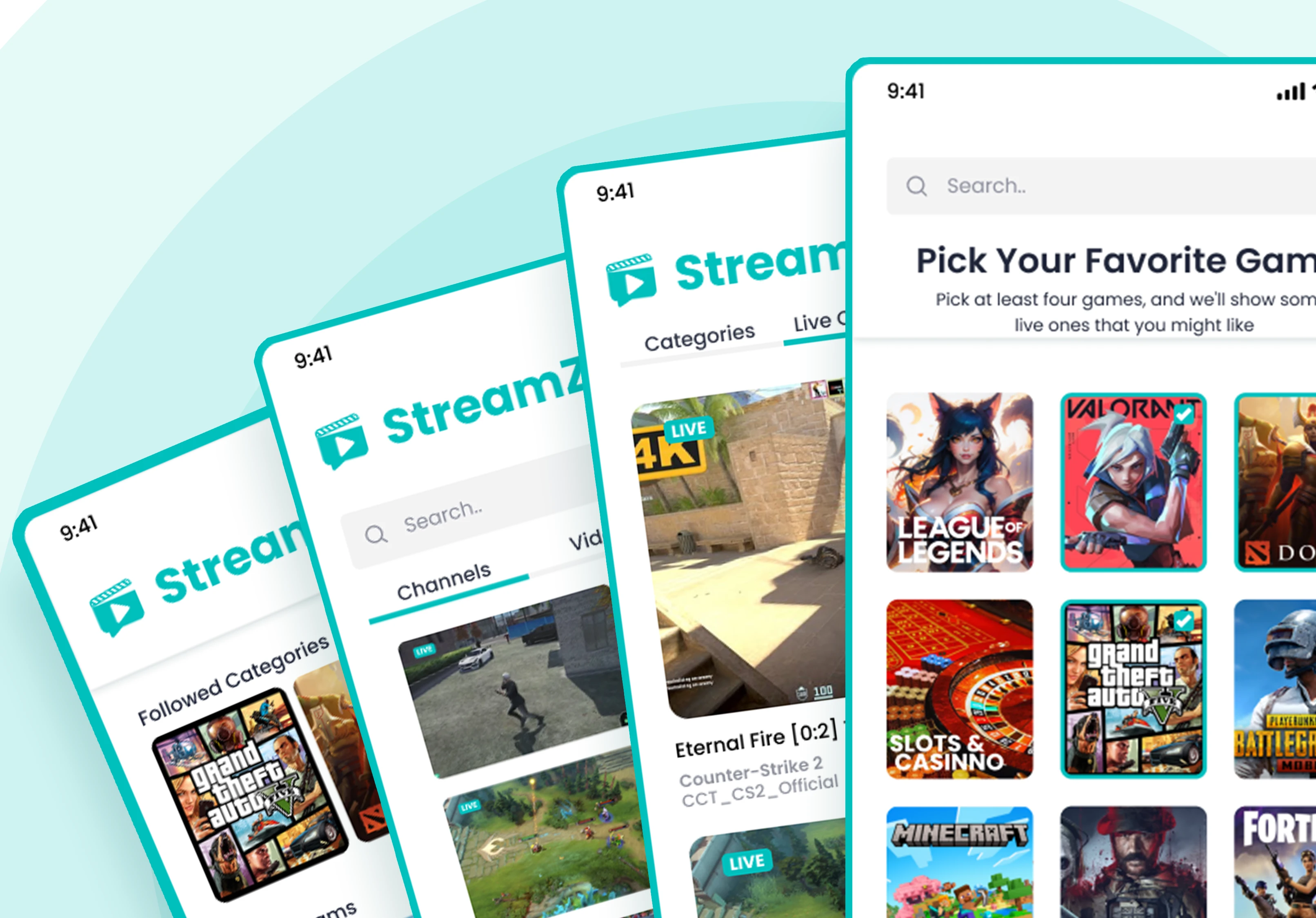 Live streaming and game streaming apps designed in Figma, with mockups created using Photoshop.