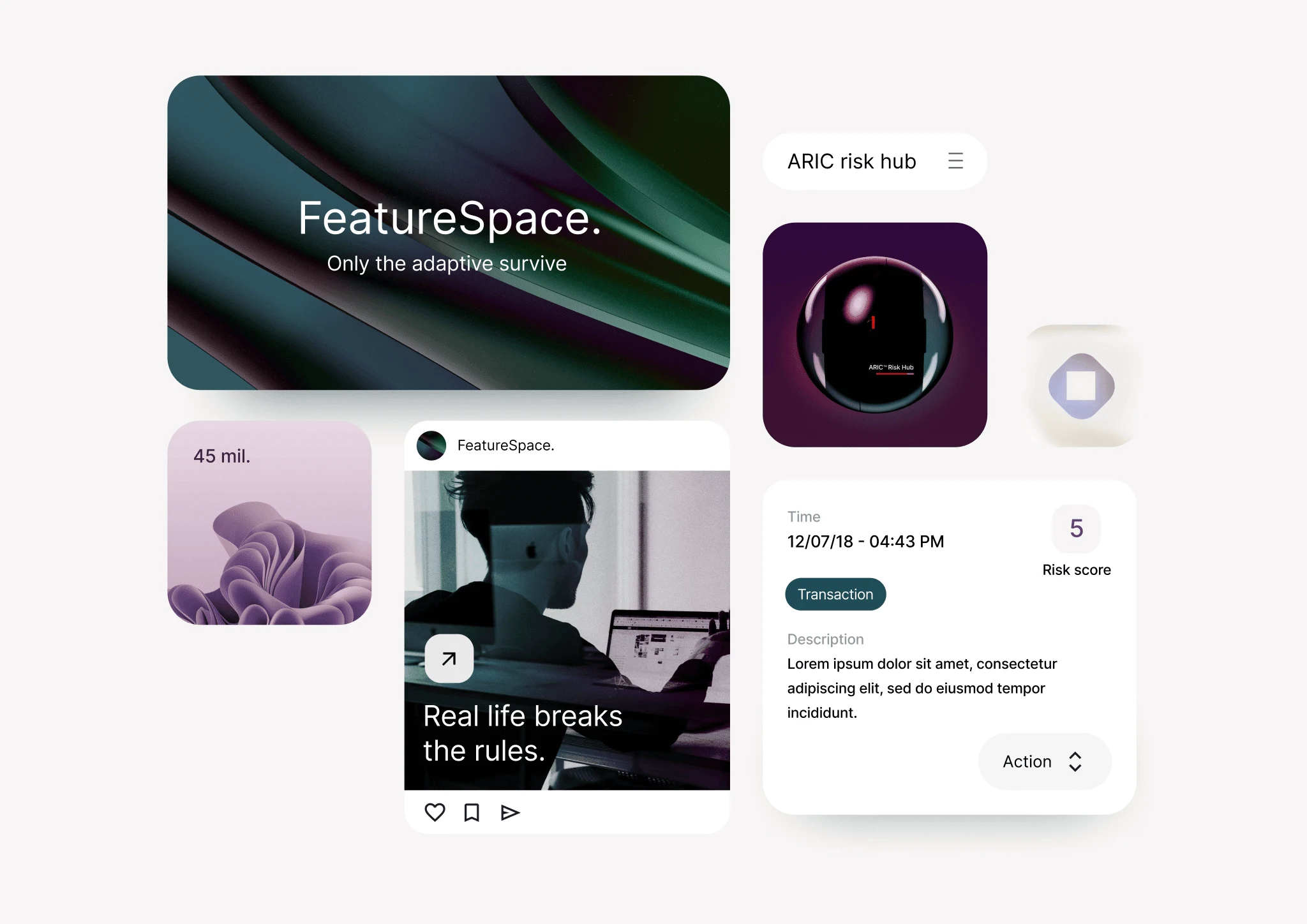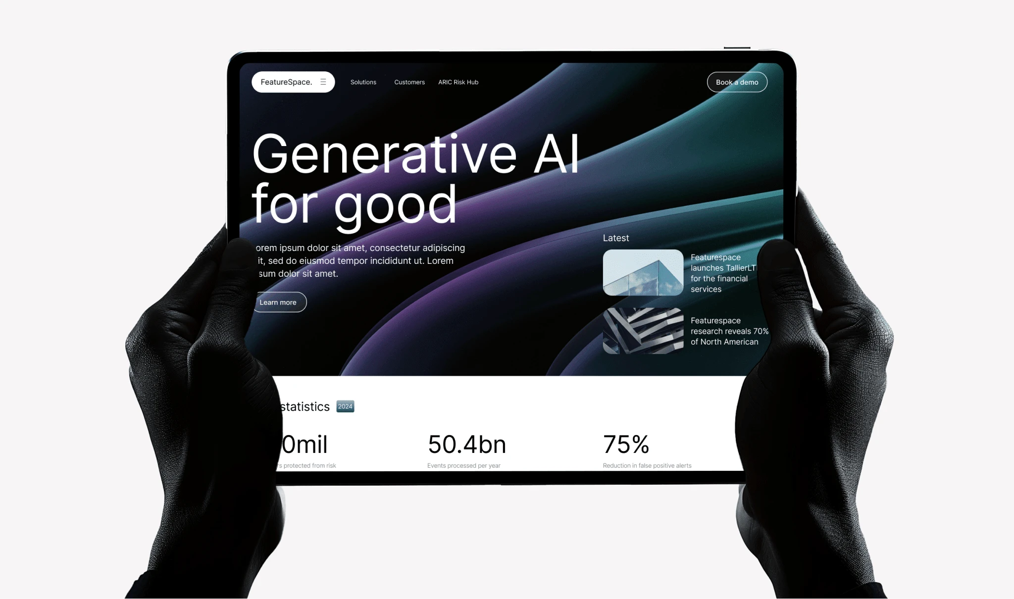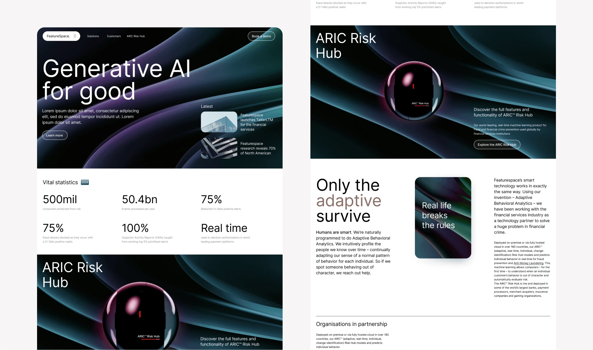Ideating on a brand direction for FeatureSpace, I created brand boards, logo, typography, colour palettes, photo treatments, web layouts and dashboard designs.