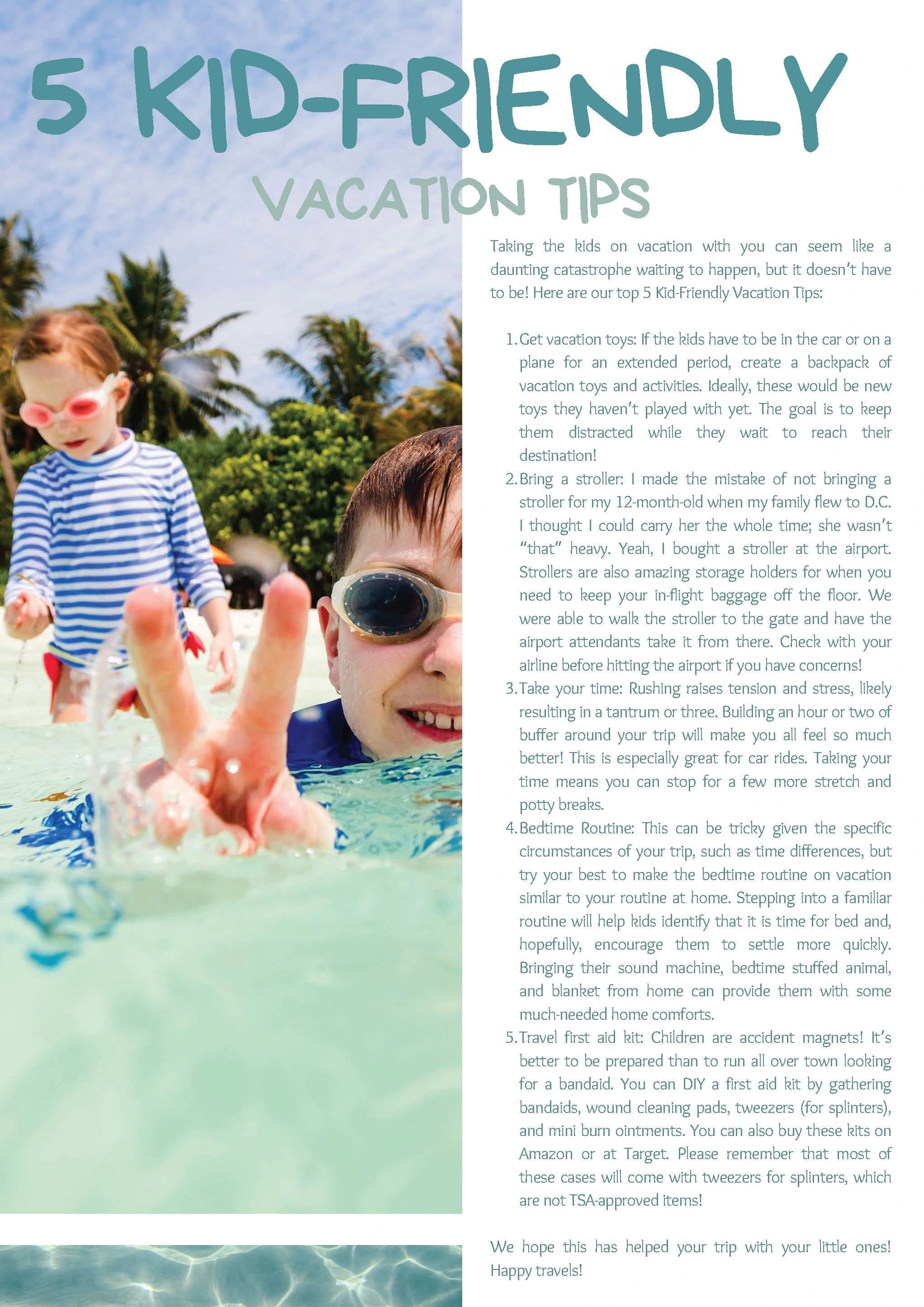 Family-focused blog article offering five practical vacation tips for traveling with young kids—written in a fun, helpful, and mom-to-mom tone!