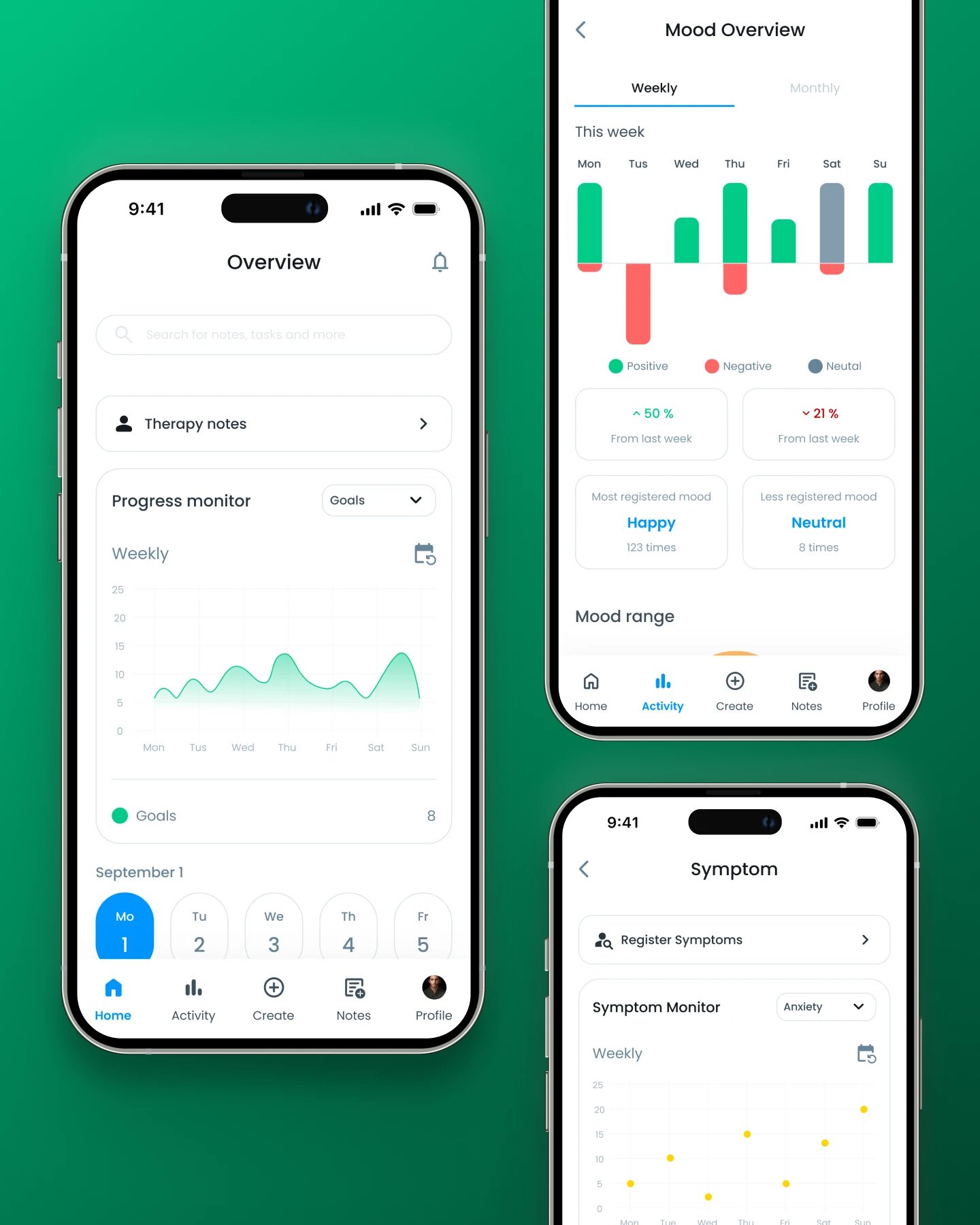 Patients often lose track of their therapy process. The app needed to centralize notes, goals, and progress tools in one space while staying simple and emotionally comforting to use daily.